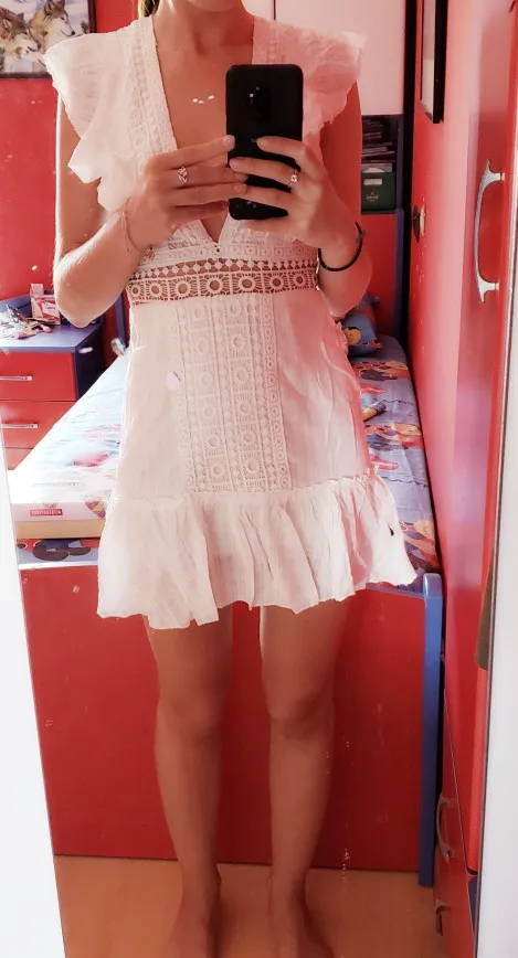 Delivery in 15 days, dress of good quality, opaque and consistent with the photos. Size very good. The only small defect is that it is very short so you have to wear it with a mini shorts.