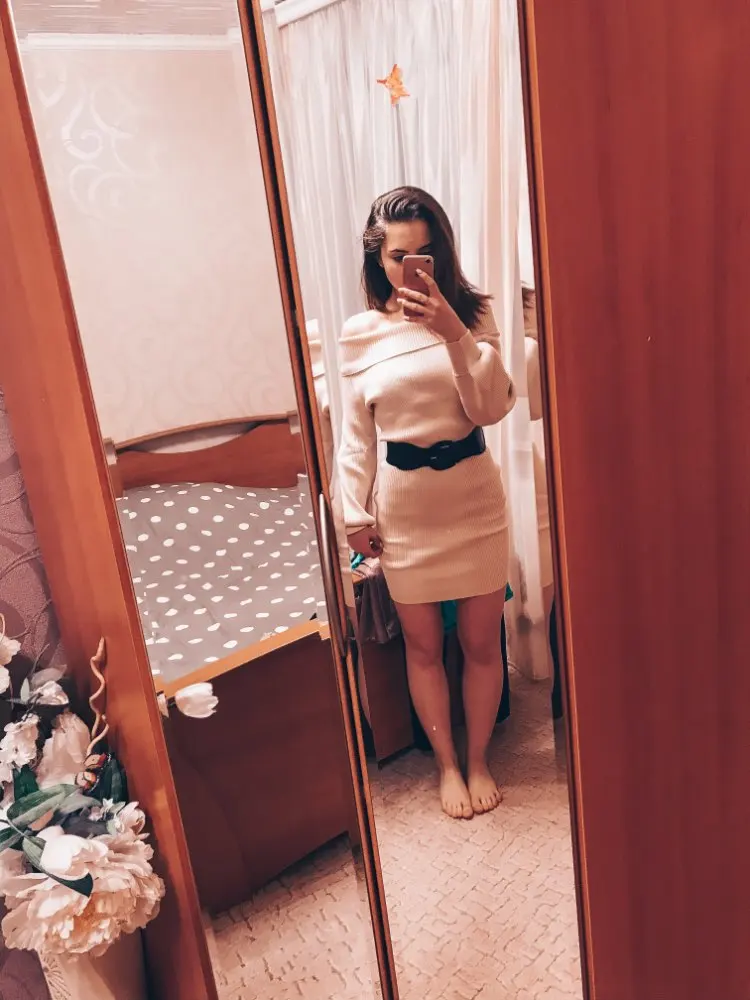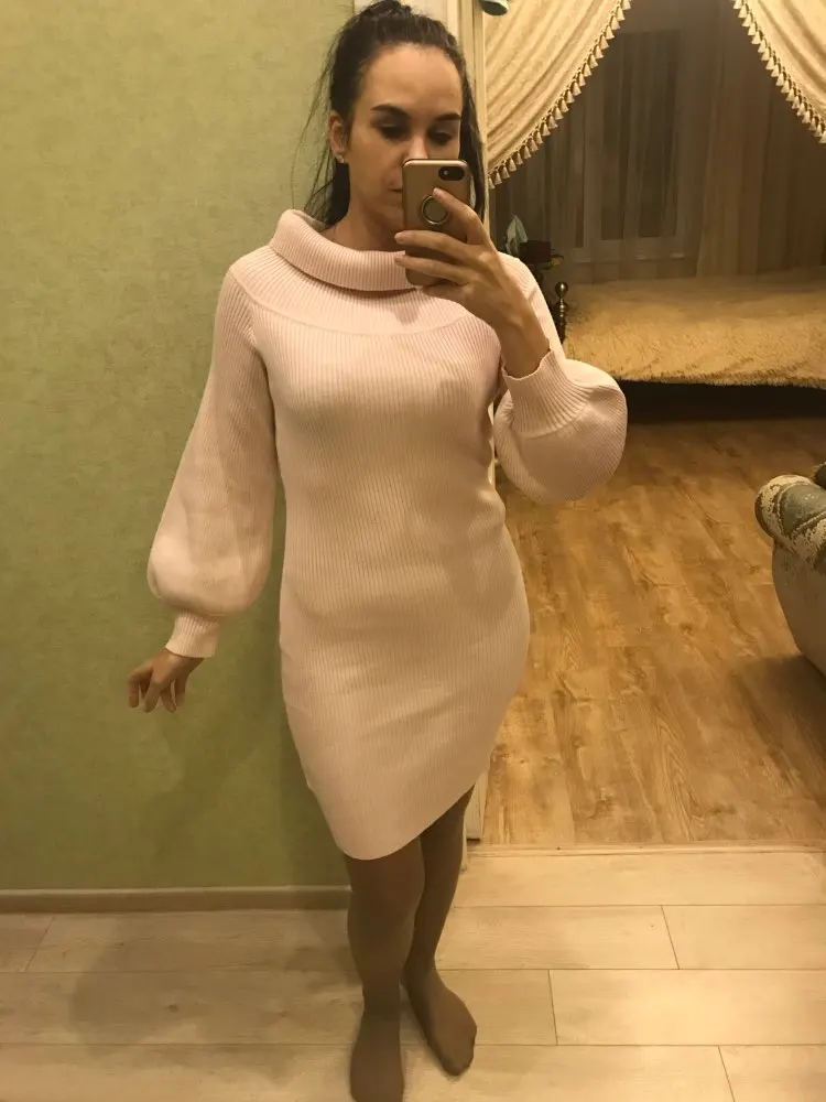 Excellent dress, delivery 20 days. The material is warm and mygenky, for the spring autumn is excellent). The seams are even, there are no extra threads. On the height of 167 to the middle of the thigh. Chest 90, waist 70, hips 96 village well, but the collar all the time strives to turn around)) and panties need seamless). The color is gentle as in the photo. Recommend product and store)