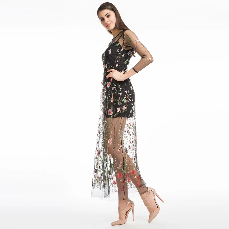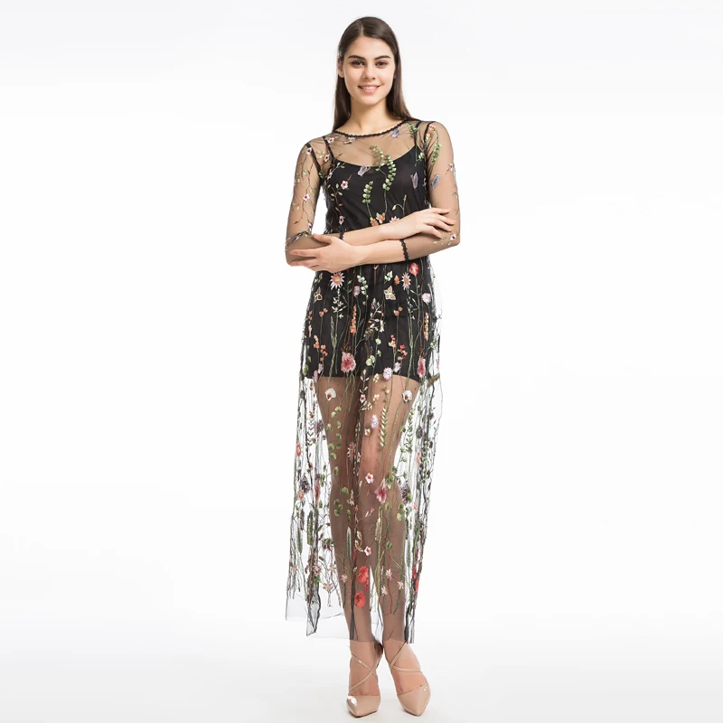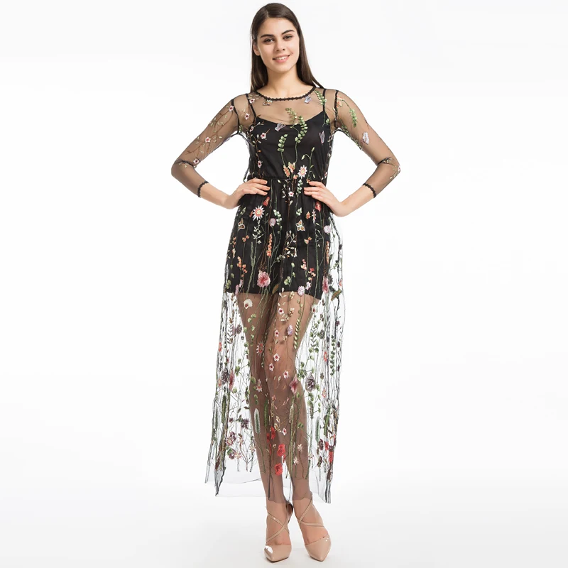 FREE SHIPPING Embroidery Flower Two Piece Mesh Dress JKP13415