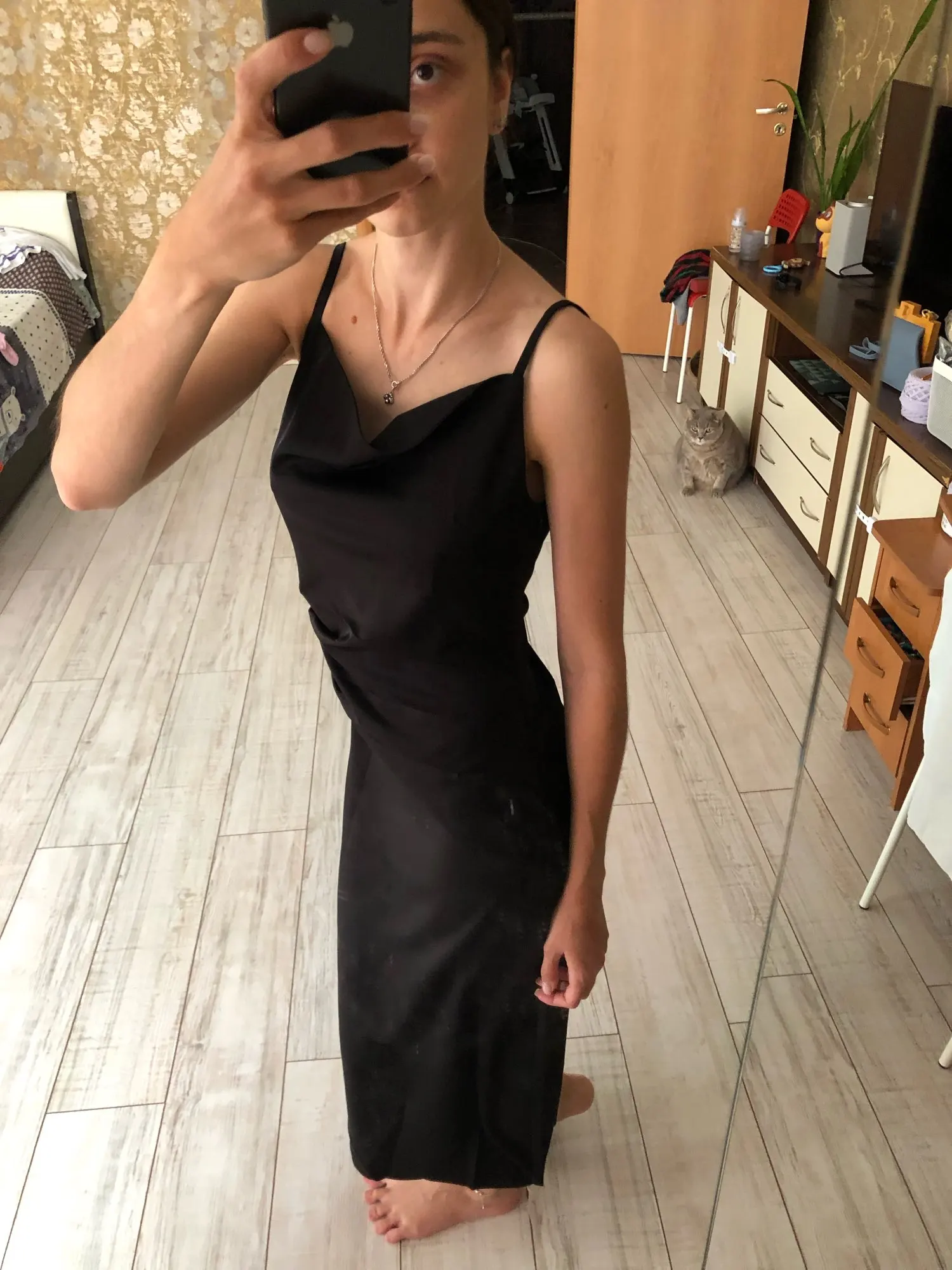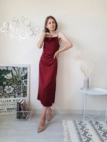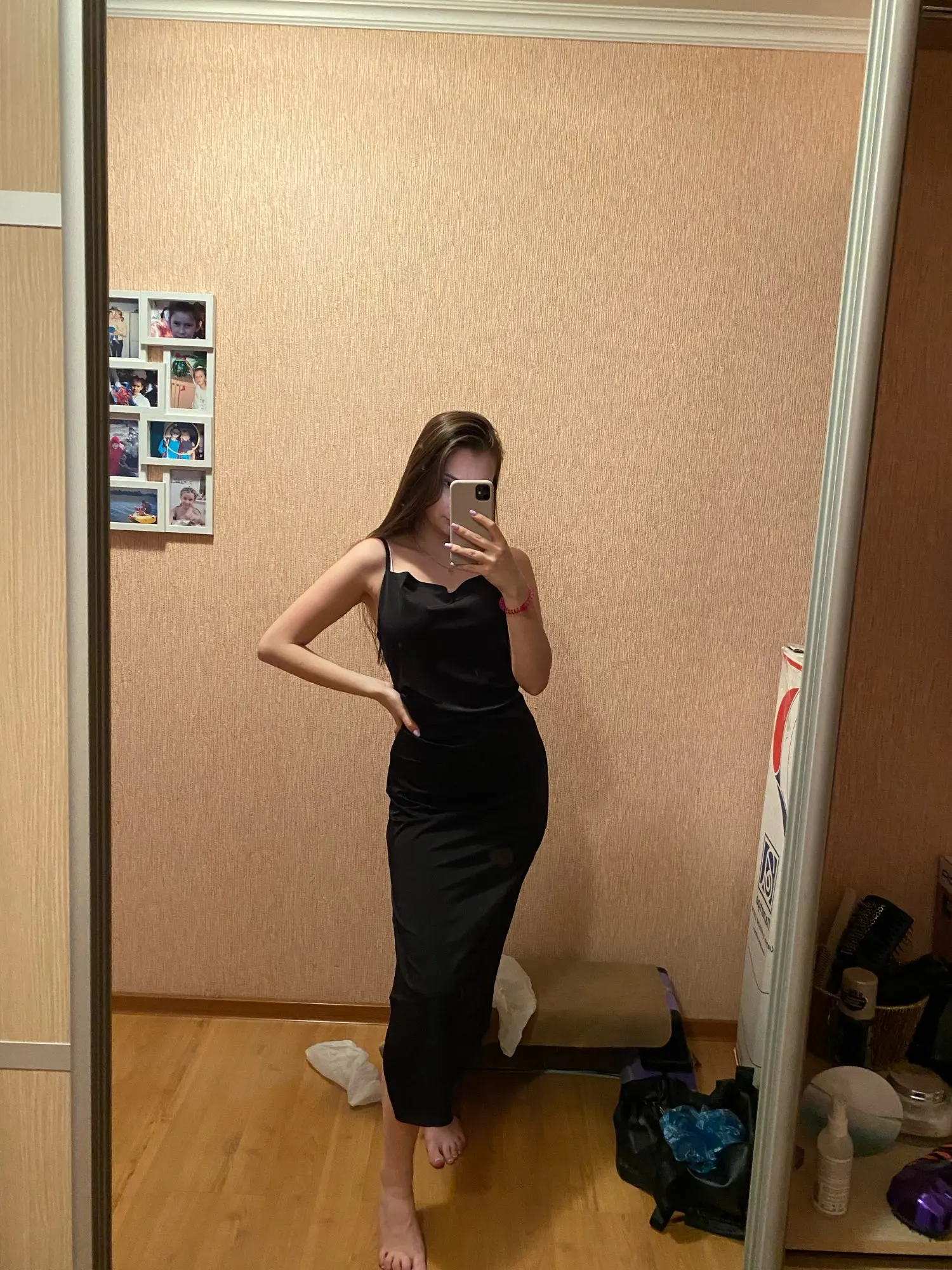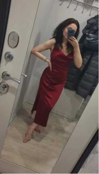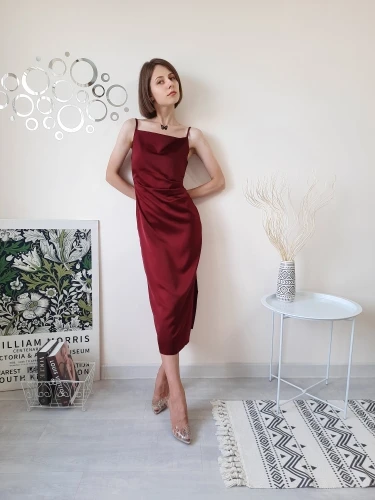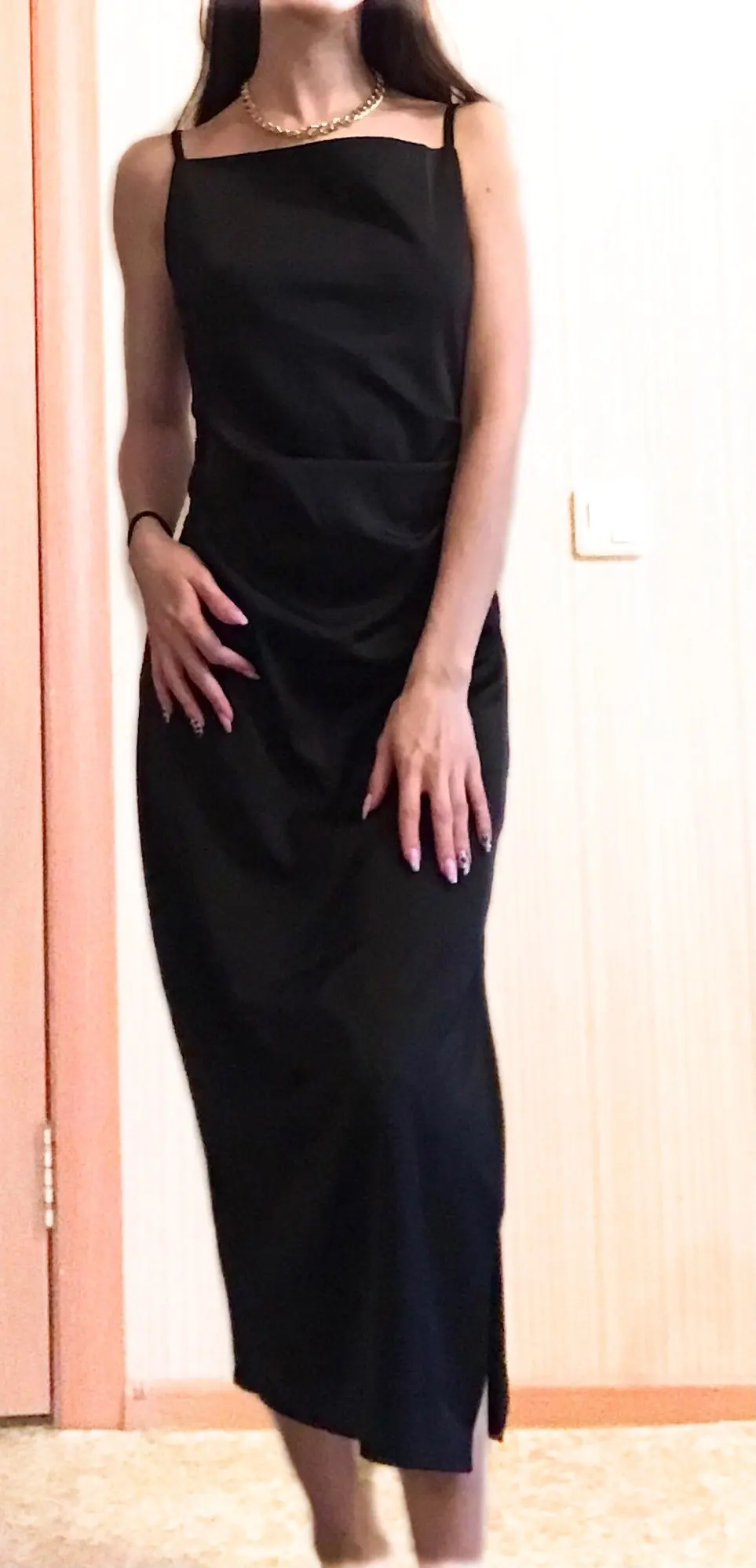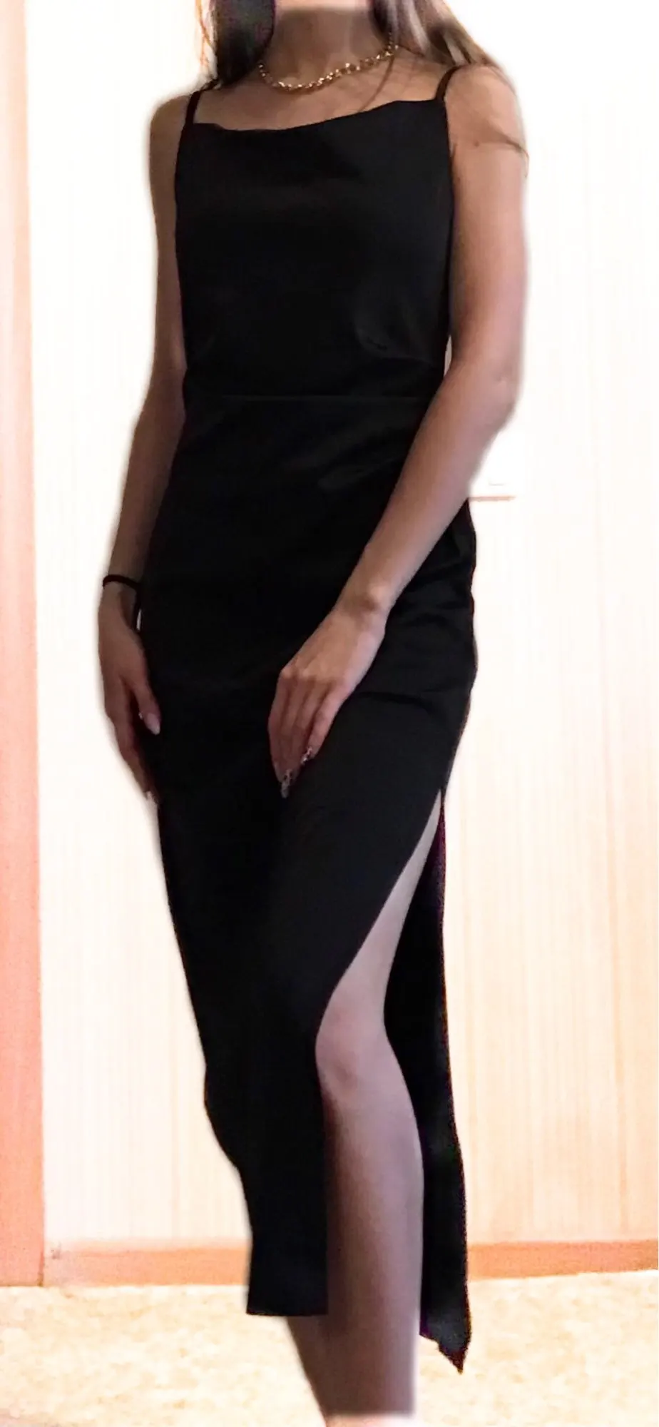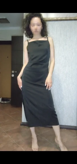 Elegant satin dress with straps I took it in Bordeaux color and XS size. Color saturated, deep, dear. There is also a more usual, black color. The size of me, in general, approached, except that it is slightly large in the waist and hips. On a more figure girl with a small breast will sit even better. The fabric is good, not too thin. Straps are adjustable. Side sewn zipper. The cut on the leg is not too frank. I can safely recommend