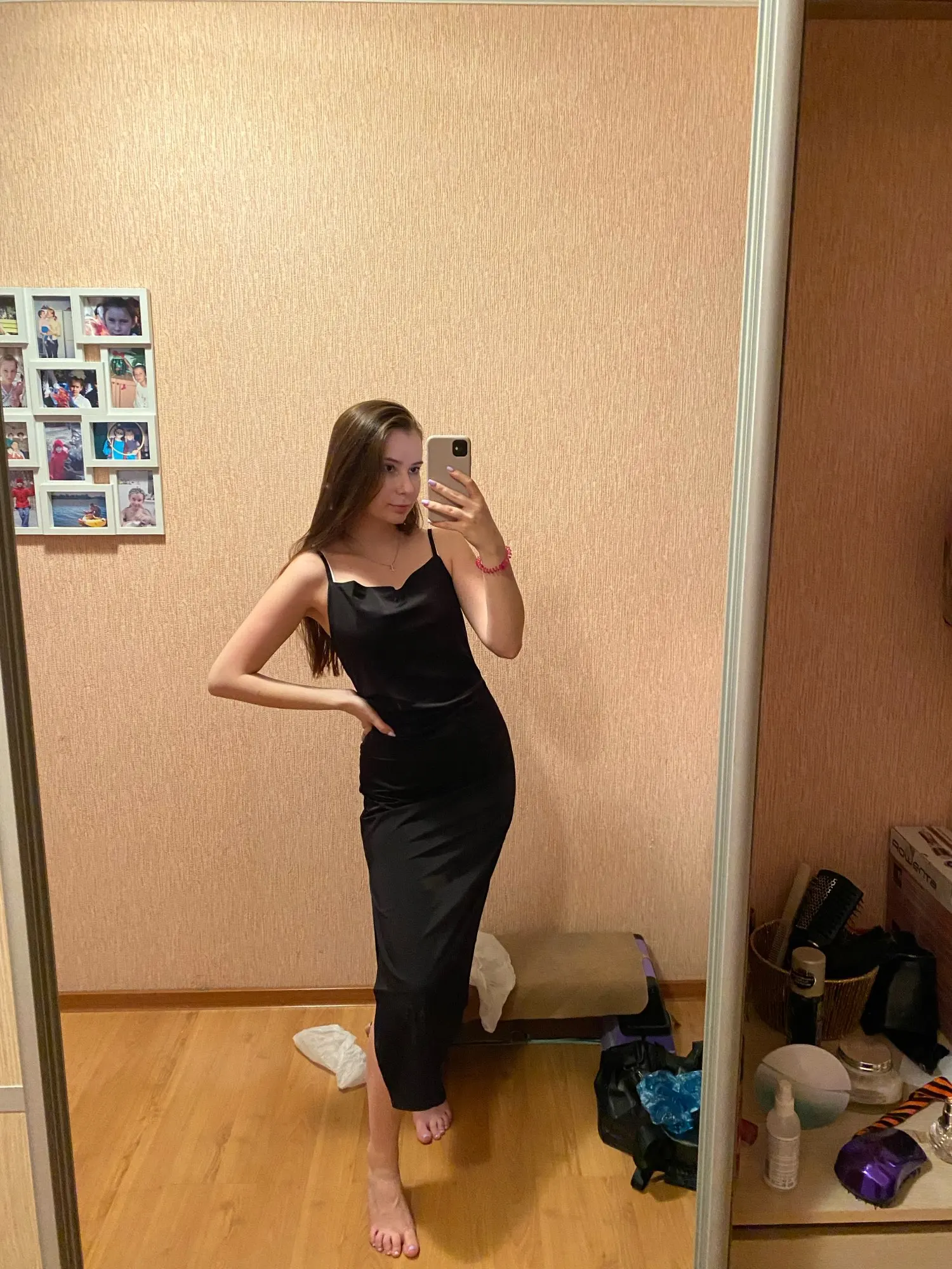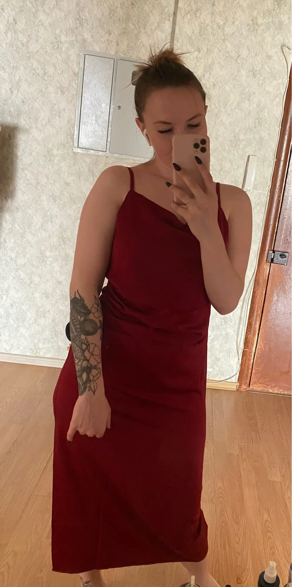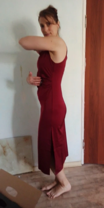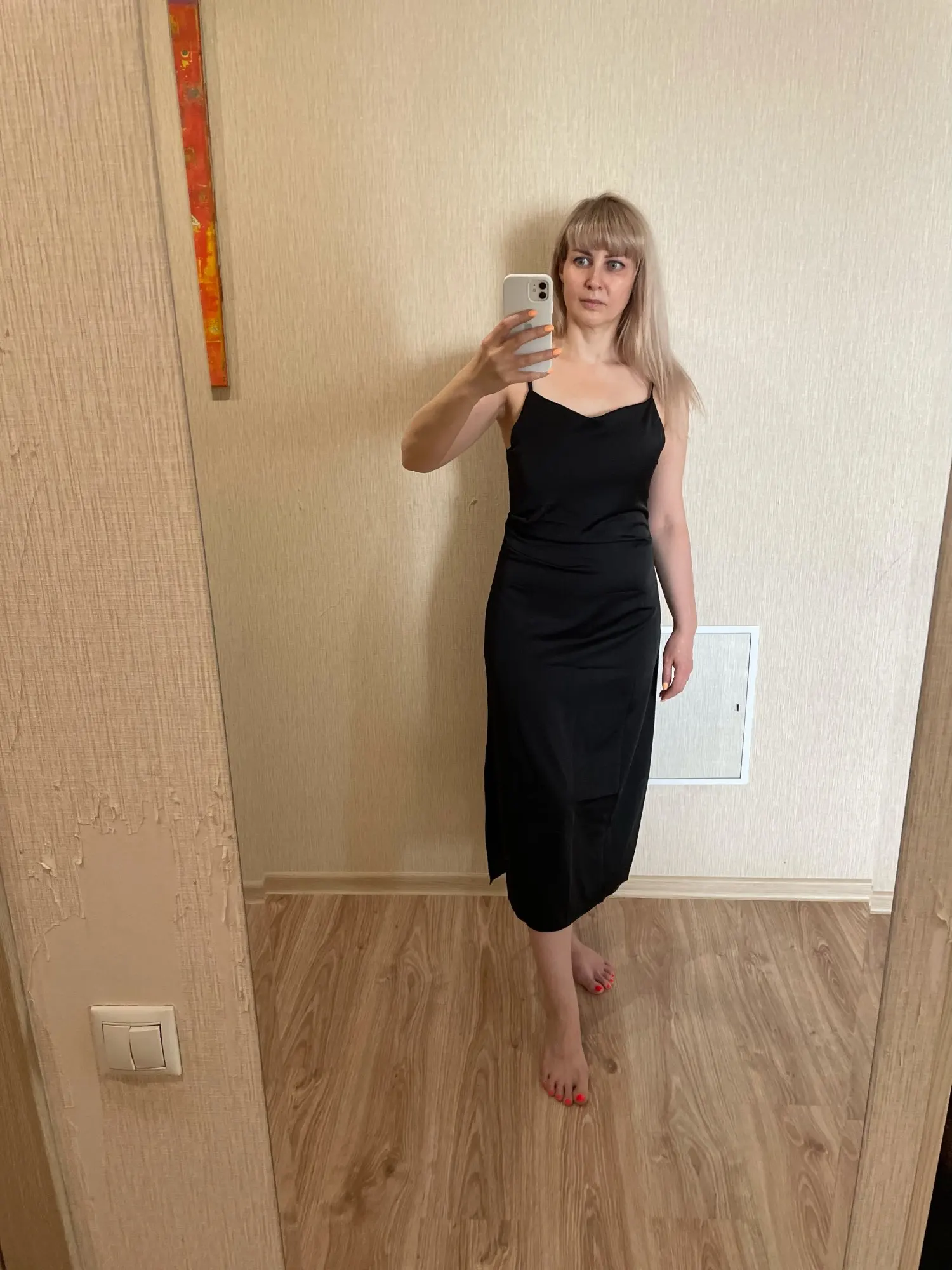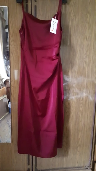 Elegant satin dress with straps I took it in Bordeaux color and XS size. Color saturated, deep, dear. There is also a more usual, black color. The size of me, in general, approached, except that it is slightly large in the waist and hips. On a more figure girl with a small breast will sit even better. The fabric is good, not too thin. Straps are adjustable. Side sewn zipper. The cut on the leg is not too frank. I can safely recommend