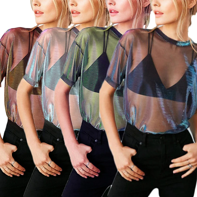 FREE SHIPPING Fashion 2019 Tshirt Mesh Sparkly Short Sleeves JKP1390