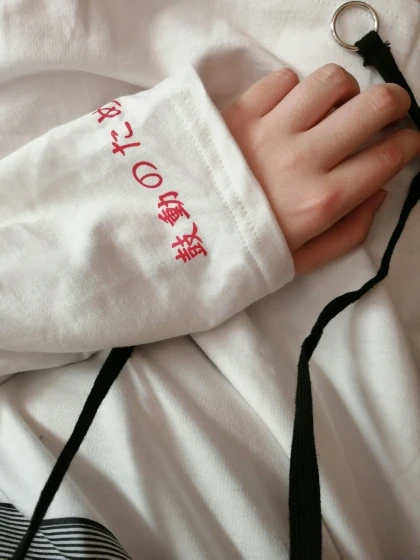 Really liked the product, a few loose threads but those were easily trimmed away! I'm glad I went with white as I really like how it looks! I didn't actually realise it was a hoodie, I thought it was just a shirt so that was a pleasant surprise, I like how it looks with the hood down most. It is very short but I was expecting it to be so I'm very happy with it overall!
