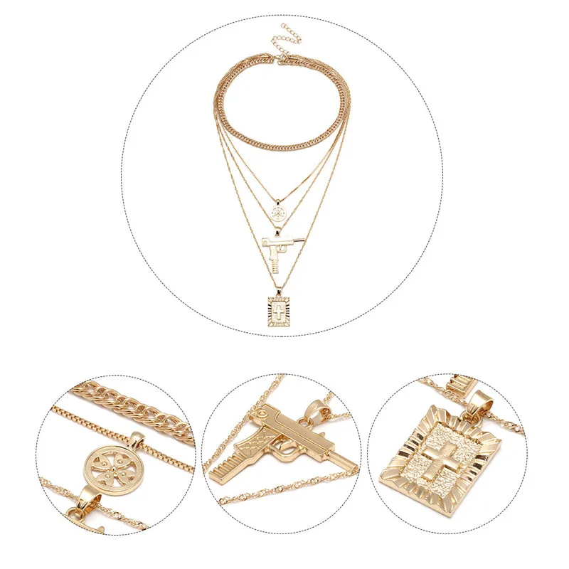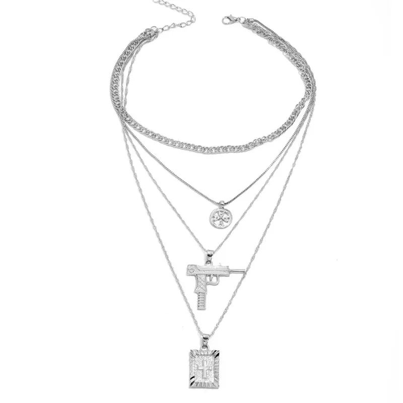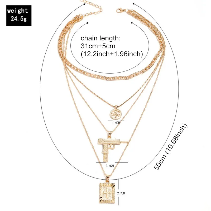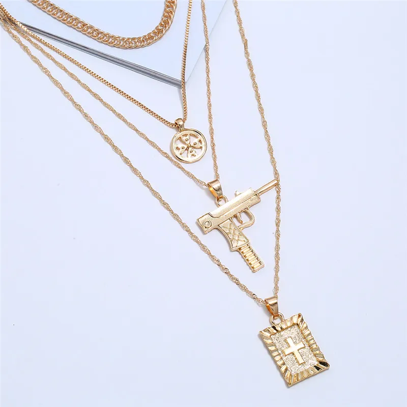 FREE SHIPPING Fashion Long Chain Silve Cross Pendant Gun Necklace For Women Gold Layered Necklace Christ Choker Multi Necklace Vintage Jewelry JKP2838