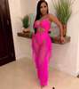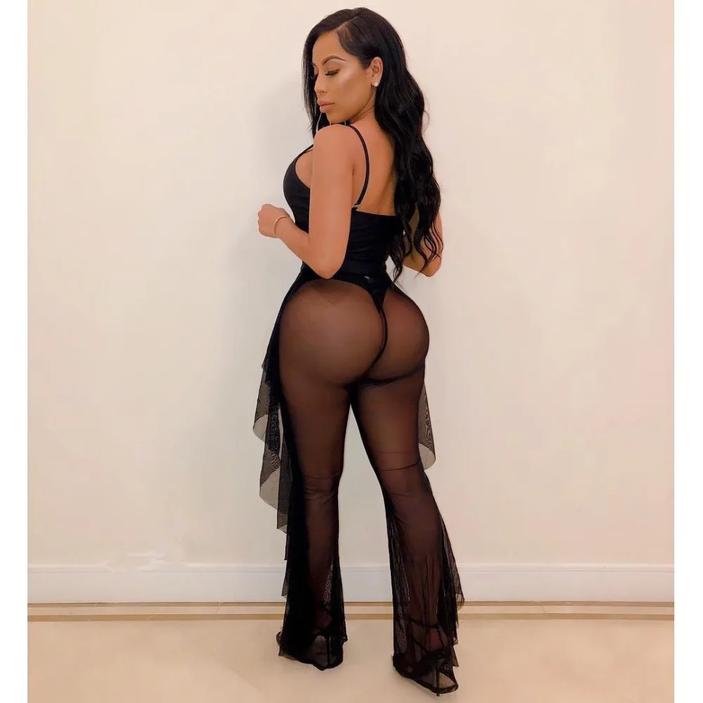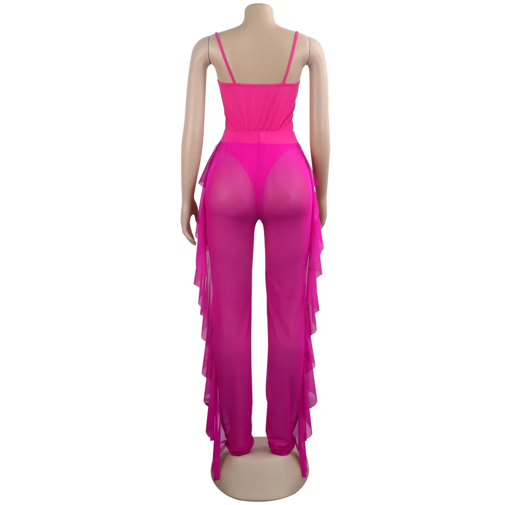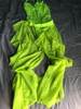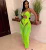 FREE SHIPPING Fashion Neon Green Tracksuit Women Two Piece Set Sleeveless Bodysuit And Ruffles Mesh Sheer Pants Bodycon Two Piece Outfits JKP1921
