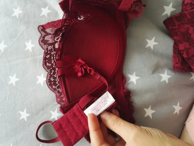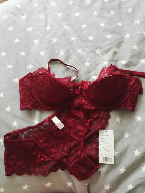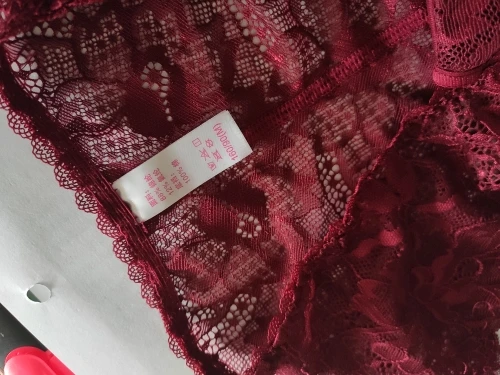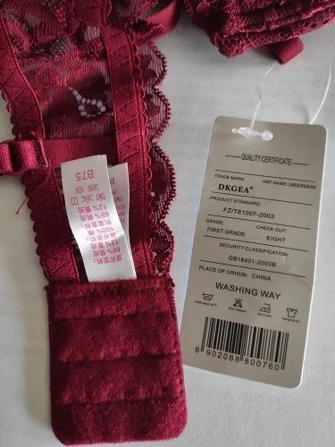 Just as in picture and description. Still have to try on but most likely will fit. Dark red/burgundy colour is absolutely gorgeous! Fabric looks really nice. Details like the small bows make this set look even cuter. Sizes seem about right, please note: I ordered 75B (my bust around 84cm), came with panty size "M" but corresponds to German size (X-)Small. So, panty will fit me just fine, because I usually wear XS panties. Very stable triple-row hooks on bra. If you have very big hips (bigger than 90 cm) and usually wear M or L sized panties, panty for bra 75B might be too small for you. See pictures for further details on product: No large push-up lining/pad, only a bit. No Lining pockets to insert extra lining; consequently lining/padding cannot be changed. For me it's just fine, though this bra might be the wrong choice for someone who prefers excessive, extreme push-up bras.The bra looks a bit oddly shaped, due to delivery, won't stay like this. I am very happy, thank you store!