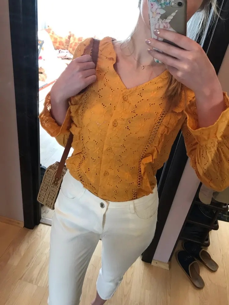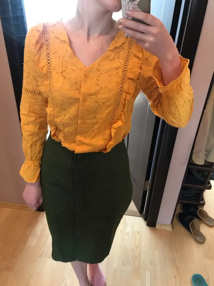 The blouse is made neatly of cotton. Sewing quality. The lines are even. A little threads stick out, but they will not be difficult to trim. On the parameters og 90 from 72 villages just! Blouse is suitable for hot weather, very light and in it you will not burn in the sun. It goes well with summer things and will look interesting in the city and on vacation. I recommend to buy!
