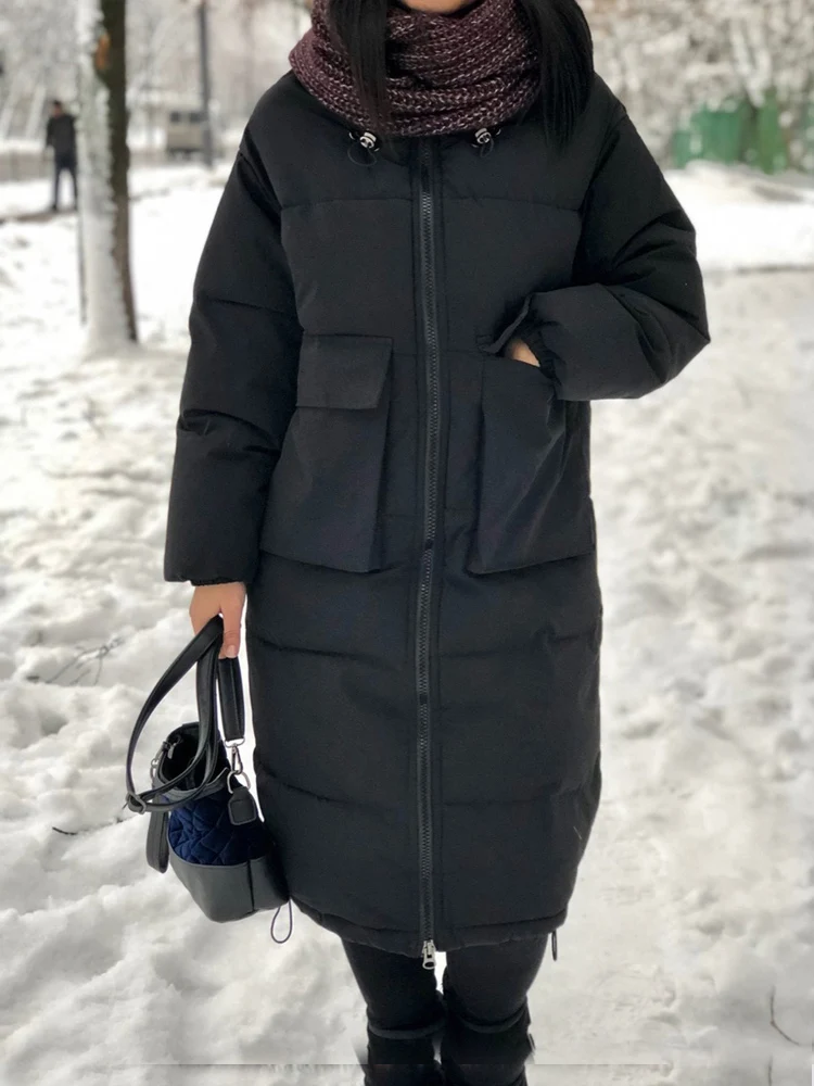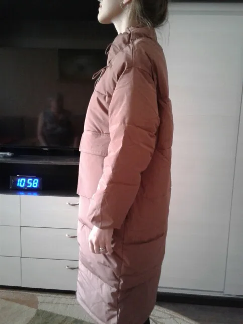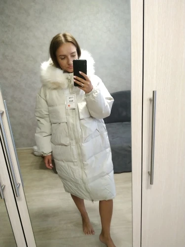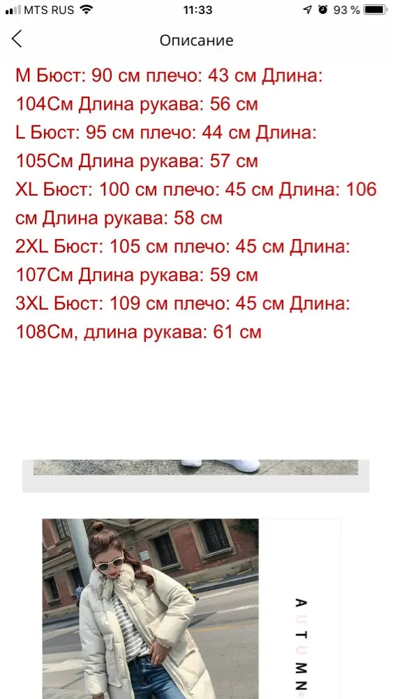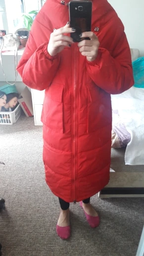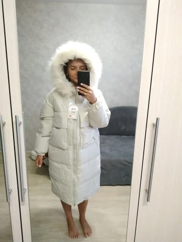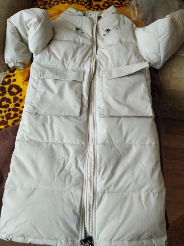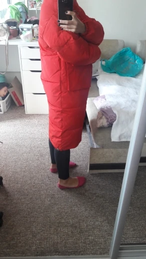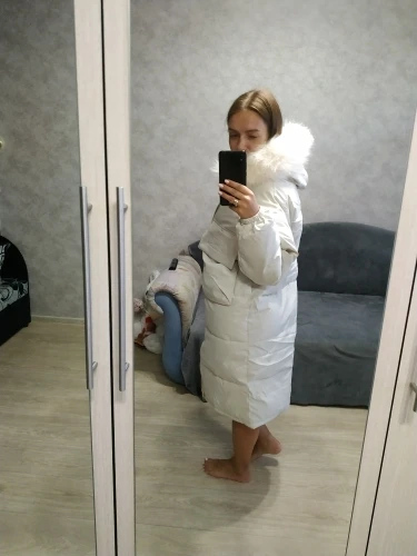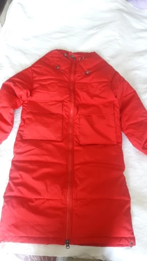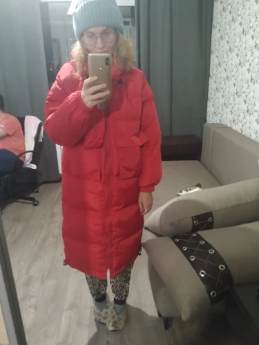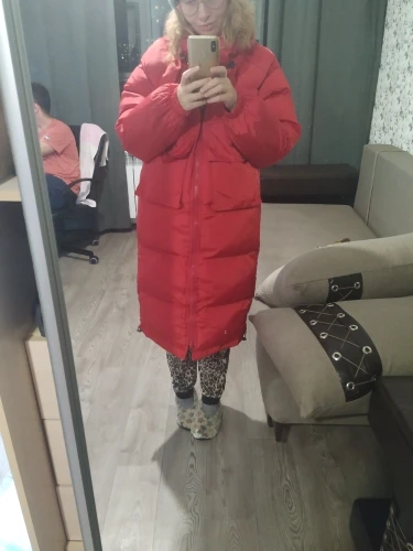 The product is very fast, the jacket liked, good fabric, very beautiful bright color. I wear 44, i ordered l, my weight is 56 kg, height 160, the jacket is below the knee, to the middle of the ankle. On a strong frost will not go, thin, at-7 i think you can stretcher. Good wide snake. I'm wearing a jacket.
