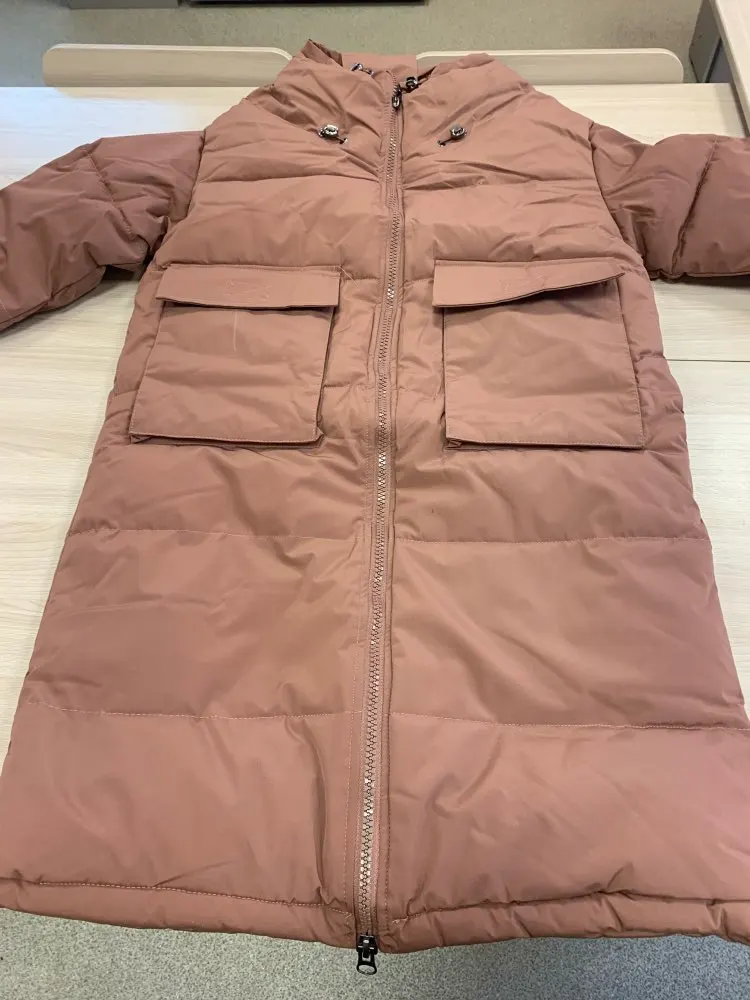 The coat came quickly! The store sent the goods right away! Packing is excellent! Seller recommend! Everyone is happy! the fabric is not shiny, it looks great! The color is beautiful, dusty rose! On the size 44-46 took l free, oversize. Warm, in severe frosts with the carpet will be good, the length to the knee for height 170! Thank you for the good service! Good luck to the seller!