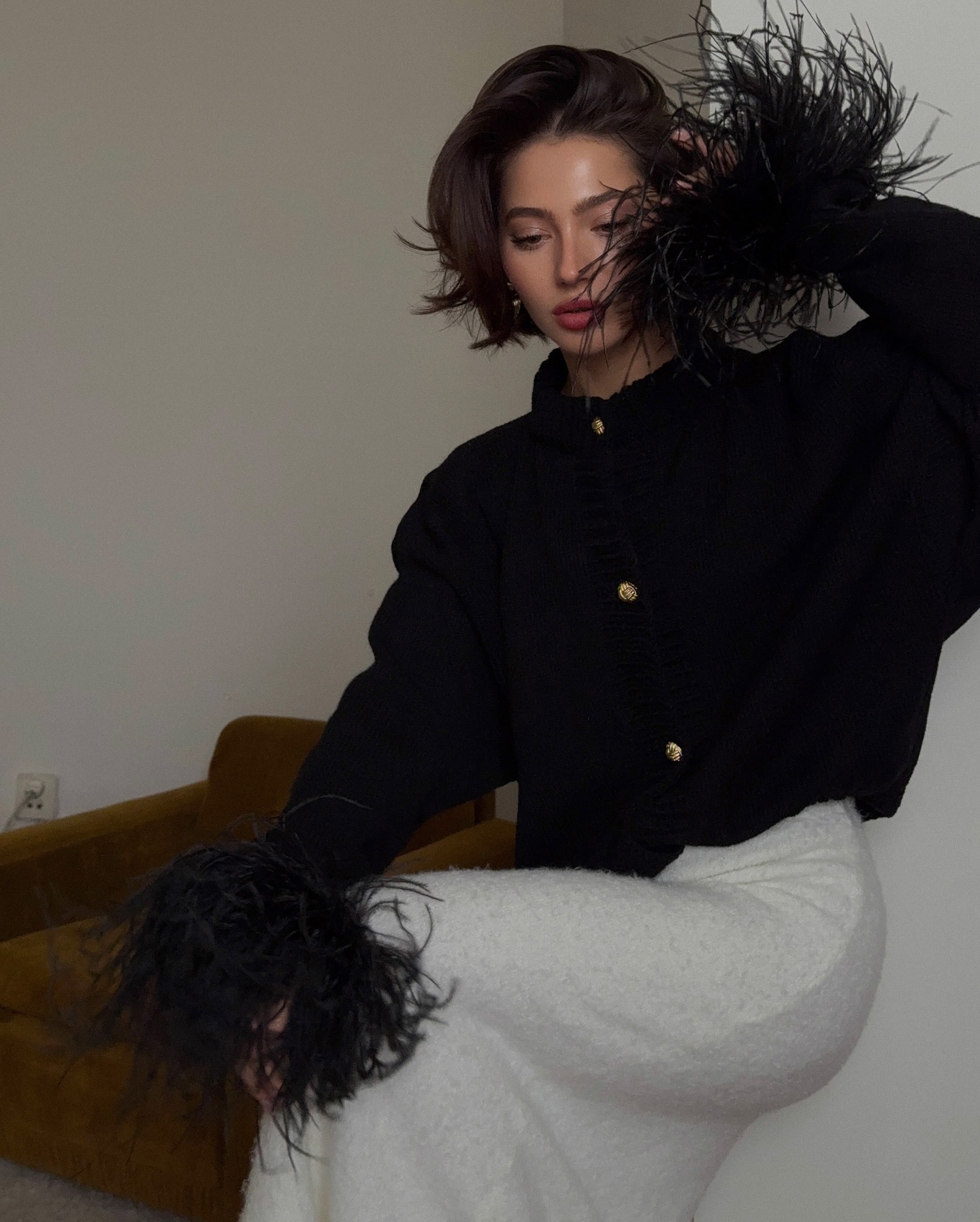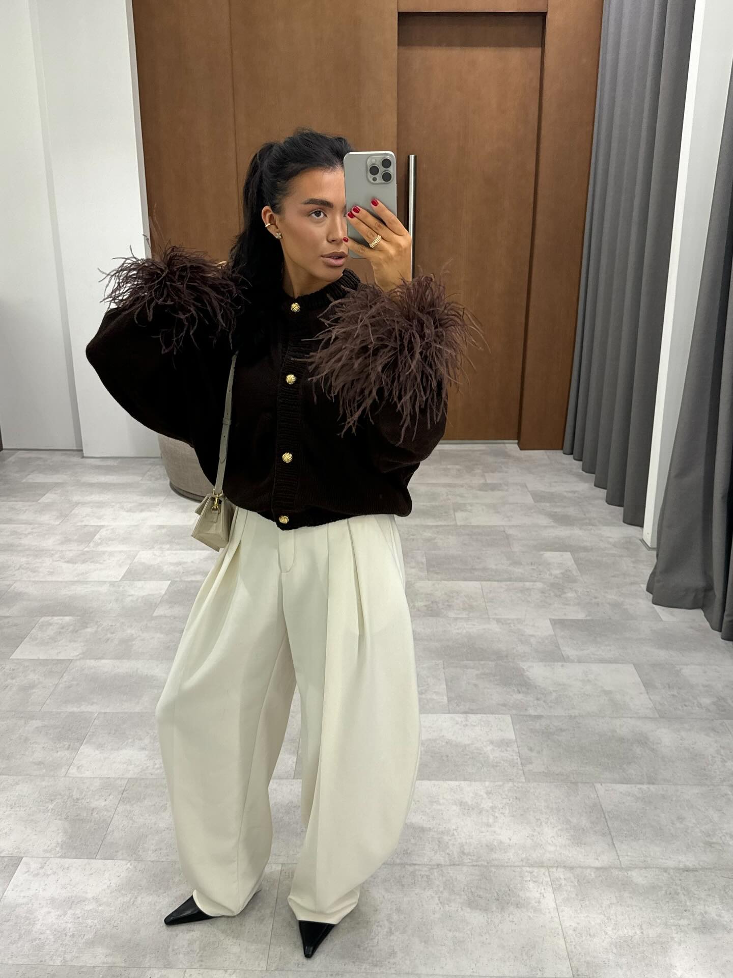 This feathered cardigan is absolutely stunning! The feather trim is such a unique and fashion-forward detail that instantly elevates any simple outfit.