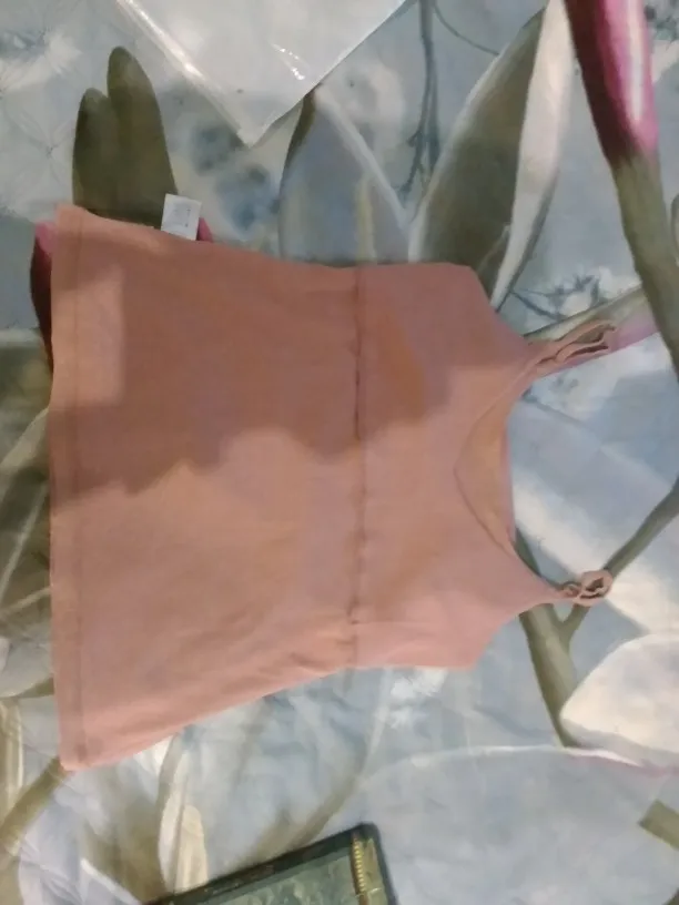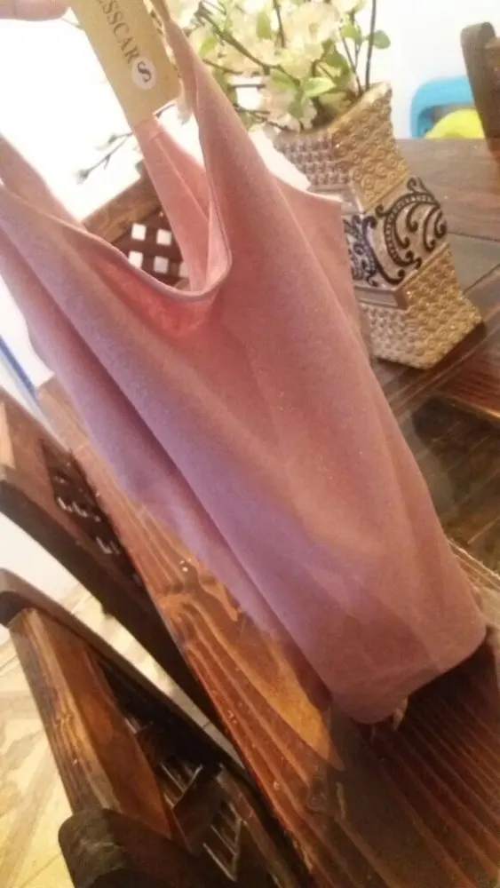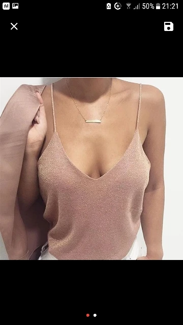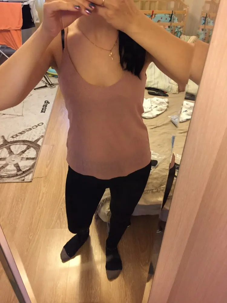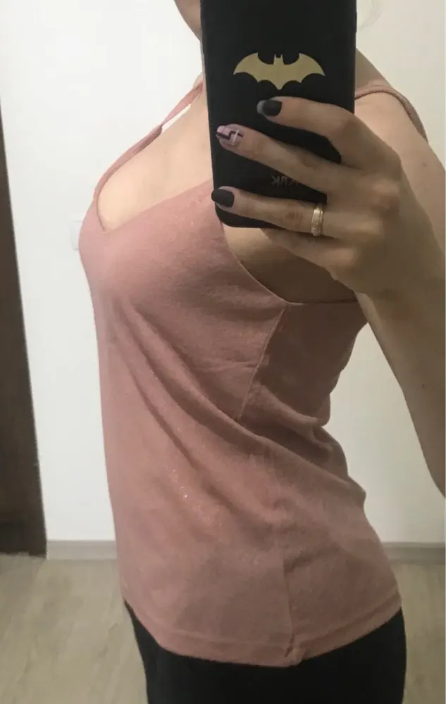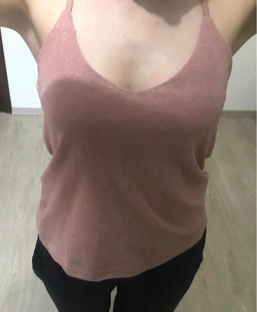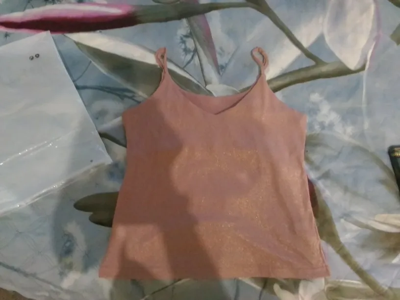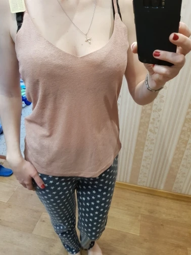 Very cute top. There is no strong light, as the photo, this is very good. Slightly different gold, very noble. Color is very delicate, powdery pink. Straps are adjustable, pull, so what's the point of adjustment is not much. My 95-76-99 size L fits quite loose, think you can safely take M safe :-). But in general the apiary its price is very personal. Shipping less than a month.