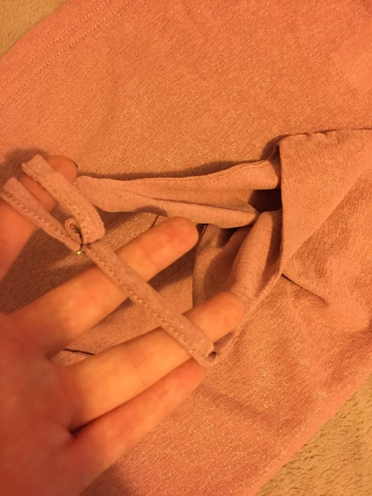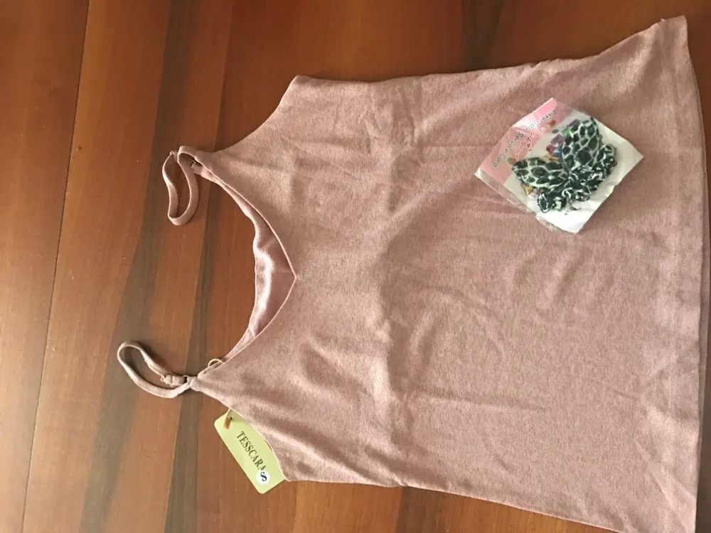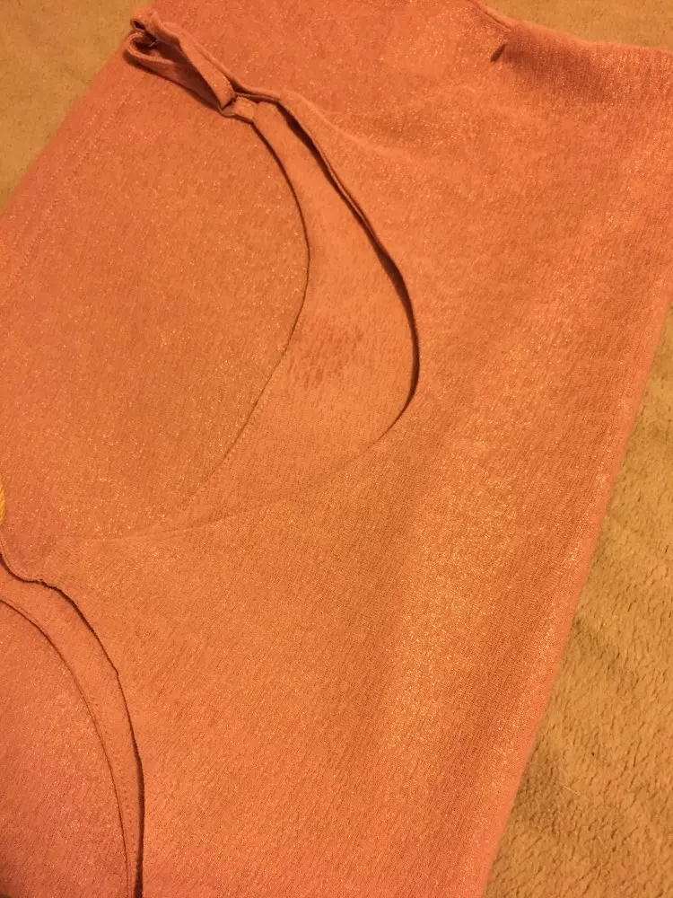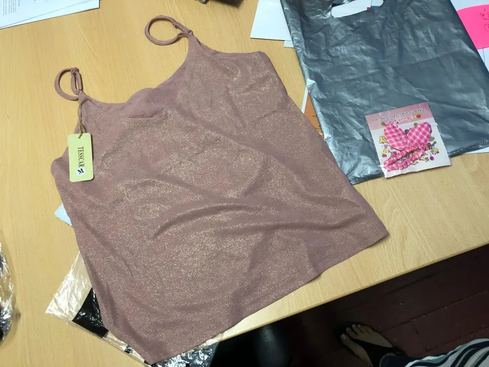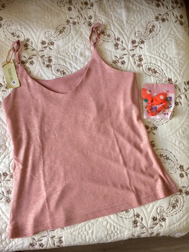 Very cute top. There is no strong light, as the photo, this is very good. Slightly different gold, very noble. Color is very delicate, powdery pink. Straps are adjustable, pull, so what's the point of adjustment is not much. My 95-76-99 size L fits quite loose, think you can safely take M safe :-). But in general the apiary its price is very personal. Shipping less than a month.
