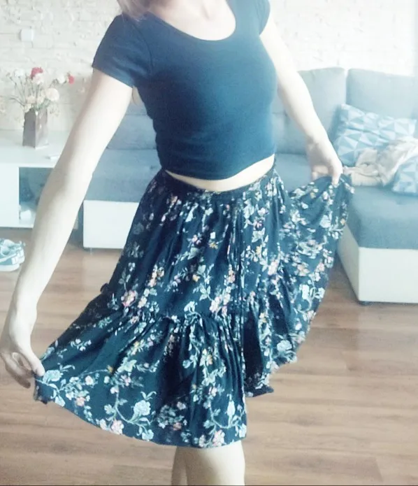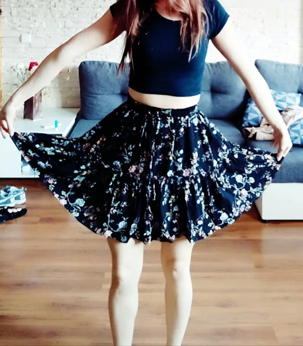 Skirt is wonderful! Looks exactly the same as the picture. Material is Mily, airy, not prześwituje. I wear size S, zamówiłam size S and is OK. My dimensions: 82/68/89, 167 cm tall. Skirt will fit well for higher person.