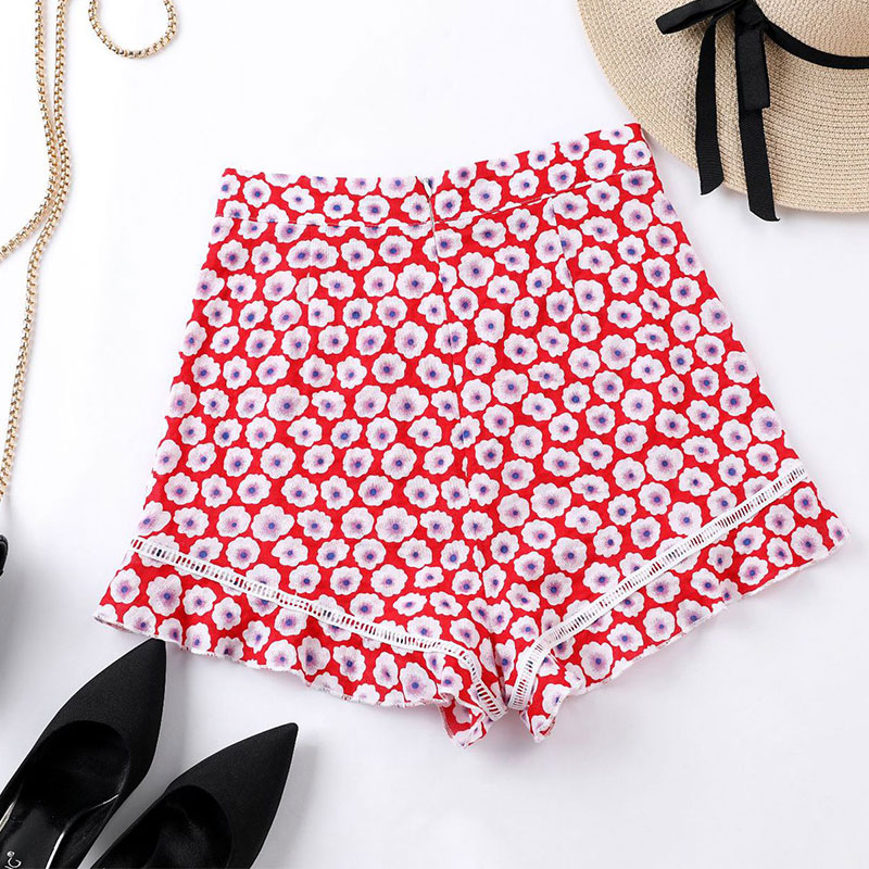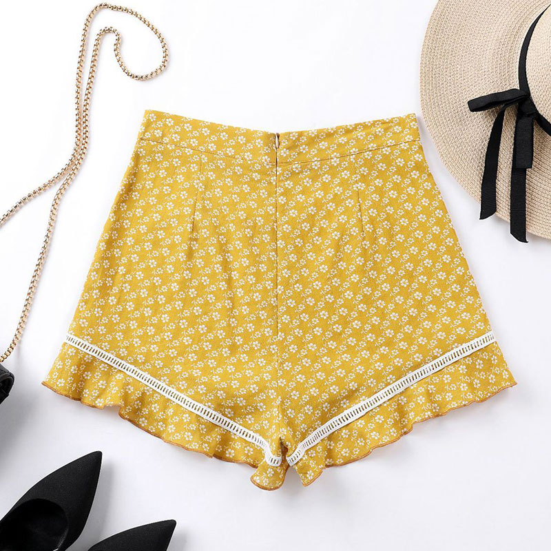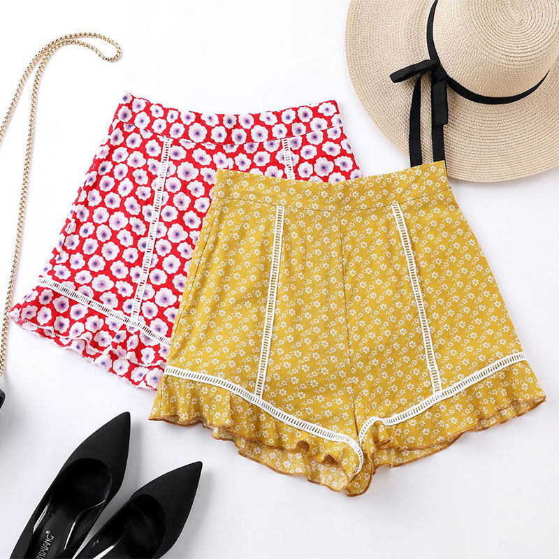 FREE SHIPPING Floral Print Sexy Shorts Women Beach Style Bohemian Lace Hollow Out Mini Casual High Waist Ruffle Summer Shorts JKP2221