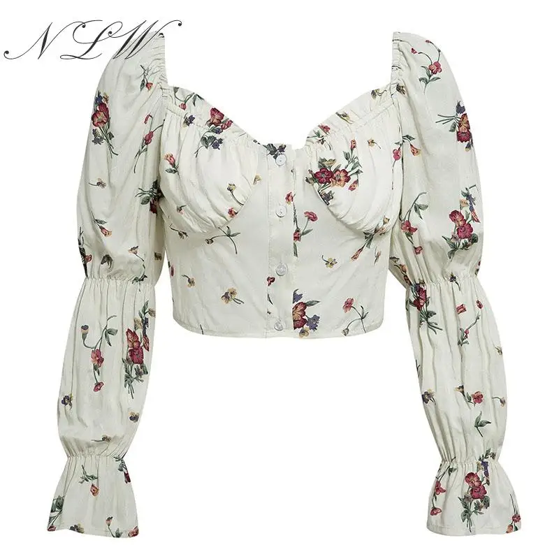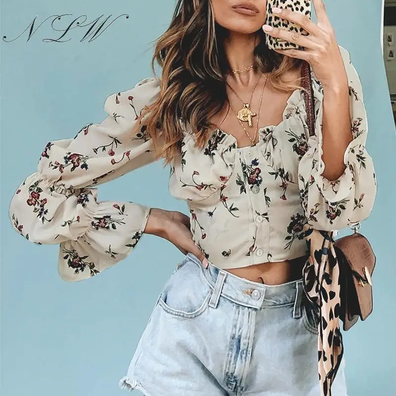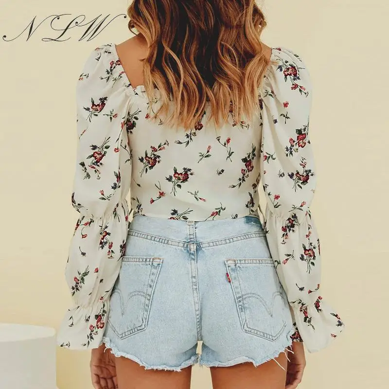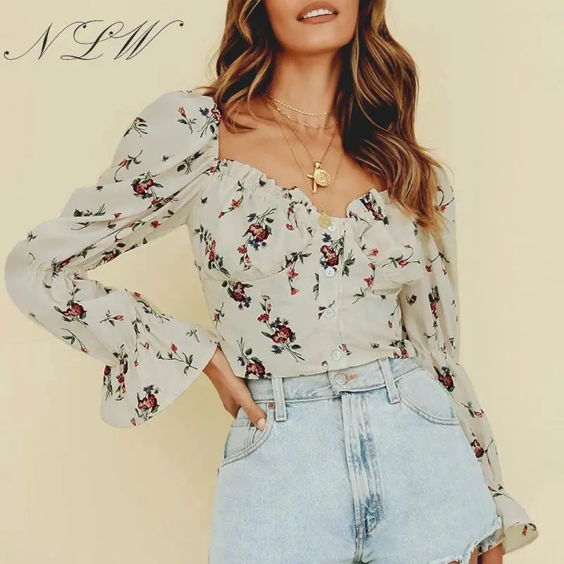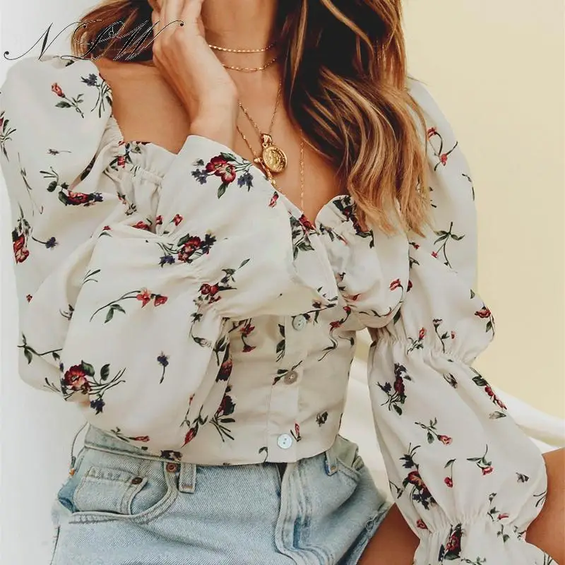 FREE SHIPPING Floral Vintage Square Collar Women Blouse Sexy Long Sleeve Autumn Shirt Female Blouses Beach Short Mujer Blusa JKP2116