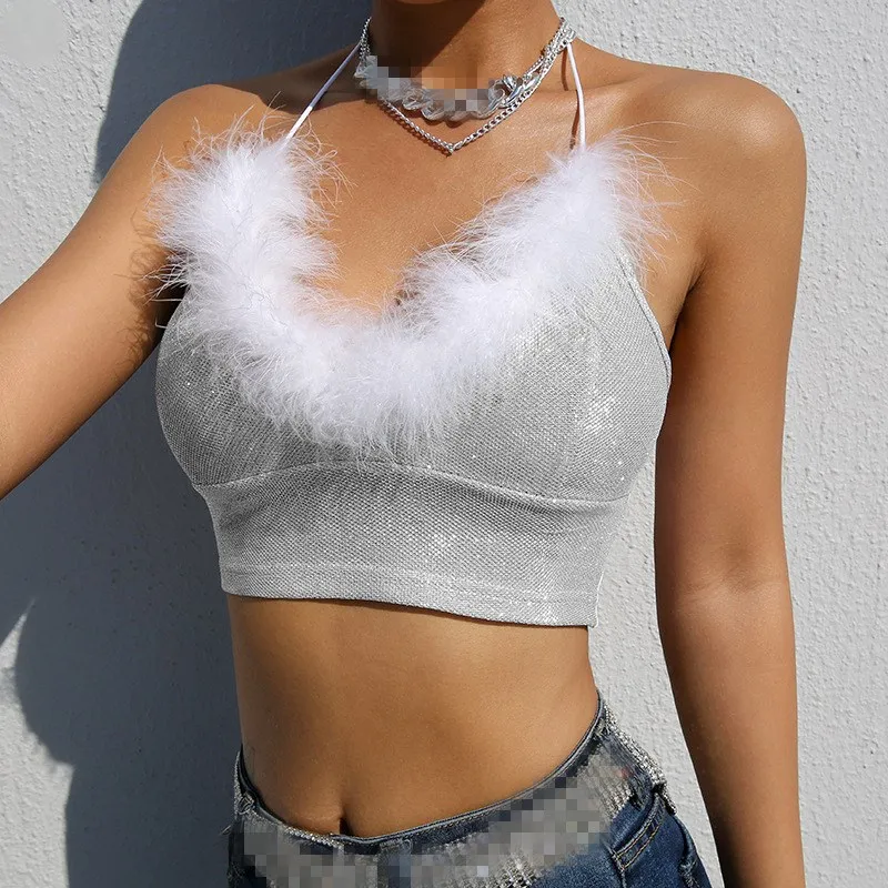 FREE SHIPPING Fluffy Fur Crop Top Glitter Sequined Deep V Neck Sleeveless Bodycon Tops JKP1531