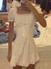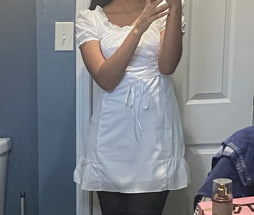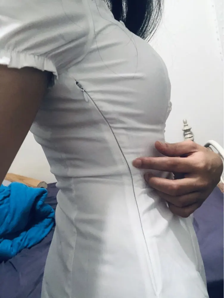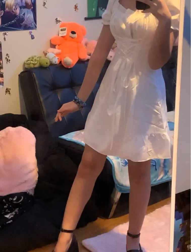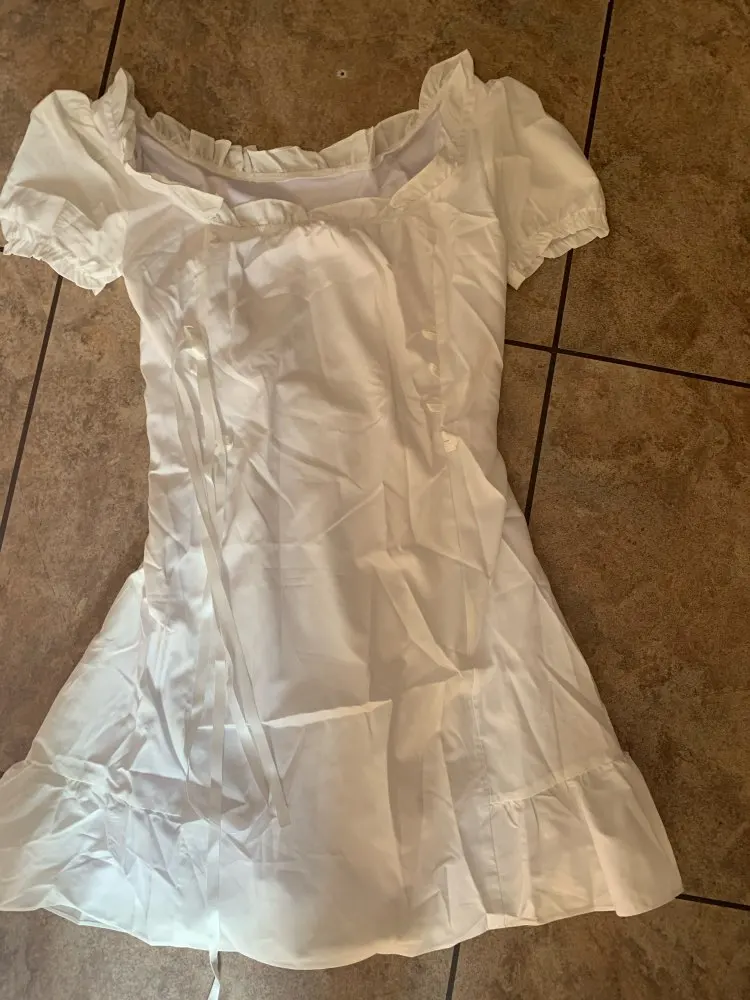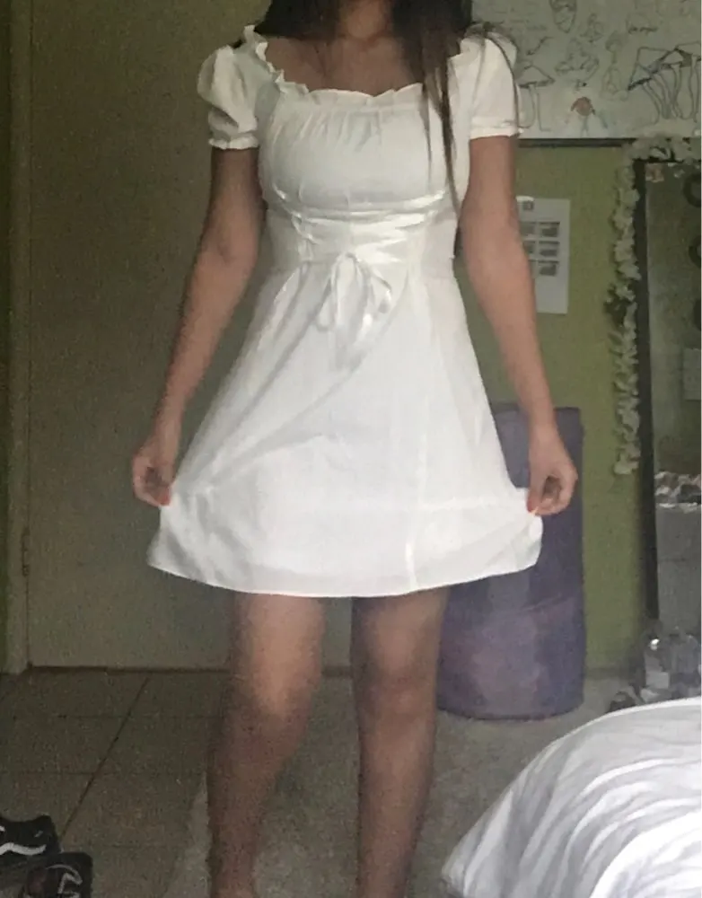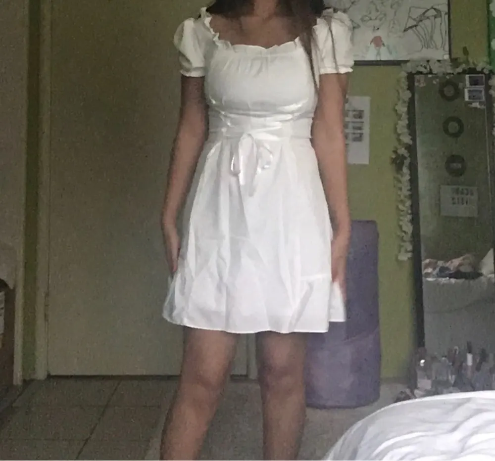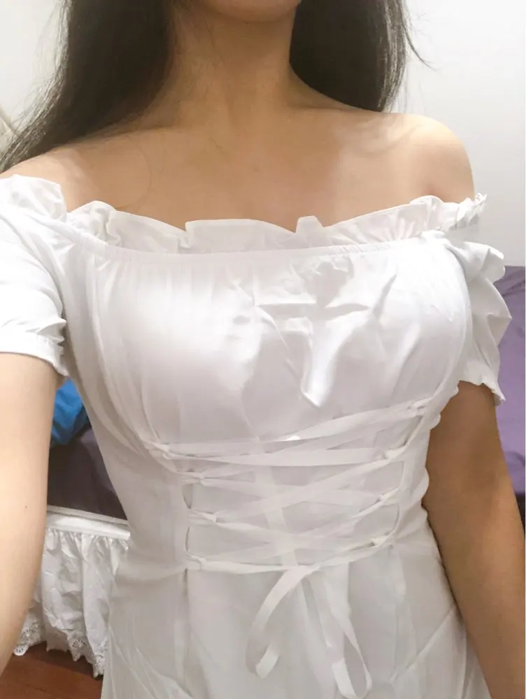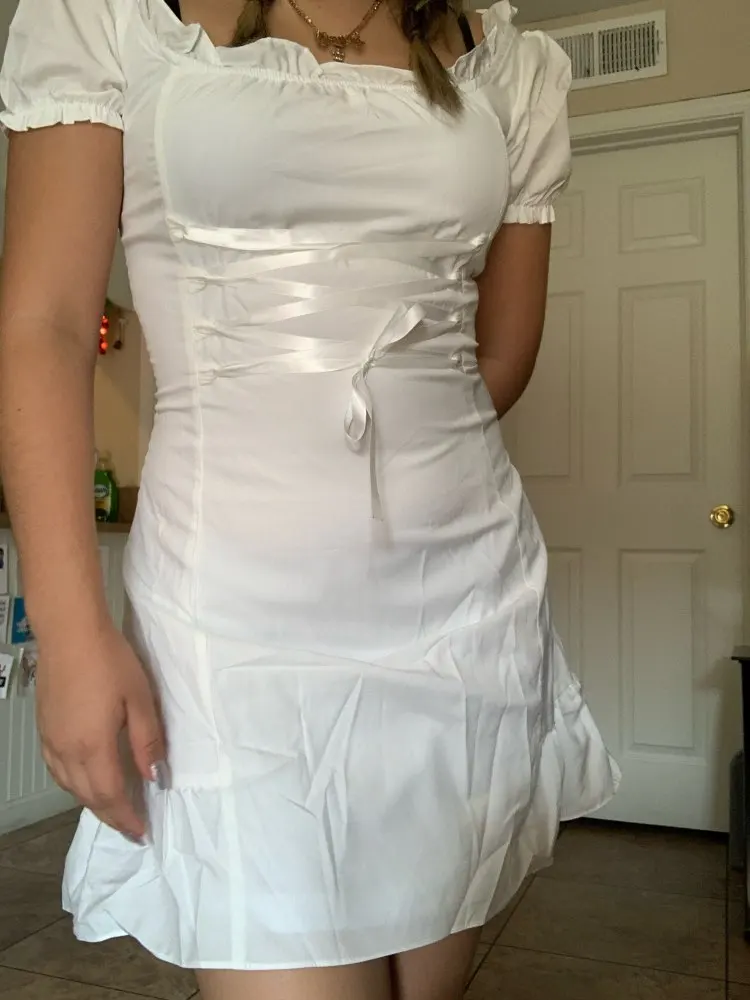 I was pretty surprised at how dress is well-made! It arrived in almost 2 weeks to southeastern US. The fabric is not that good but doesn’t see through at all even if you’re wearing black bra. It looks exactly same as the photo. Cute and elegant! But there is a ribbon you need to tighten up, it looks kinda cheap and shiny (the quality of ribbon is you can easily see it in the package of food). I’m 32DD, 46kg usually wears small for top, fits perfectly! 158cm, the length is slightly above my knees length is great.