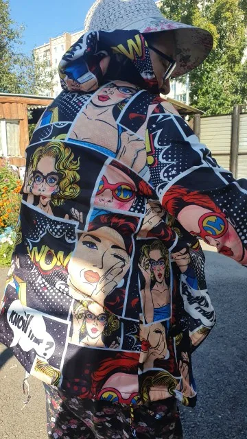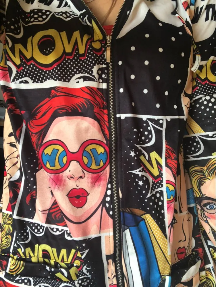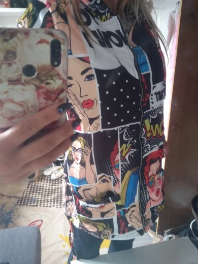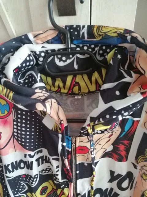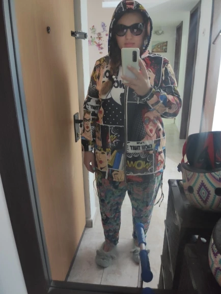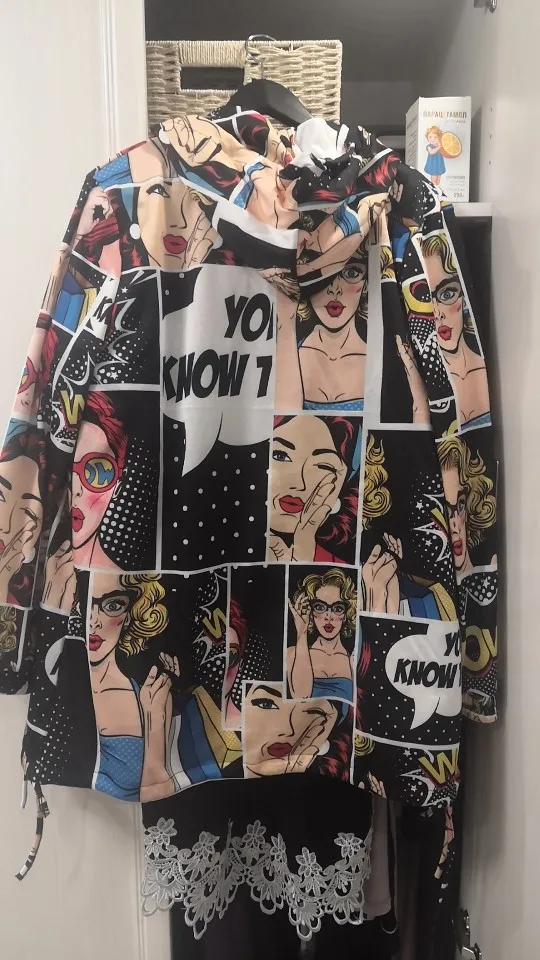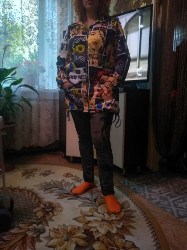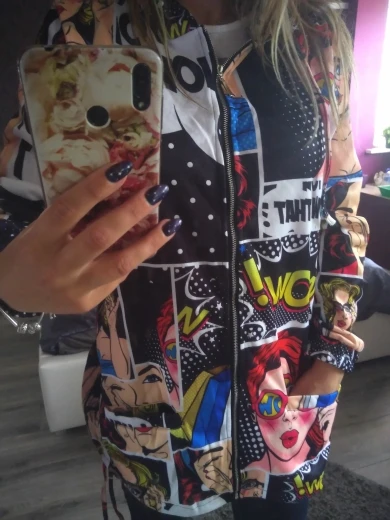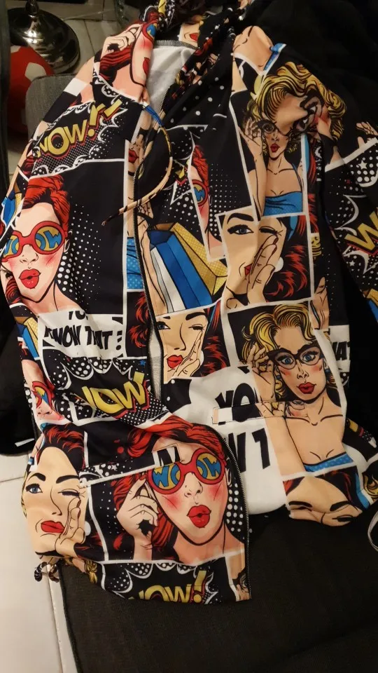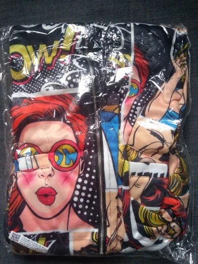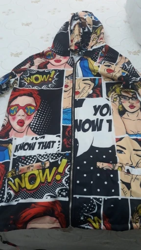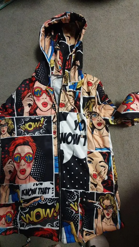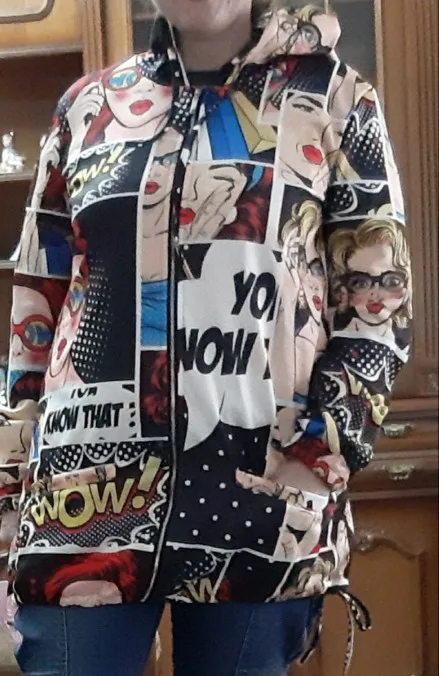 Super happy. Even though the colors are strong I love it. It's a very original jacket. It has a very finite plush inside so it can be worn in autumn and I guess maybe in spring. It closes with zipper, it's a long, baggy jacket. Feel free to buy it and I don't regret it. I love it. I arrive in 7 days to Spain and with good shipping tracking.
