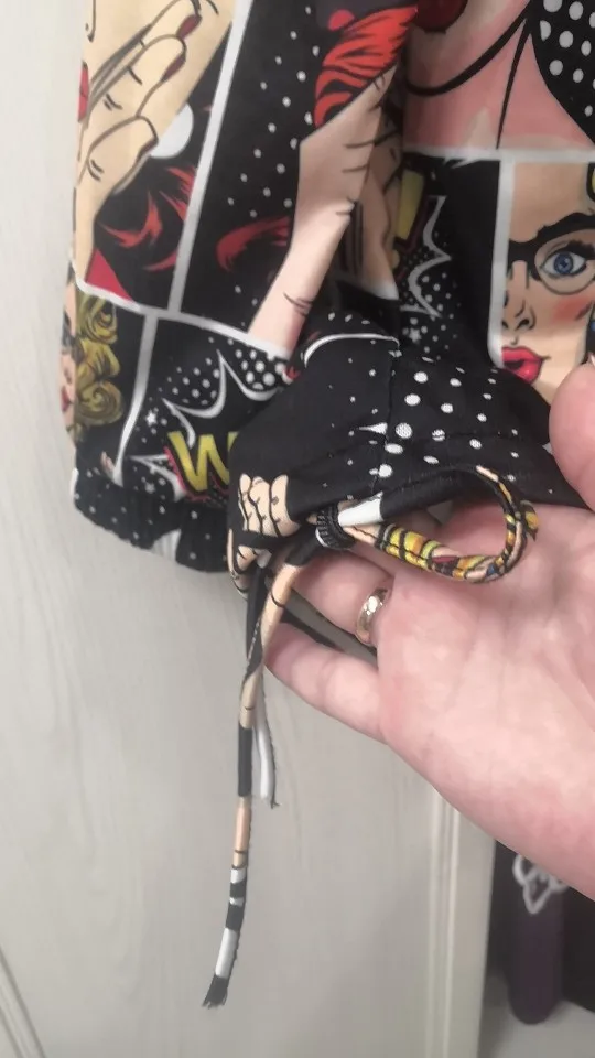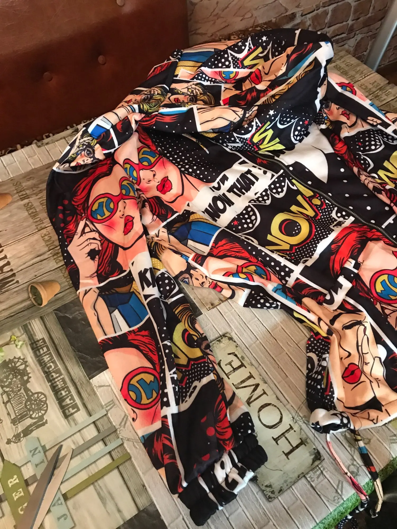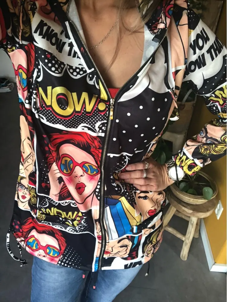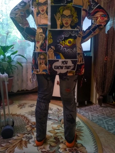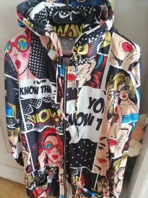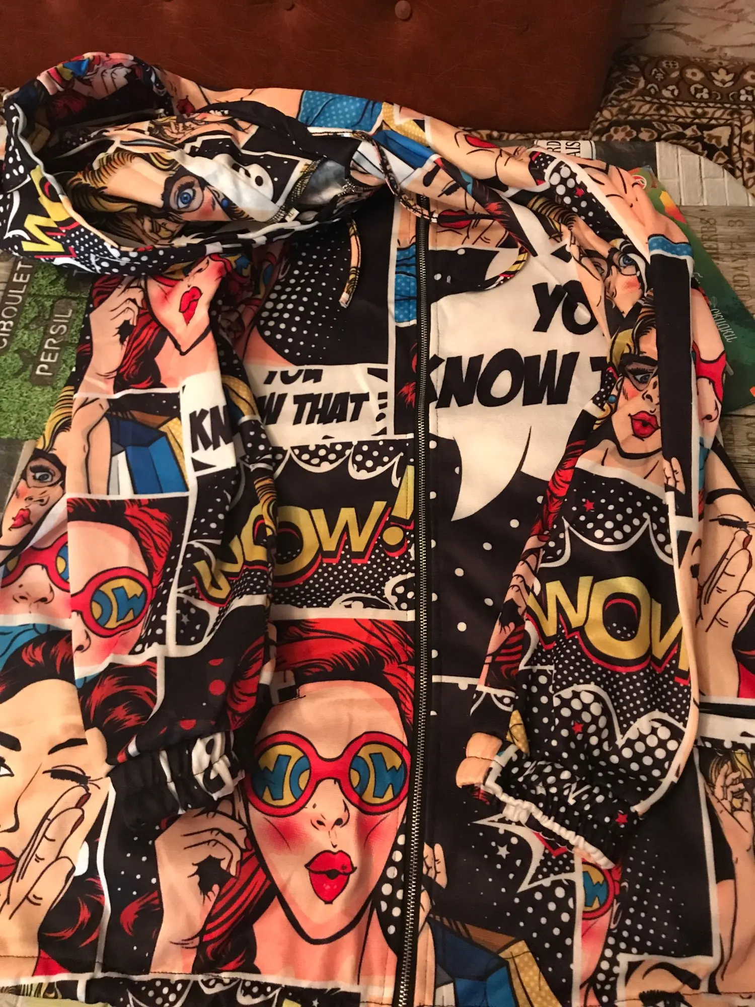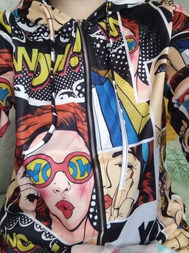 Super happy. Even though the colors are strong I love it. It's a very original jacket. It has a very finite plush inside so it can be worn in autumn and I guess maybe in spring. It closes with zipper, it's a long, baggy jacket. Feel free to buy it and I don't regret it. I love it. I arrive in 7 days to Spain and with good shipping tracking.