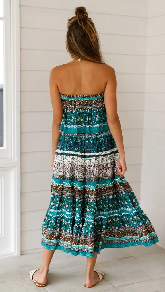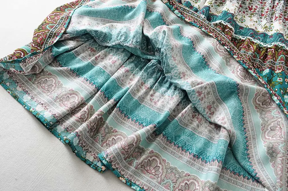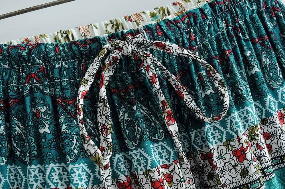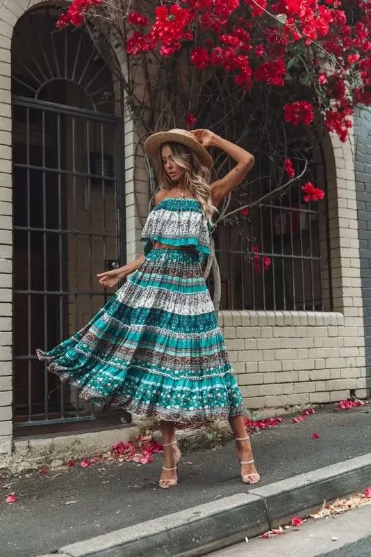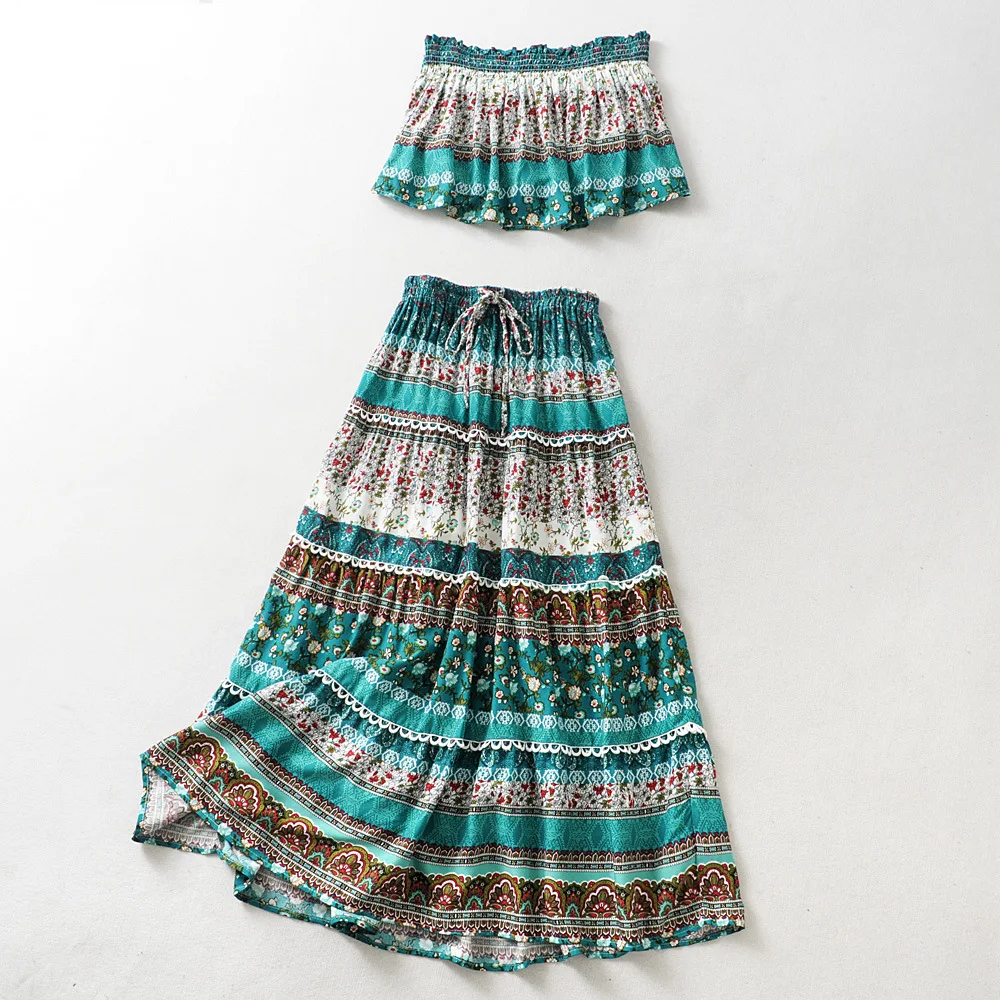 FREE SHIPPING Green Floral Print 2 piece Set Dress Boho Crop Top + Boho Ruffle Skirt 2 piece Set Women Dresses Beach Casual Dress Suit JKP1673