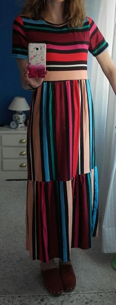 This dress fits really well! I am 5 feet 8 inches and around 180 lbs. It’s really well made. I like the fabric. The colors might be the exact same as the original photo but very similar and still cute regardless.