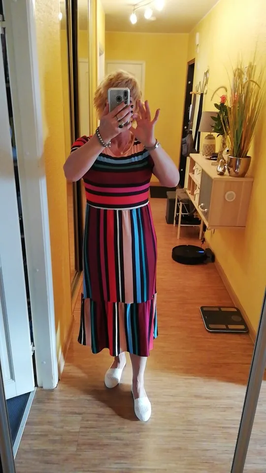 Dress as seen in the photo. Very cheerful. I got it in no time.