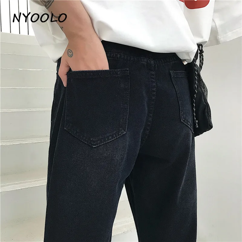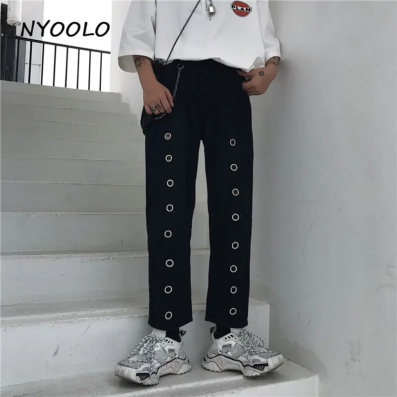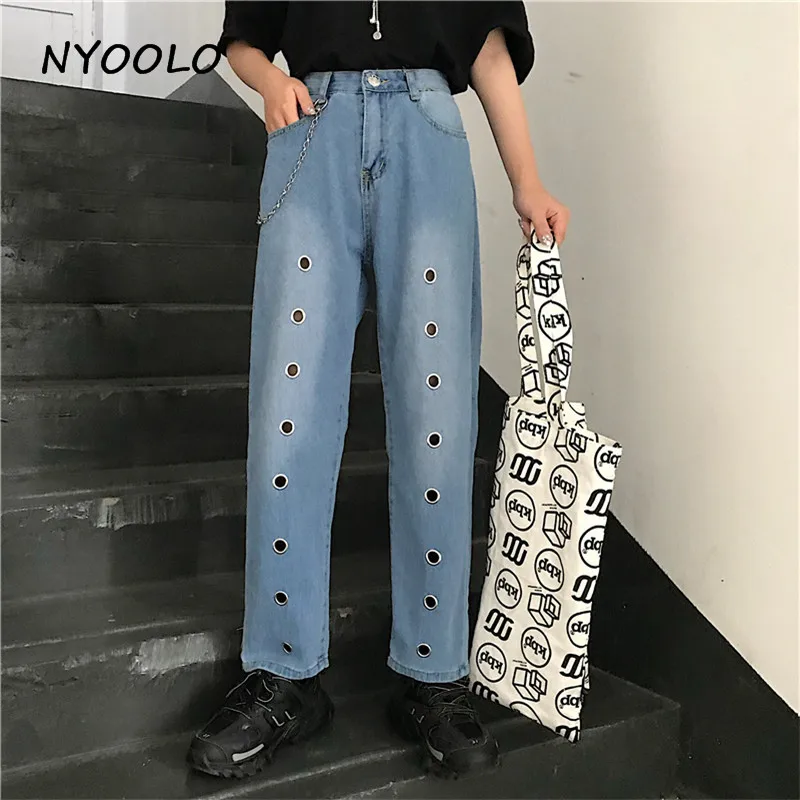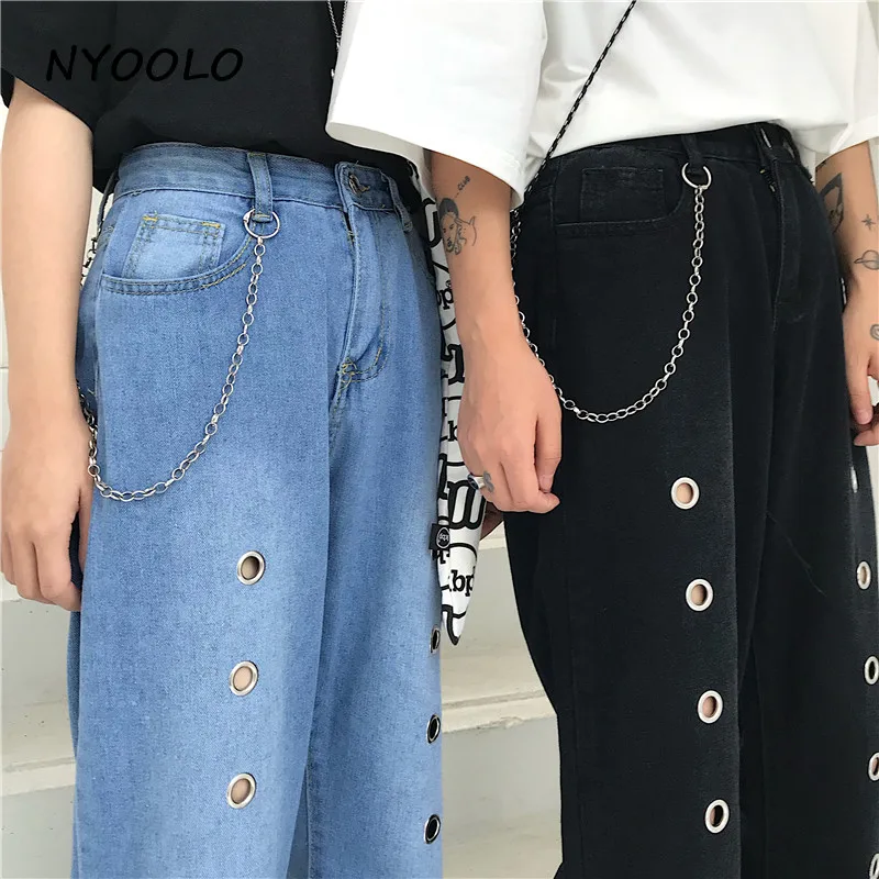FREE SHIPPING Harajuku design high waist Iron ring Hole Jeans Summer streetwear loose thin ankle length denim Pants women men clothing JKP1935
