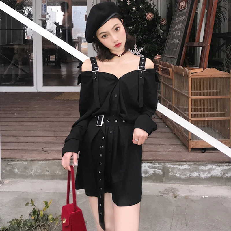 FREE SHIPPING Harajuku Goth Little Black Dress with Buckle Straps Belt Cold Shoulder Bardot Shirt Dress Gothic Party Night Dress JKP2514
