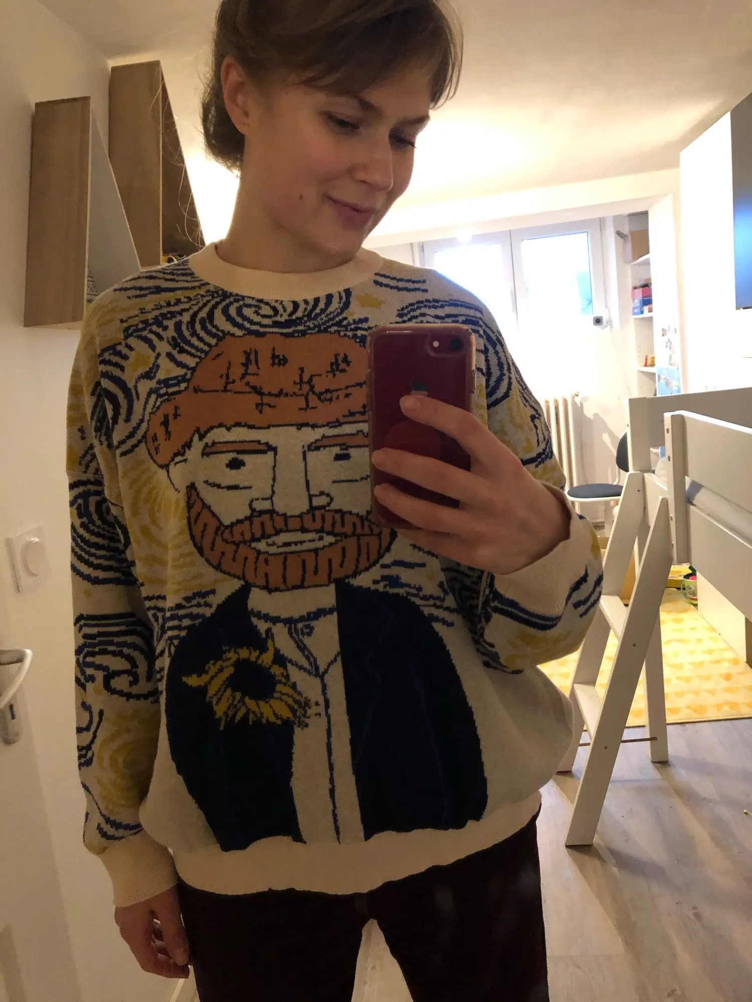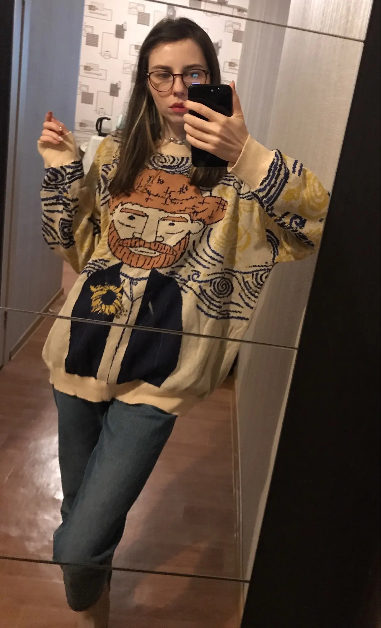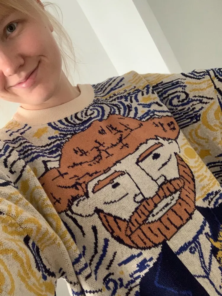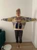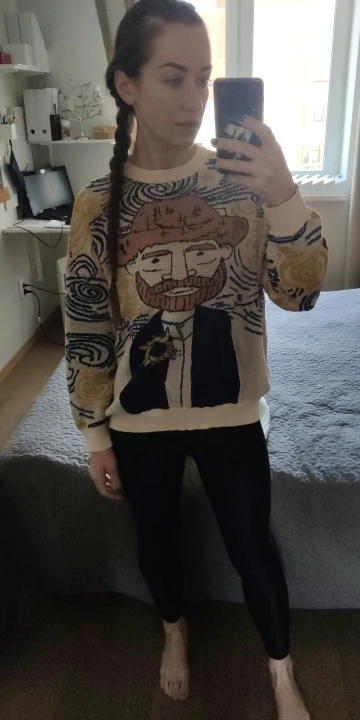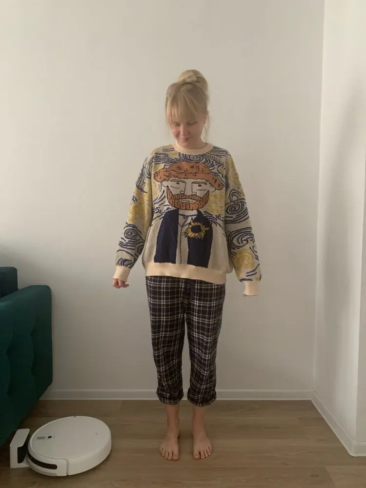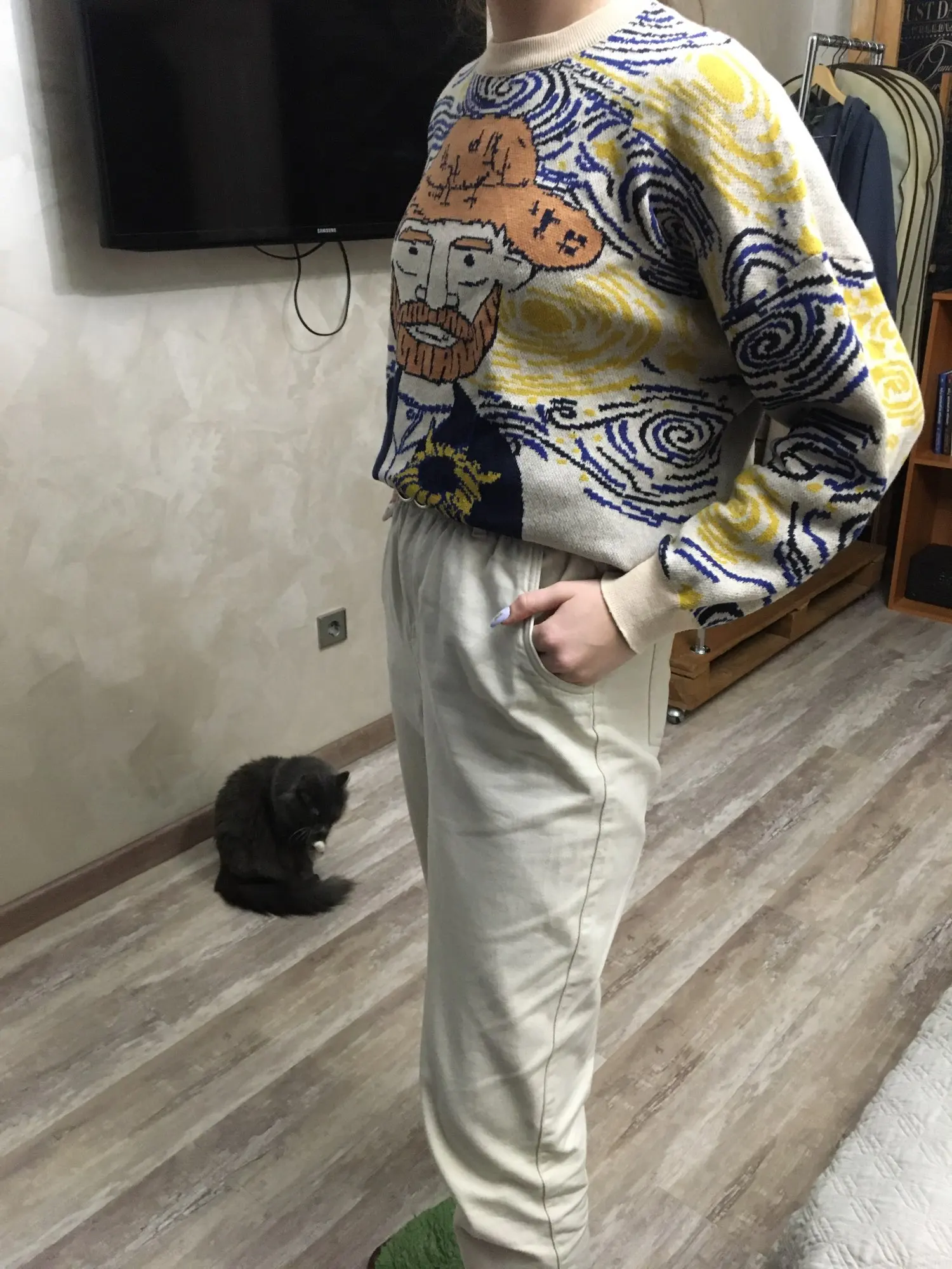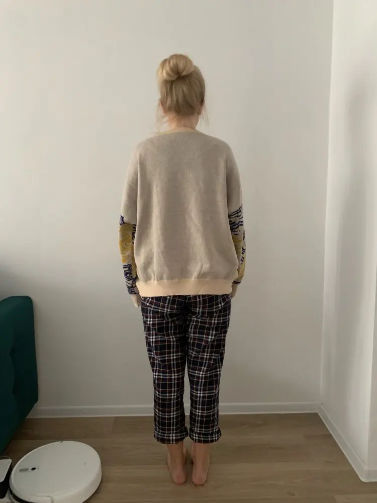 Excellent jumper, exactly as in the picture. On the size s oversize, sits down as it should. On height 168 the length is also excellent, the length of the sleeves even with a margin, you can turn or not turn. Threads do not stick out, there is no smell, I recommend.