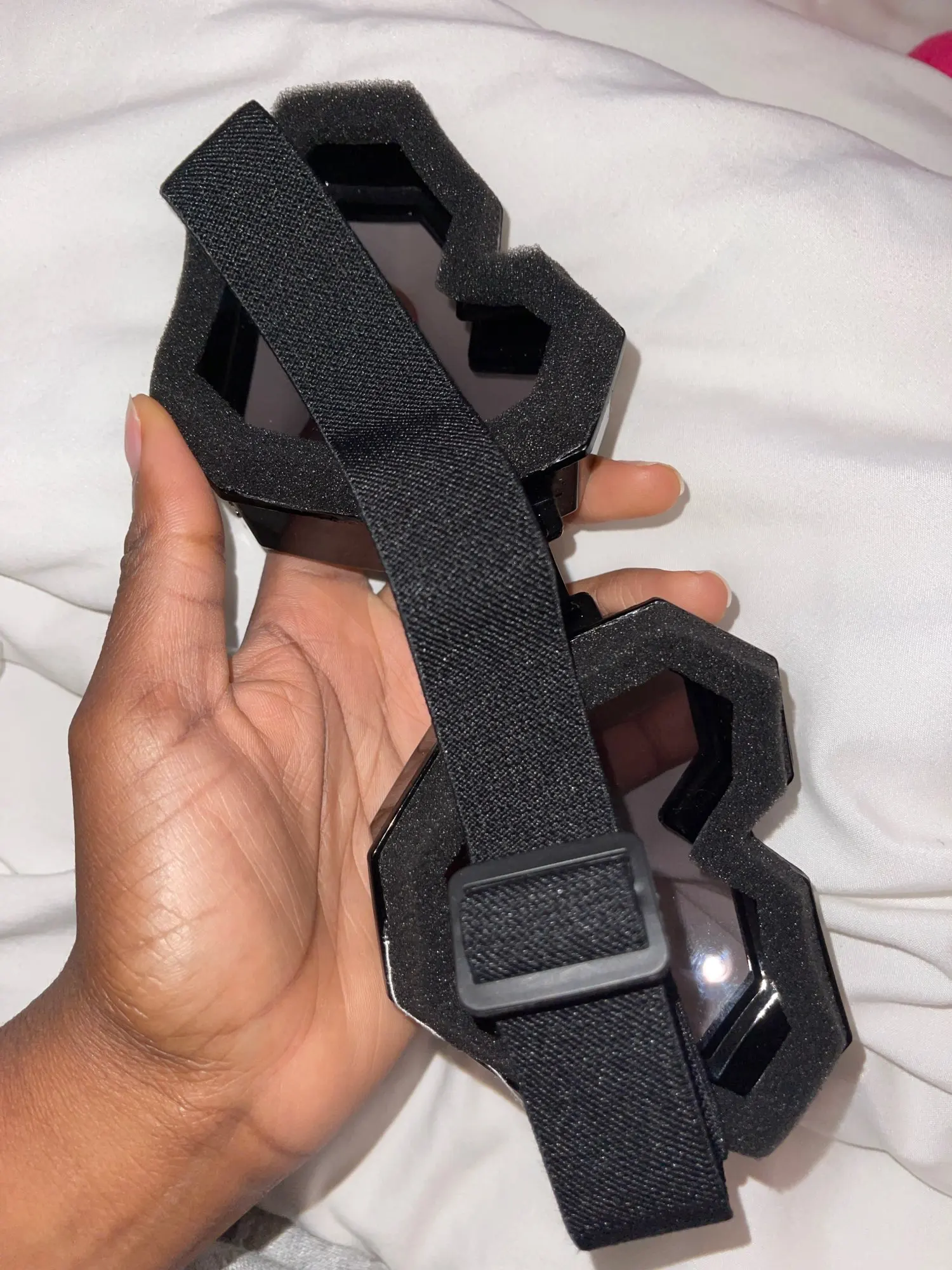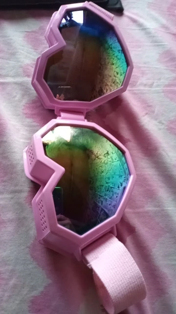 Arrived in 2 weeks to Ukraine. They look exactly like on photos, quite big but very comfortable. They have soft material on the edges to protect your eyes. Very reflective surface and actually quite comfy to wear, they have a blue tint. Would order more colours for festivals and parties. Thank you!