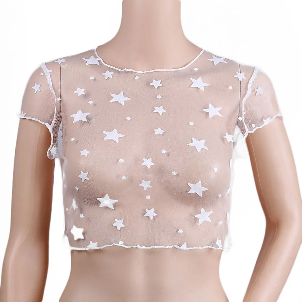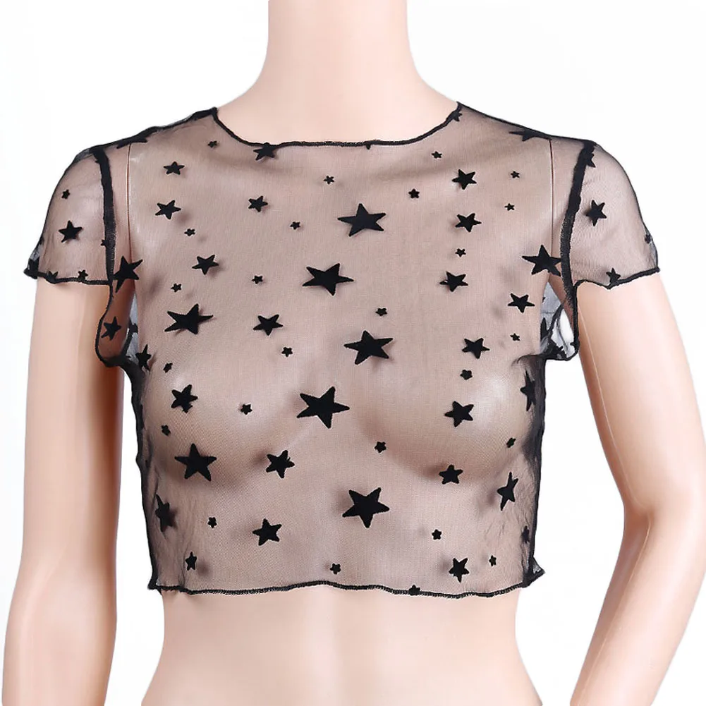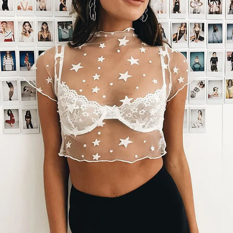 FREE SHIPPING High Neck Stars Embroidery Mesh Lady Crop Tops JKP1052