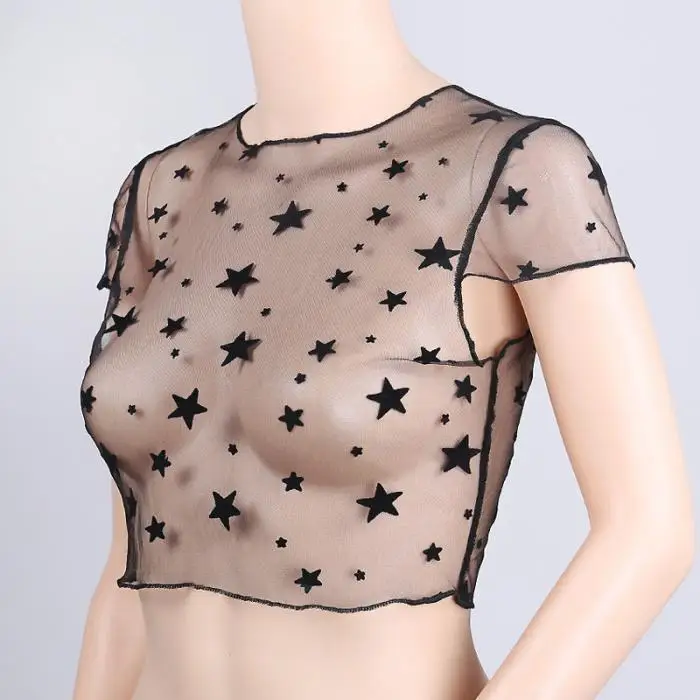 FREE SHIPPING High Neck Stars Embroidery Mesh Lady Crop Tops JKP1052