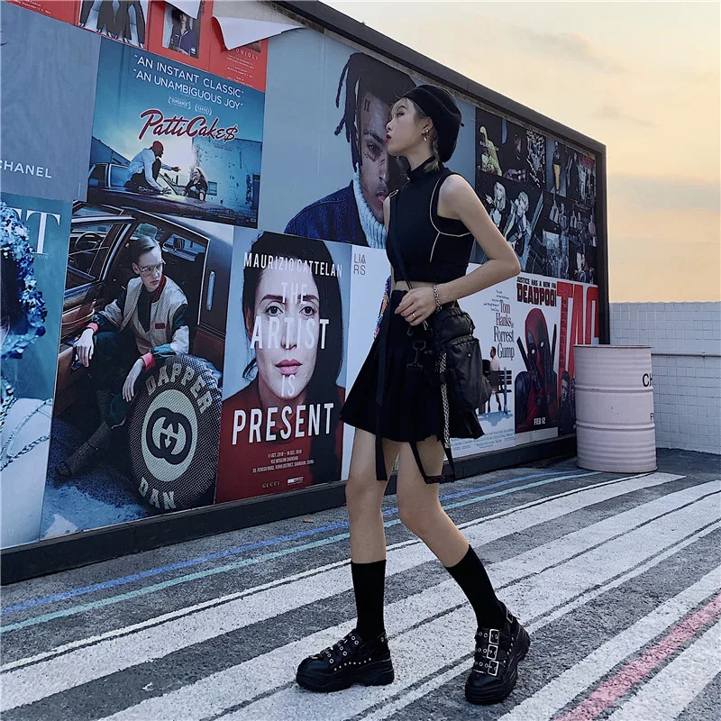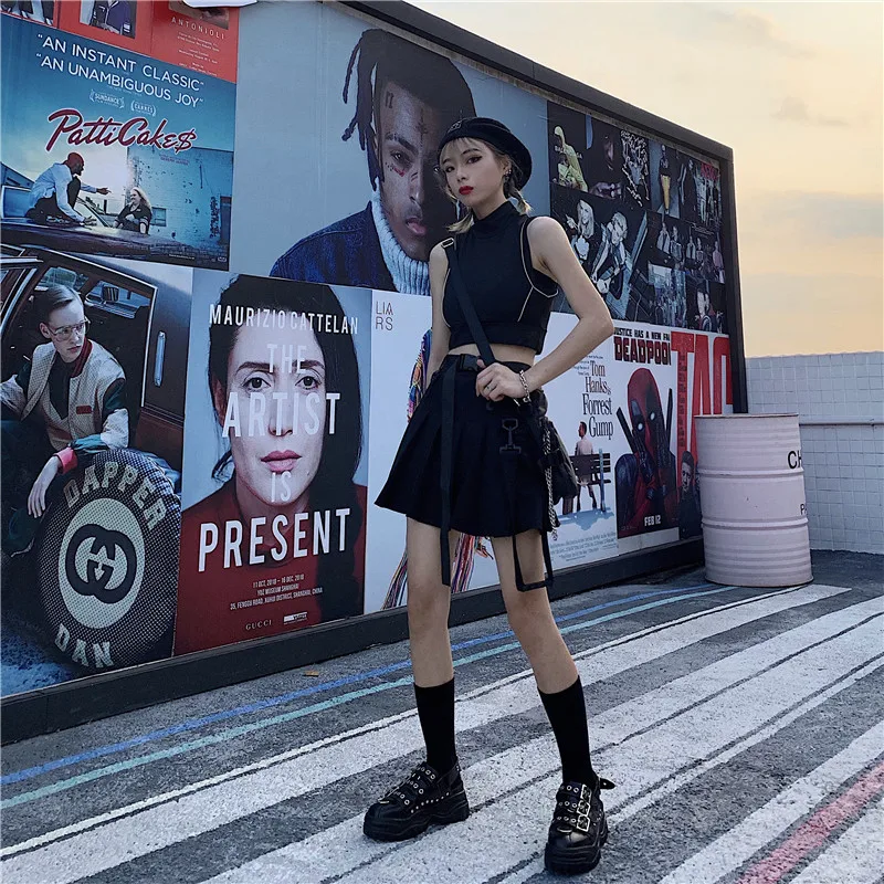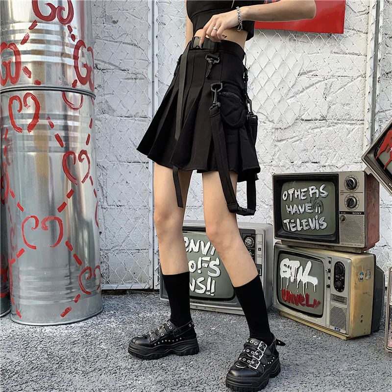 FREE SHIPPING High Waist Belt Zipper Ribbon Pocket Pleated Mini Skirt JKP1699