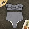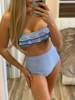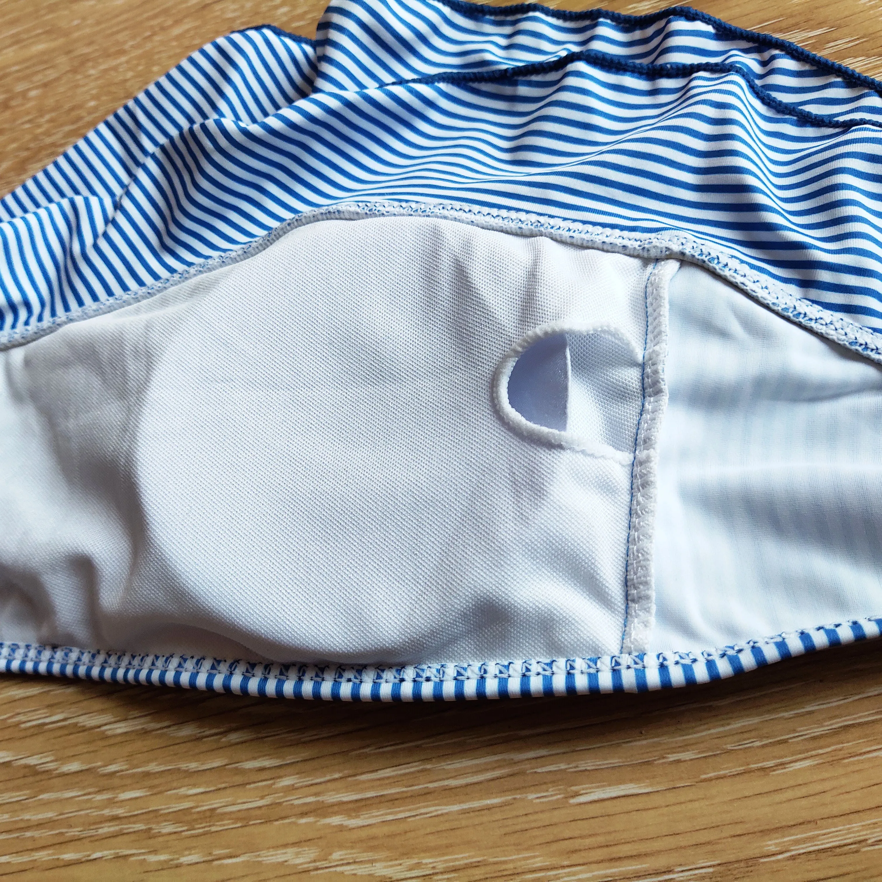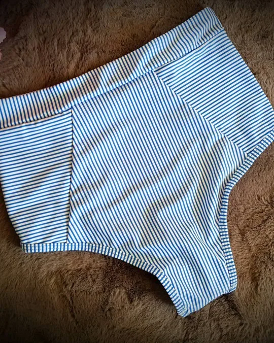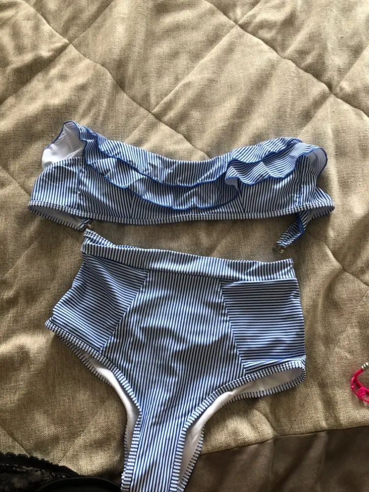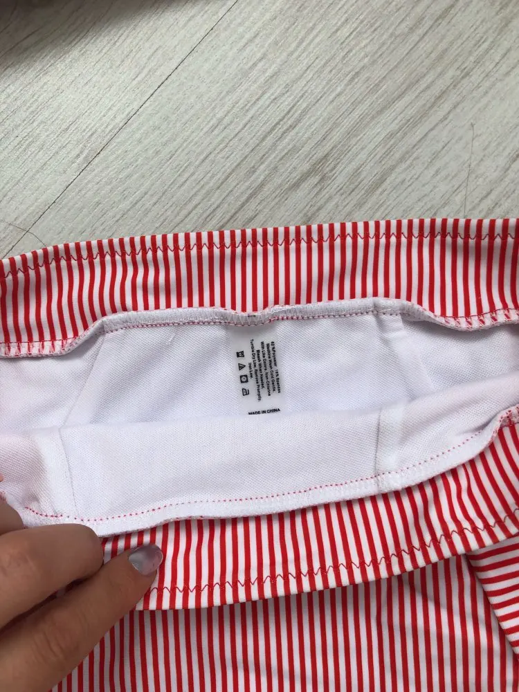 It looks interesting and not usually. And due to the stripes on the panties, which are located both horizontally and vertically, the panties look very original. They are made of double fabric, on the inside it is white, and with the outer in the strip. The fabric is dense, when wet does not shine through. On the gusset as usual there is a protective membrane. The seams are even neat. The top is in the form of a strip, which is fastened at the back with a standard metal hook. He has no supporting straps, so the size should be selected carefully. Front sewn decorative material, and looks very beautiful, airy, like a tank. The material is also double, there is a pocket for small foam inserts, if desired, you can choose them. On its parameters 84x62x90 cm. I chose the smallest size, the store is s. Swimsuit i liked, it looks very impressive!