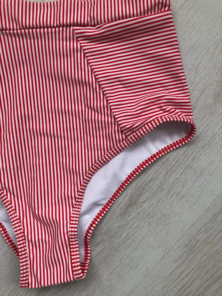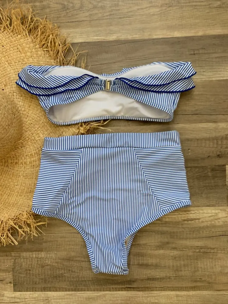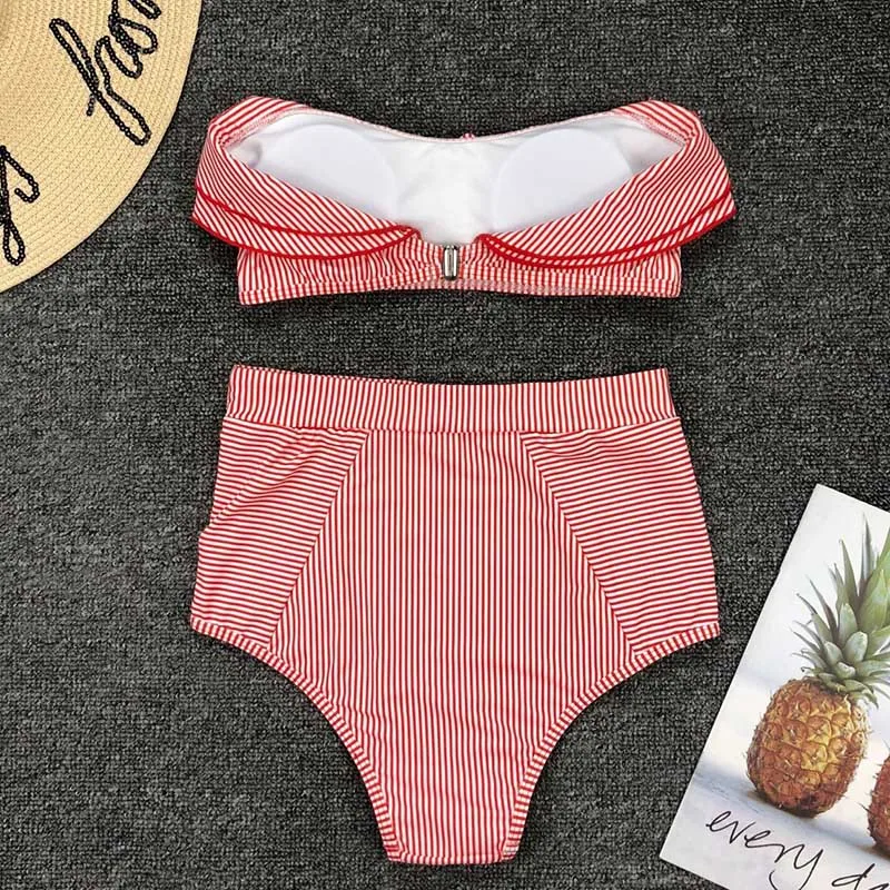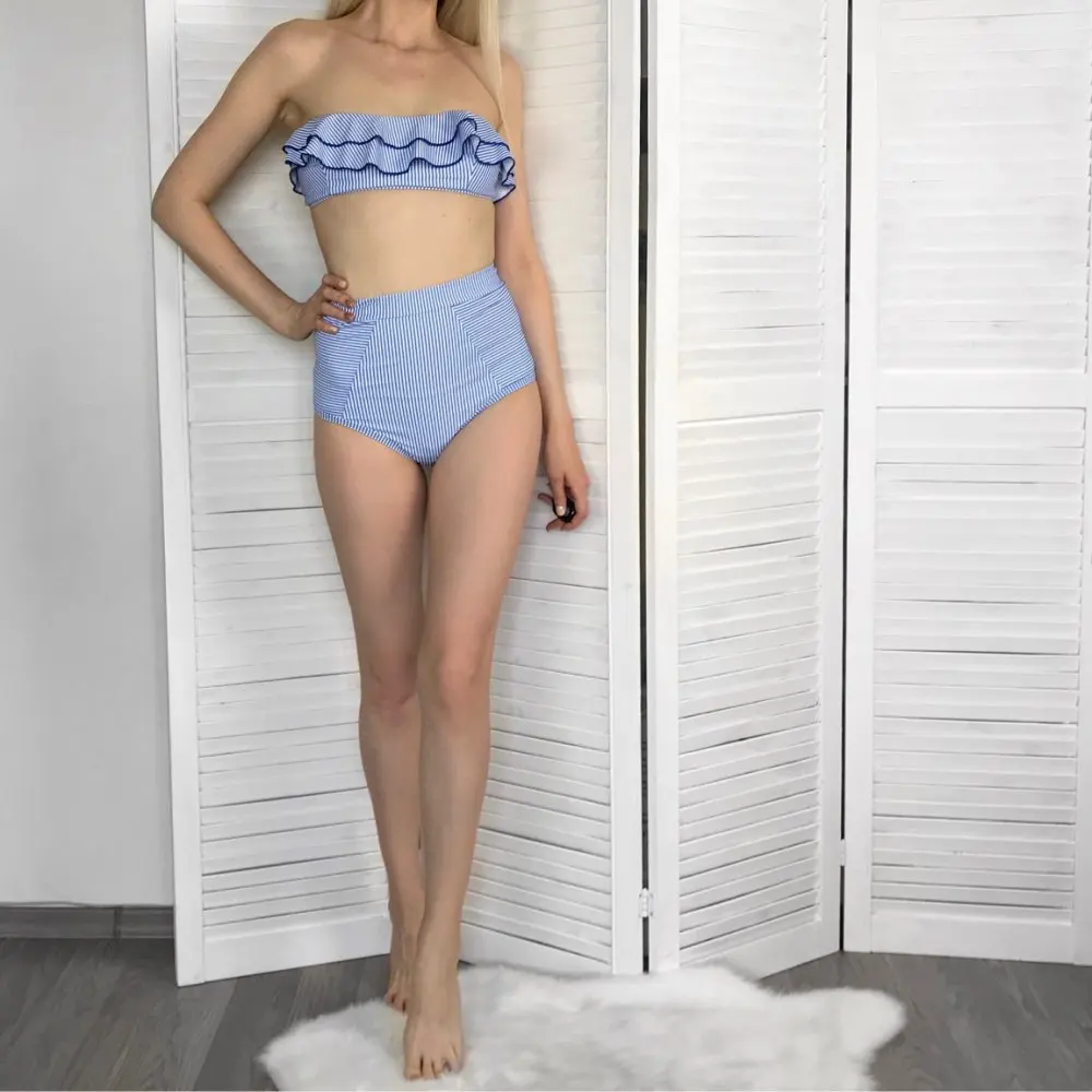 FREE SHIPPING High Waist Bikini Bandeau Swimwear Women Ruffle Swimsuit Striped Swimming Suit maillot de bain femme Summer biquini JKP2778
