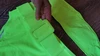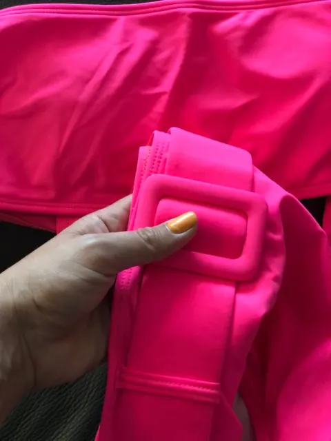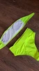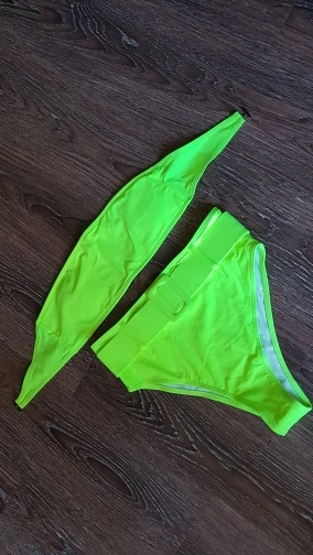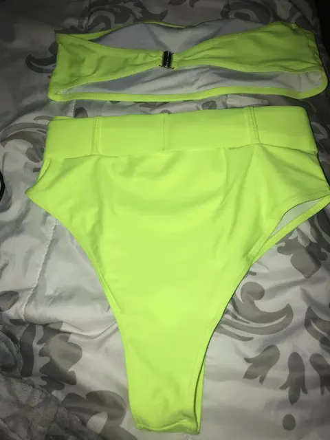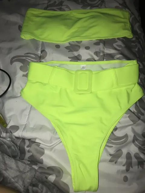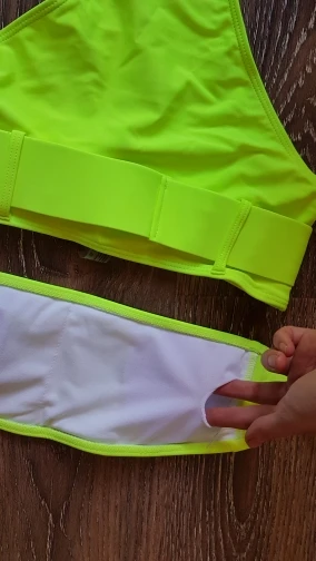 Shipped relatively fast. Very thick, high quality material. Comes with cups, able to take them out. VERY bright I love it. I got a size small and it fits be perfectly I weigh 127 and I’m 5ft 3inches. In certain lighting looks yellow and sometimes lime neon green.