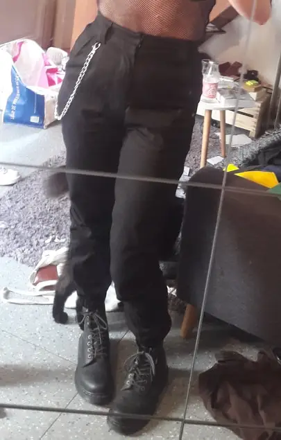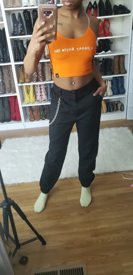 these pants are great, there is a slight smell that the store messaged me about, the smell comes off with a wash though. the chain is cute and edgy but doesn’t seem too sturdy so i wouldn’t recommend tugging on it. the pants are slightly longer than i expected and very high waisted. i am 5ft2in/157cm and i ordered a small. it fits around my waist nicely (my waist size is 23/24in) it’s a little loose but there is elastic on the back. overall very nice and fast shipping.