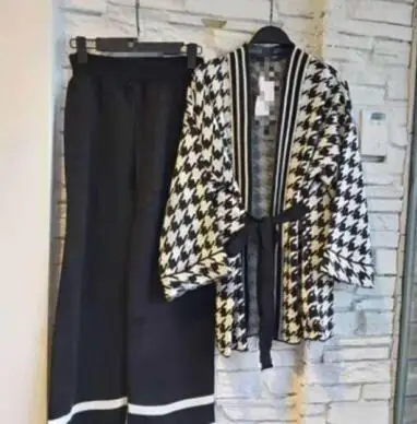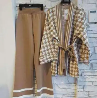 FREE SHIPPING Houndstooth Lace Up Knitted Cardigan Jacket And Wide Leg Pants Sets JKP4853