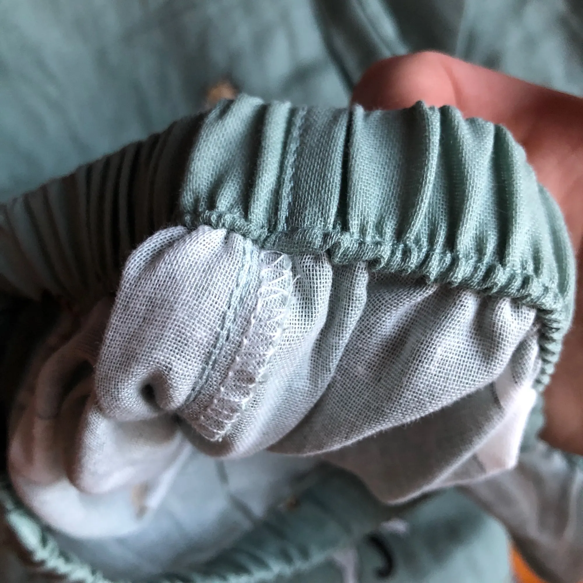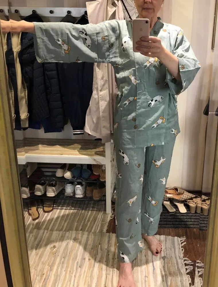 Delivery of 11 days to Pyaterochka. After washing, the fabric became "Gum", like muslin. The fabric is very pleasant to the body, the length of the sleeve is perfect, you do not have to roll up. Knees with time, probably, will stretch out or will get out. Pajamas are very like, I wear at home with pleasure. At 80-70-92 it would be possible to take L, but also M sits well. I think it will suit both pregnant and lactating mothers.