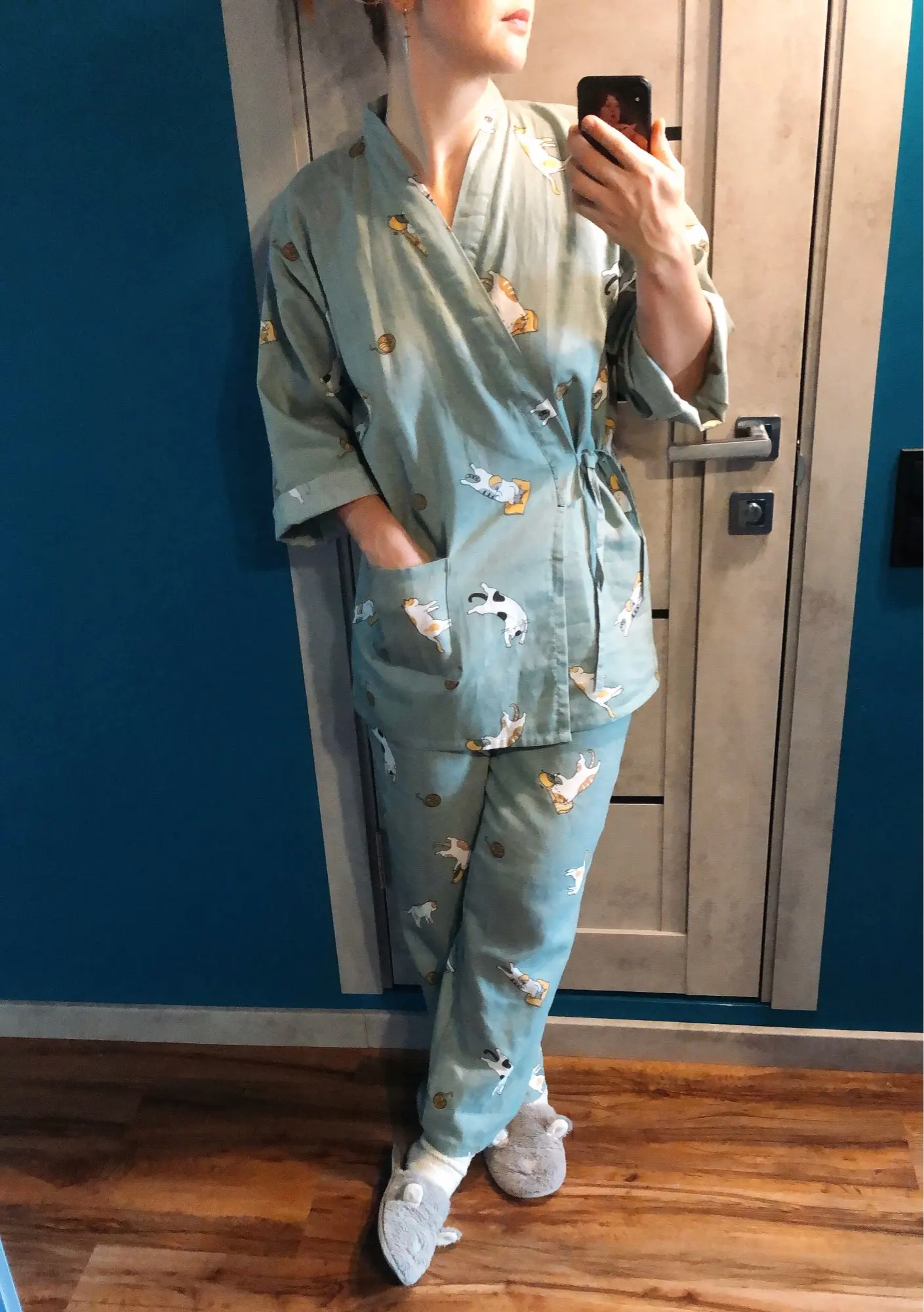 How cute pajamas cotton 100% weightless and at the same time it is warm and comfortable for me. On my parameters 105 х90х100 sat well. The picture is clear, the sleeves are 3/4, the pants are of good length to my height 172 cm. Delivery to Nizhny Novgorod 10 days