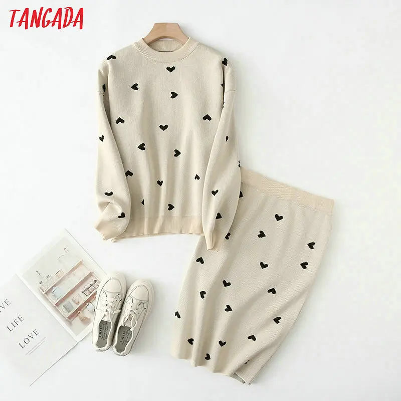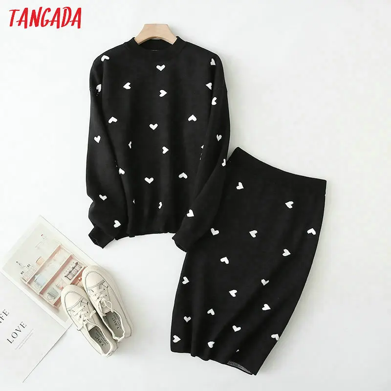FREE SHIPPING korea chic heart pattern knitted suit women skirt set autumn winter knitted suit 2 piece set sweet top and skirt JKP2259