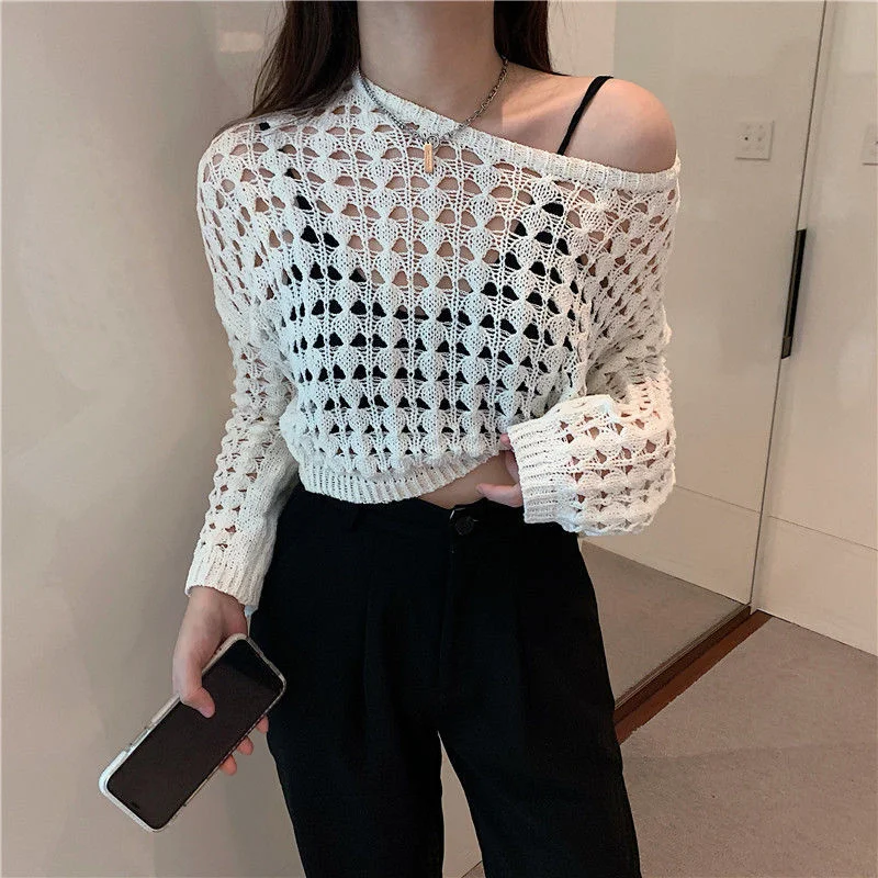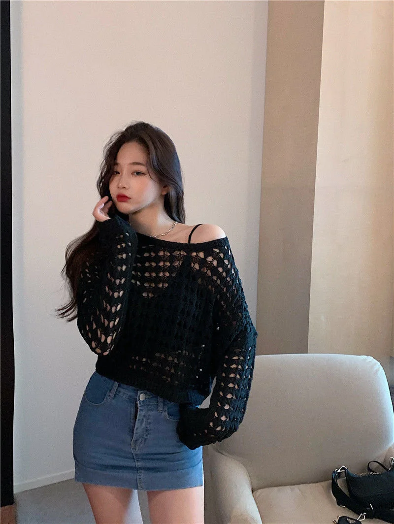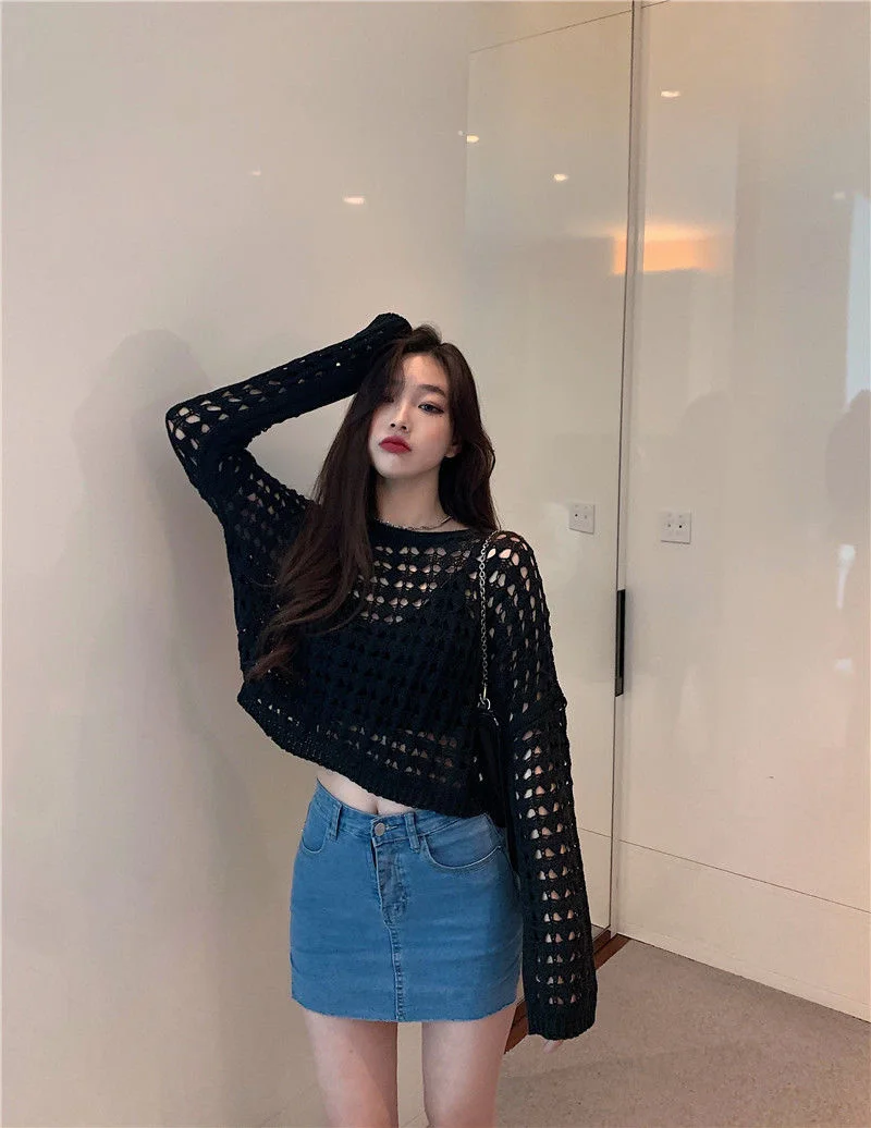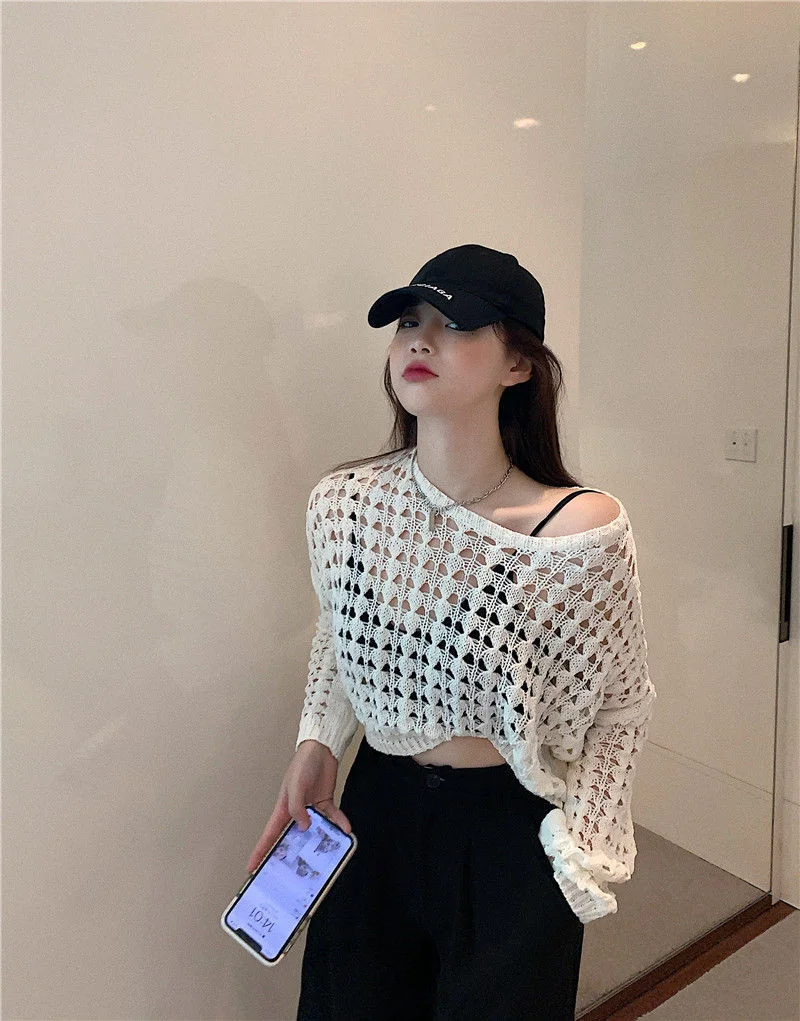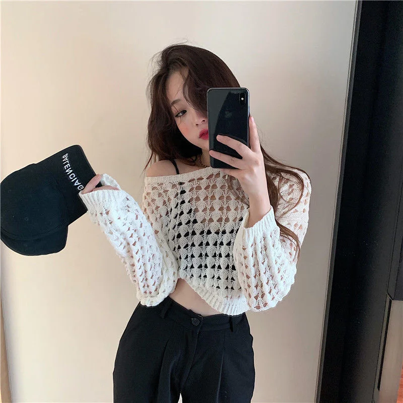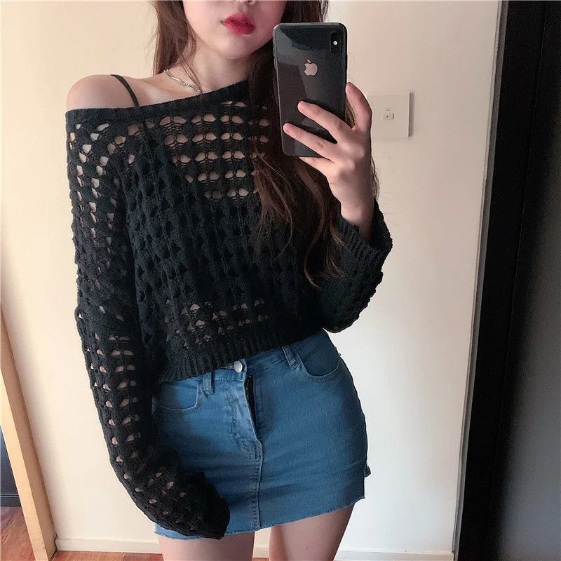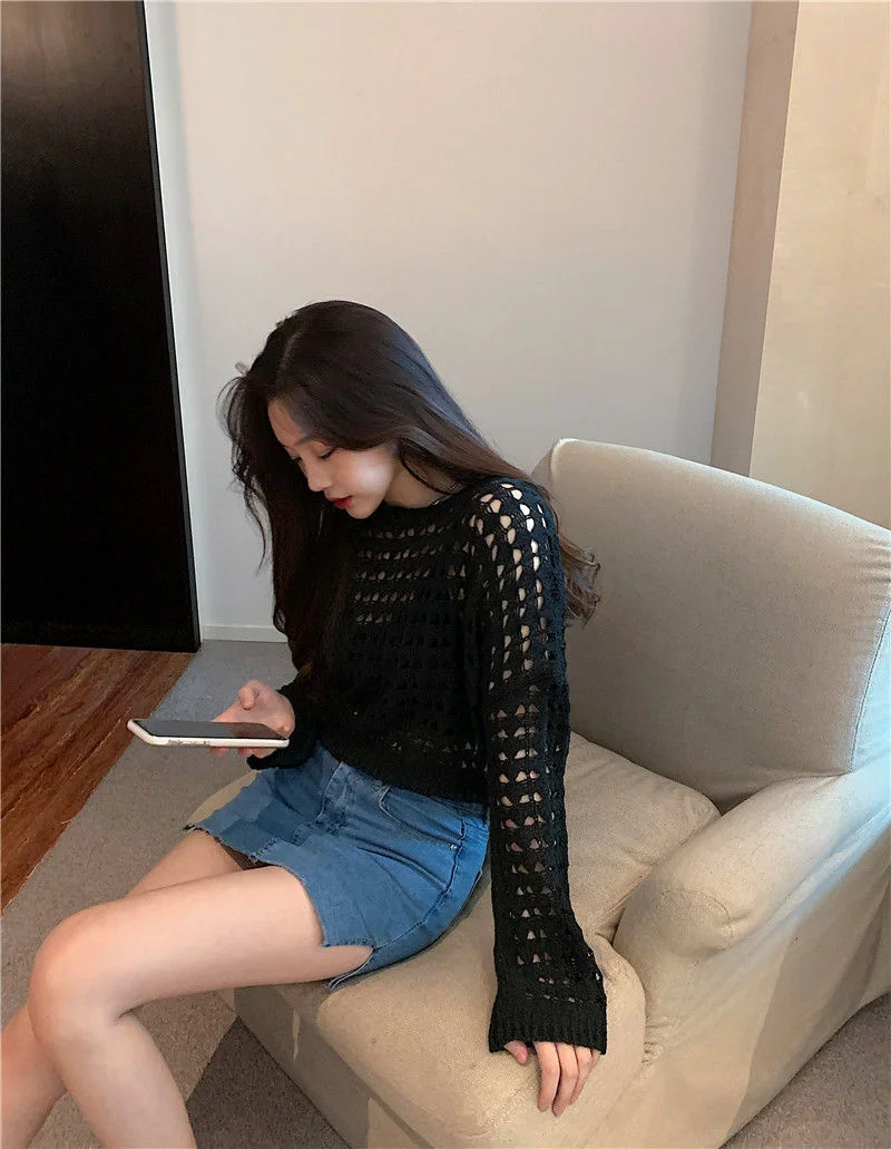 FREE SHIPPING Korean Fashion Women Hollow Knit Sweater Long Sleeved Fishing Net Top JKP7213