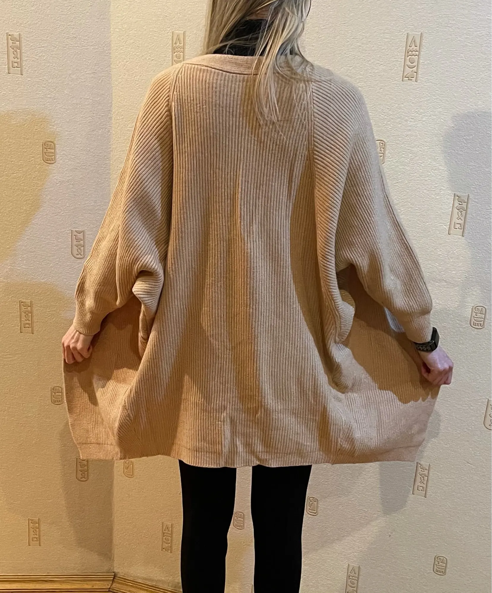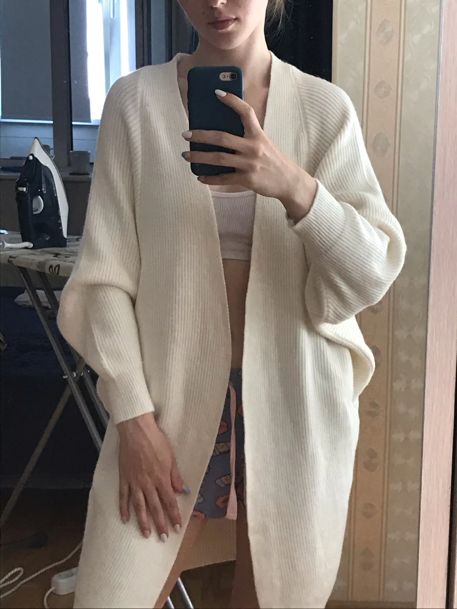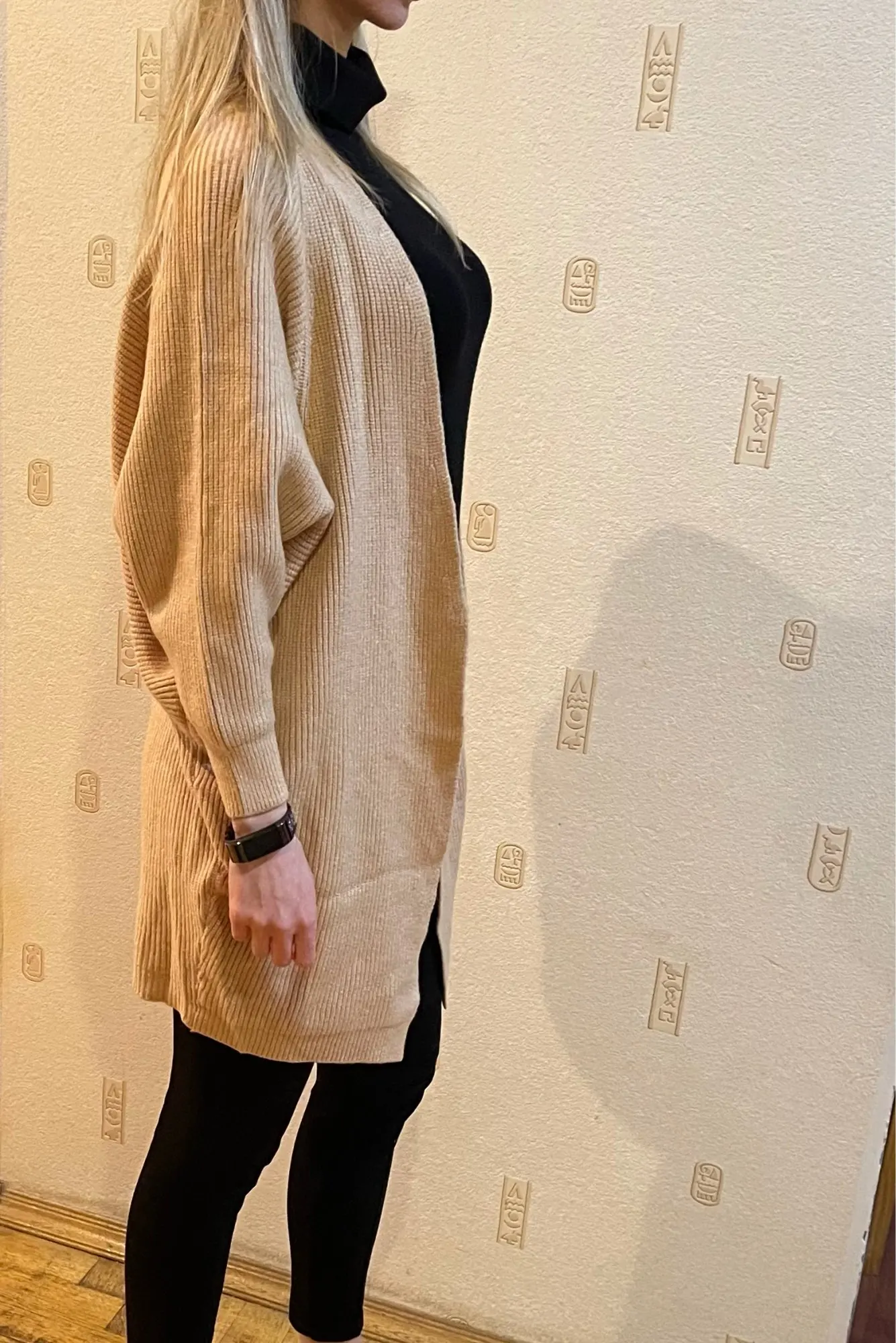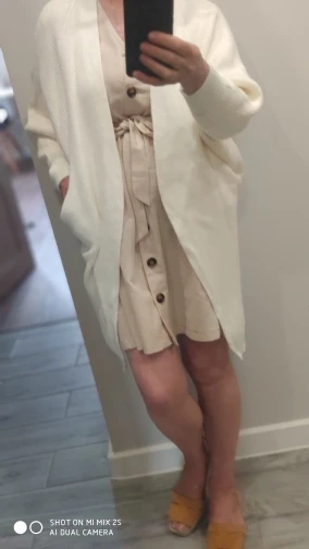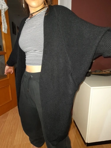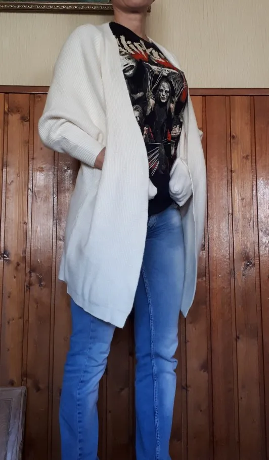 Great cardigans. I already have several colors. To sit a little oversize, I buy on parameters 92x70x95 cm, height 162 cm, weight 55 kg always in size L.
