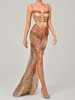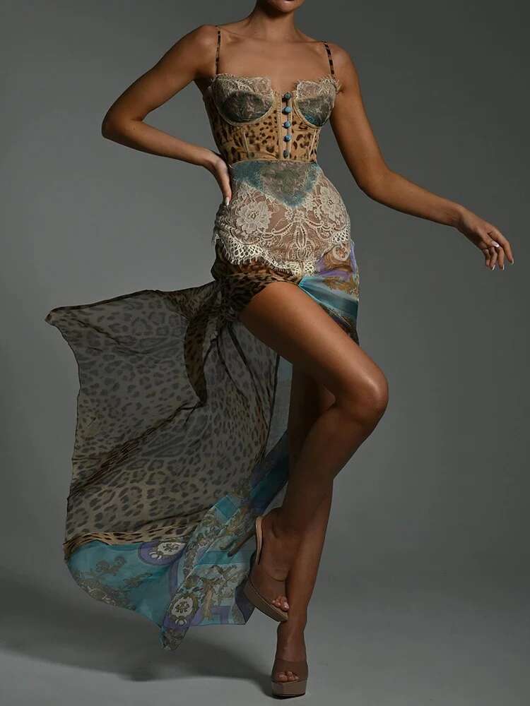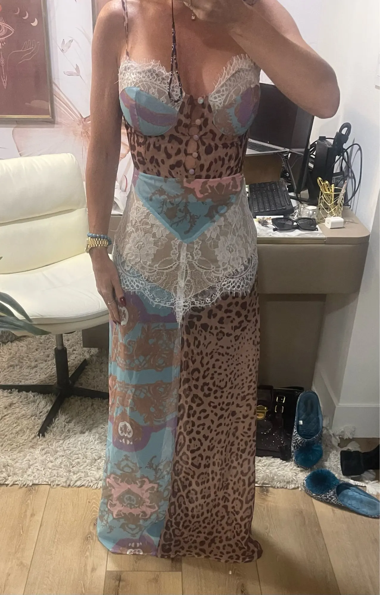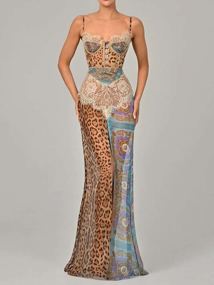 FREE SHIPPING Lace And Leopard Print Maxi Dress Sexy Sheer Mixed Pattern Gown JKP7311