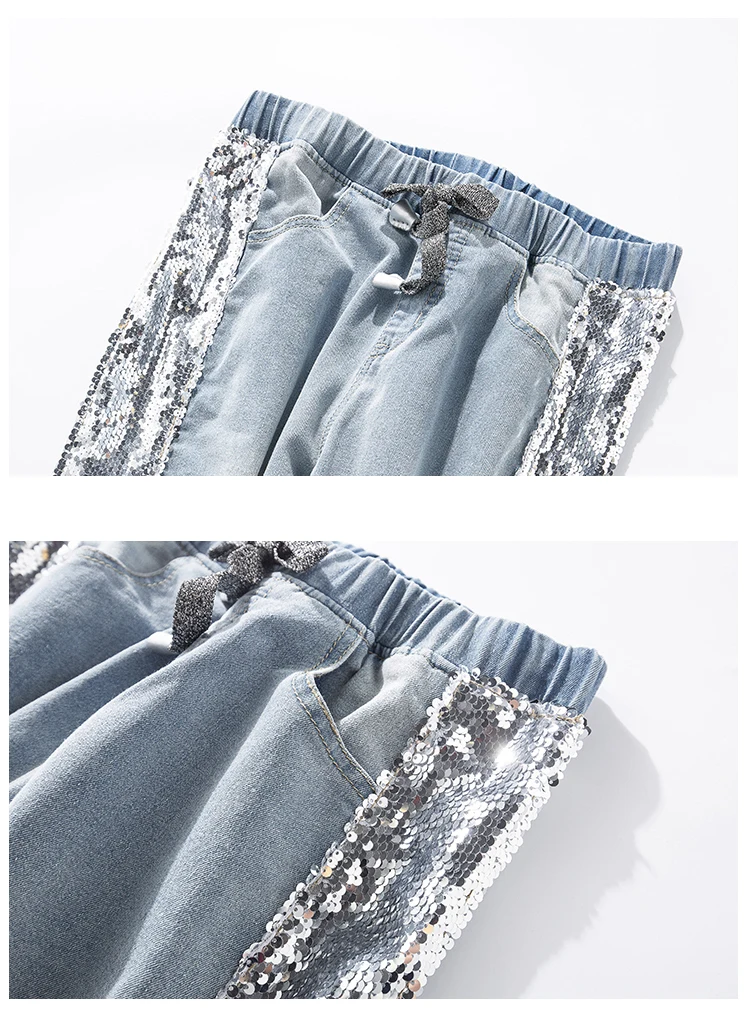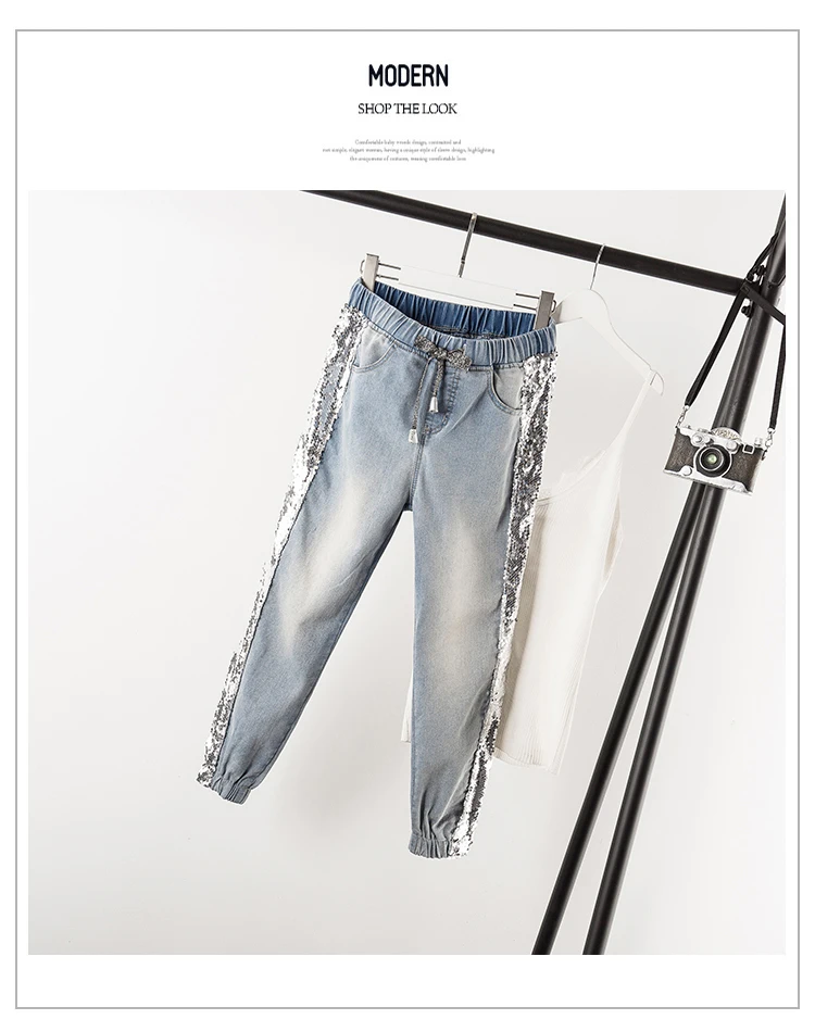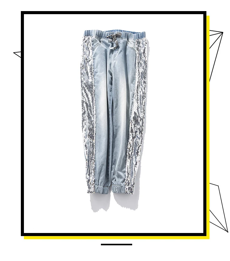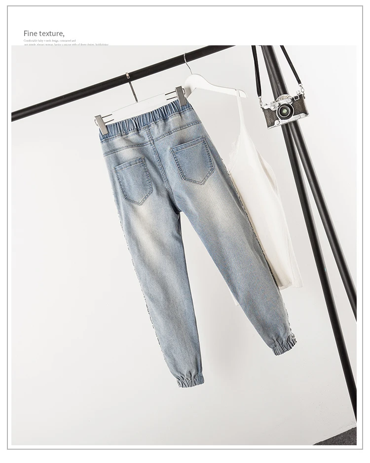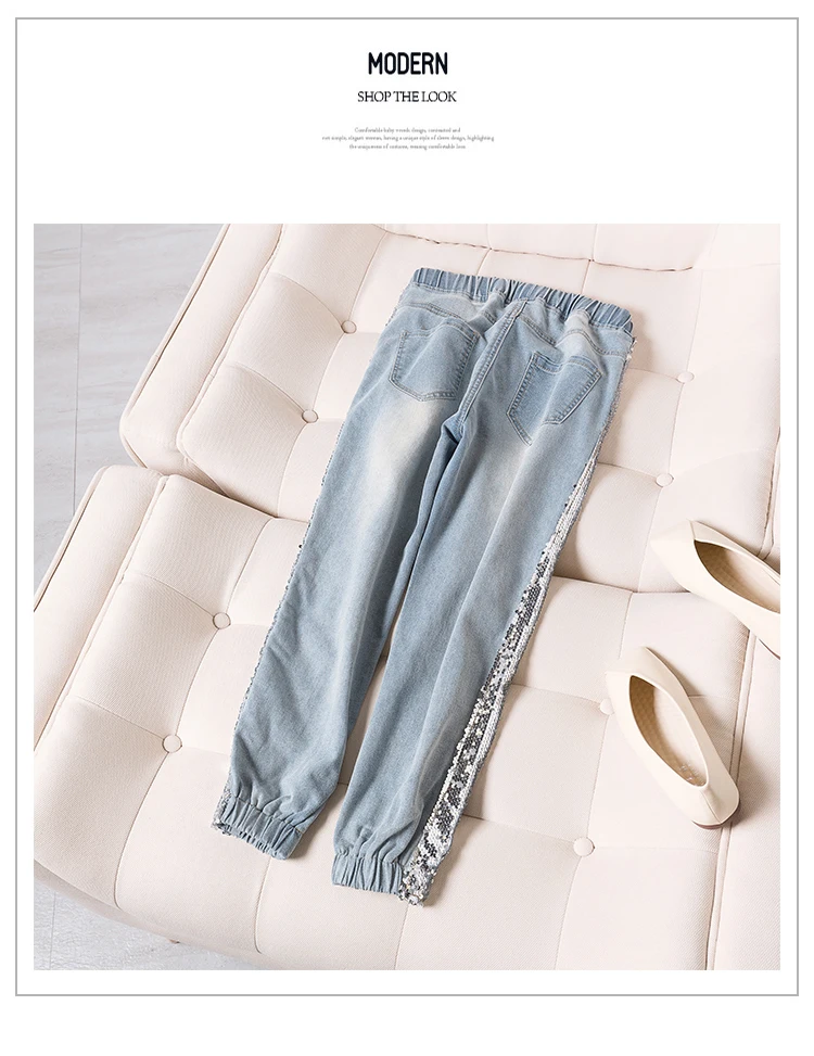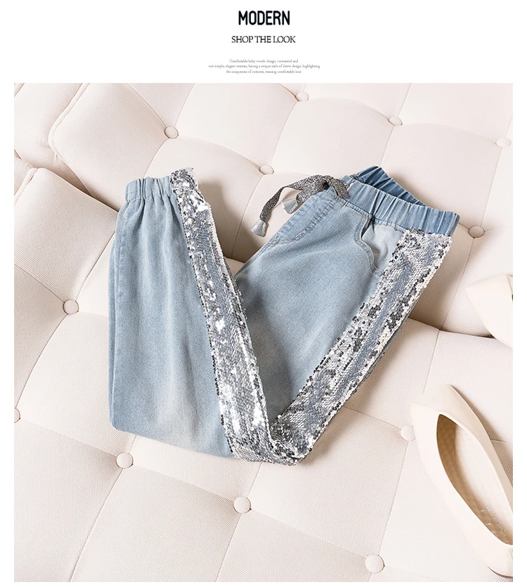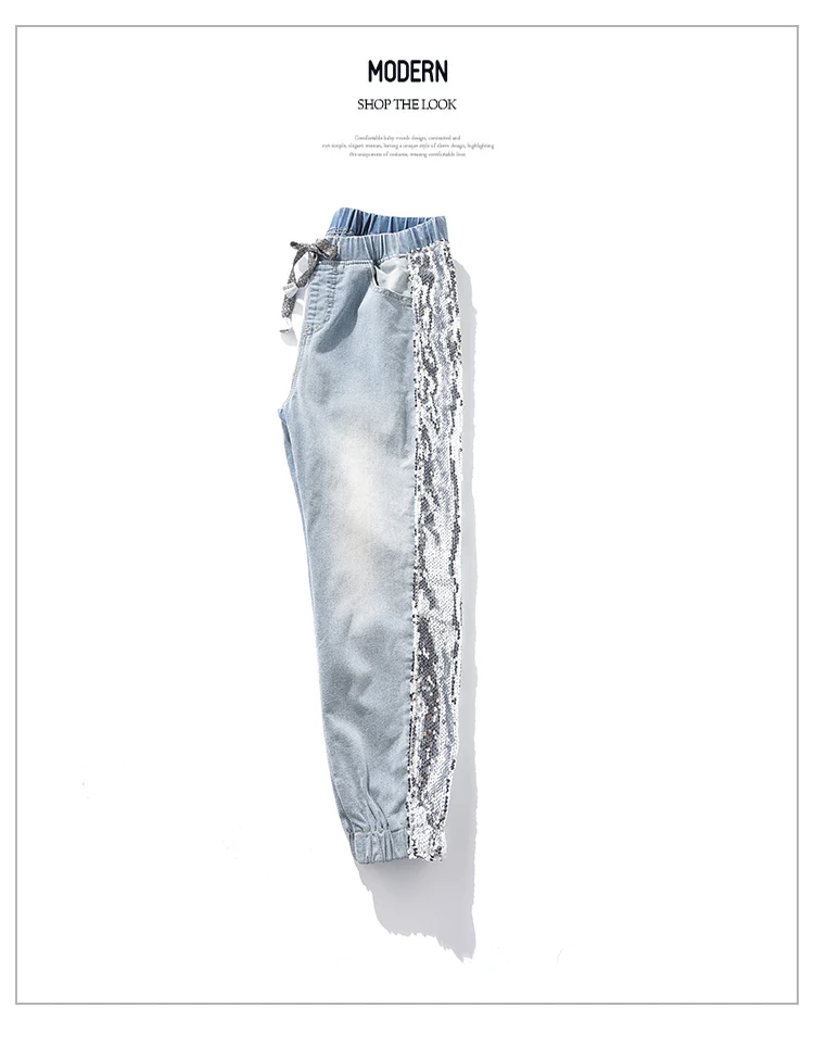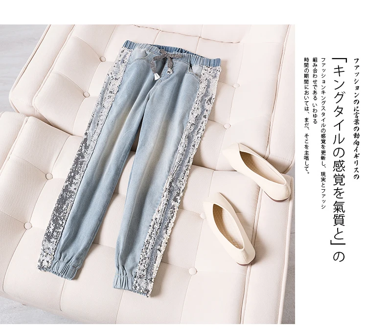 FREE SHIPPING Largesize 5xl Patchwork Sequined Jeans Women Washed Denim Trouser Jeans Female Elastic Waist Cargo Pants Side Striped Jeans JKP1936