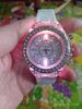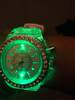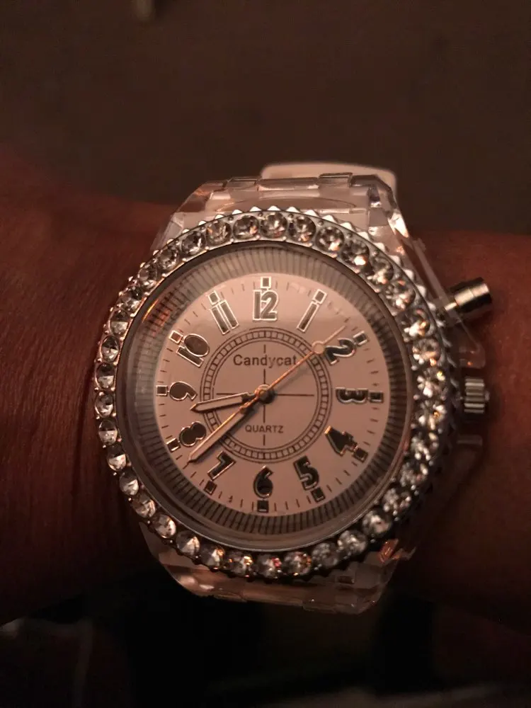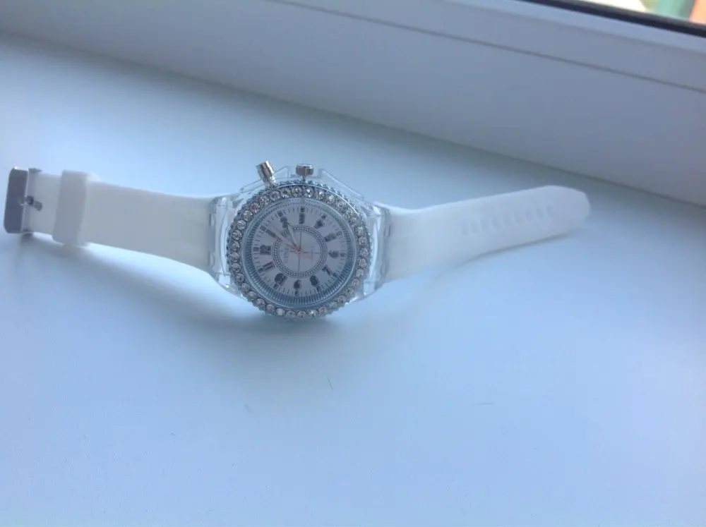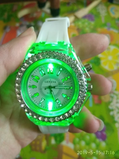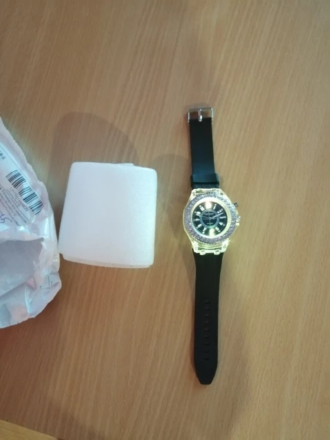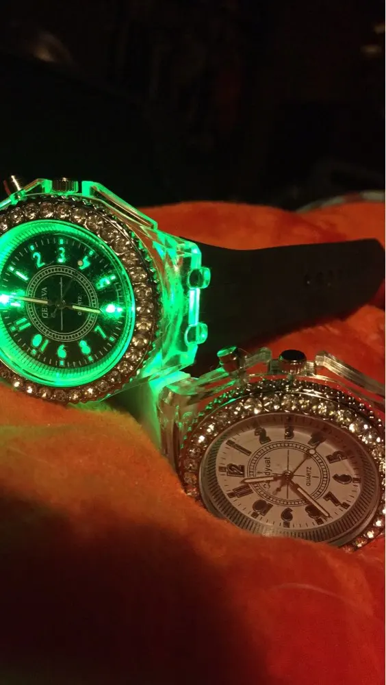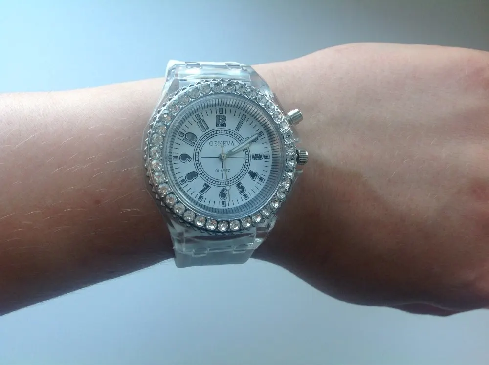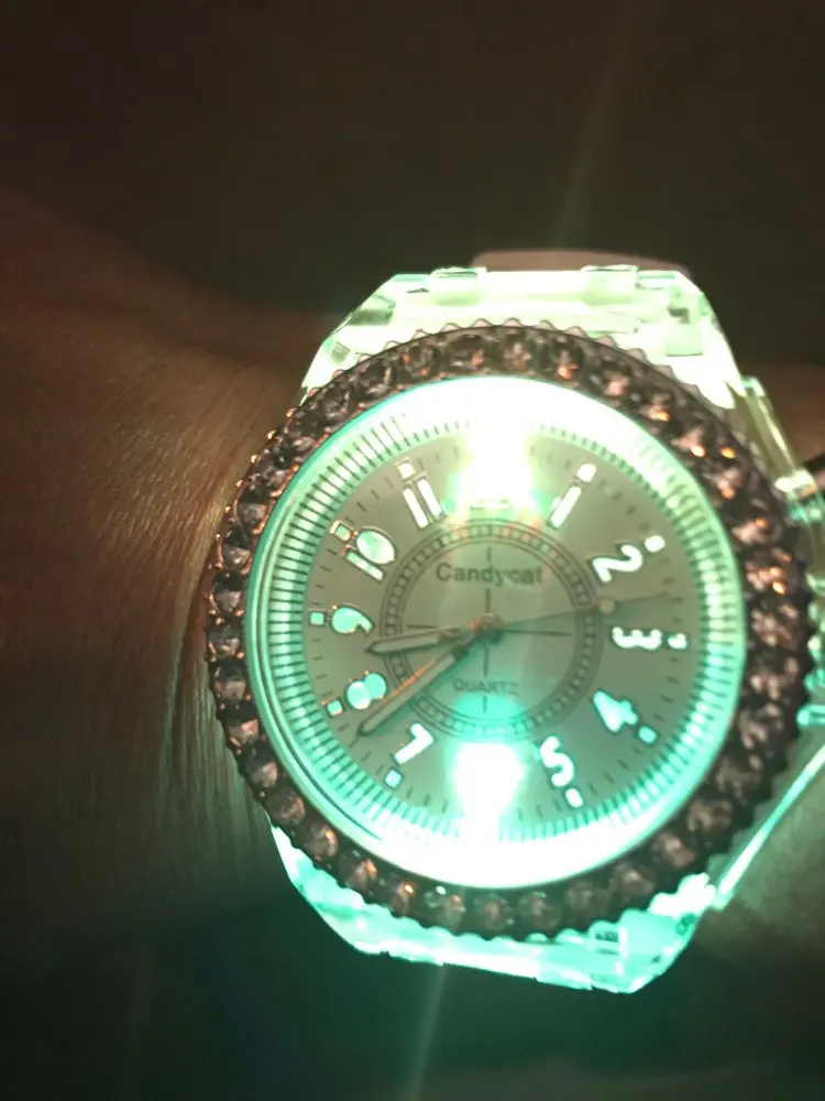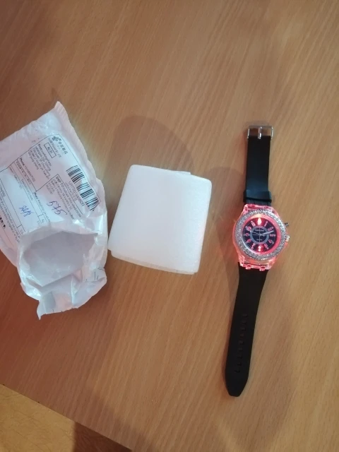 Everything corresponds to the description, glows and all strasses around the dial in place and are glued perfectly smoothly. Look very cute. Delivery is fast, to the moscow region the clock arrived in 14 days. I recommend the store, i will order more.