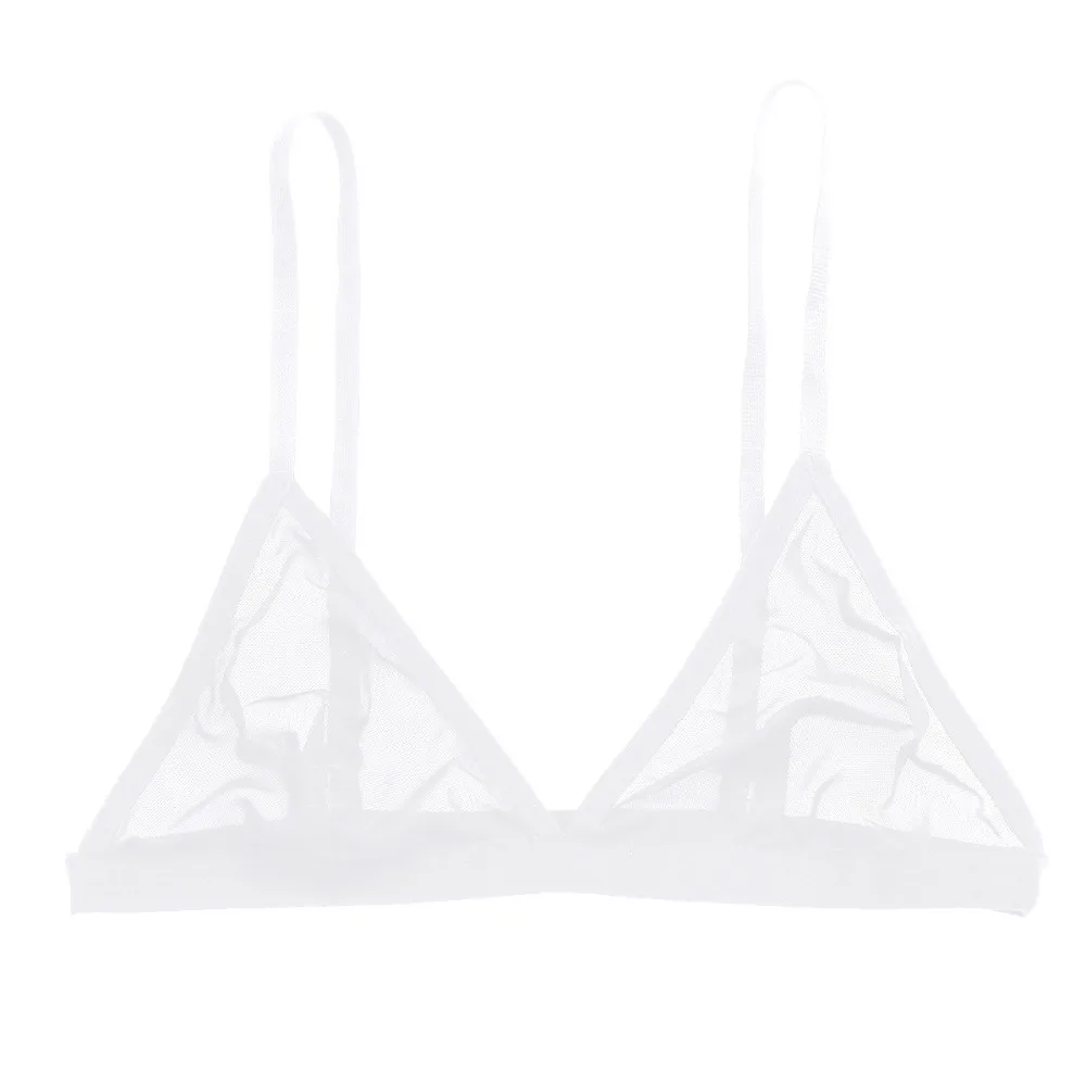Women’s sheer mesh bralette, unlined triangle cup, stretchy fabric.