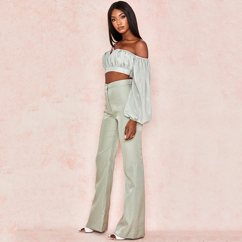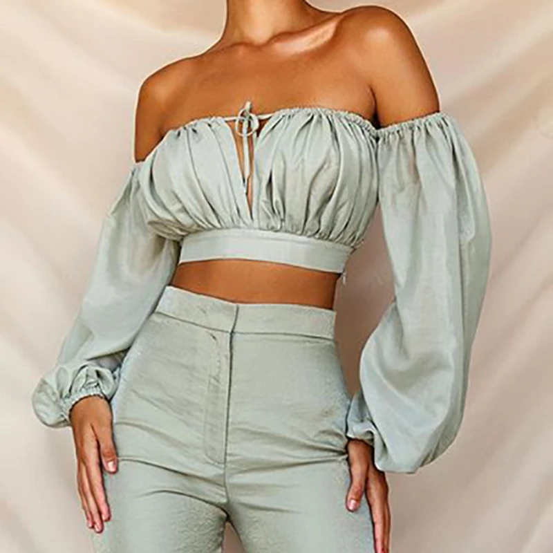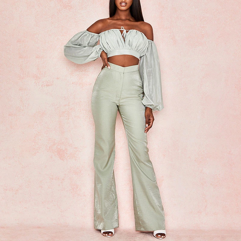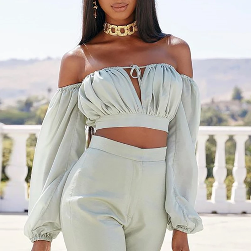 FREE SHIPPING Long Sleeve Off Shoulder Sexy Two Piece Set Bow Strapless Crop Top And Long Pants 2019 Summer 2 Piece Set Women Outfits JKP2537
