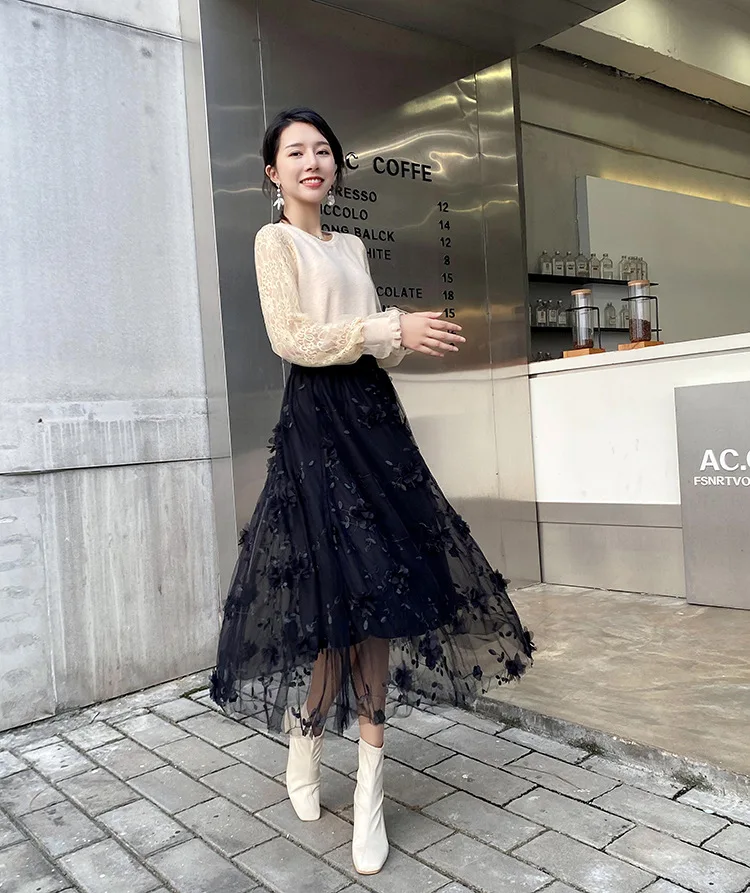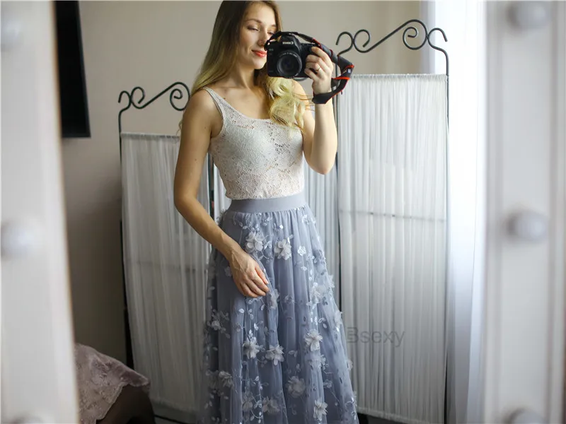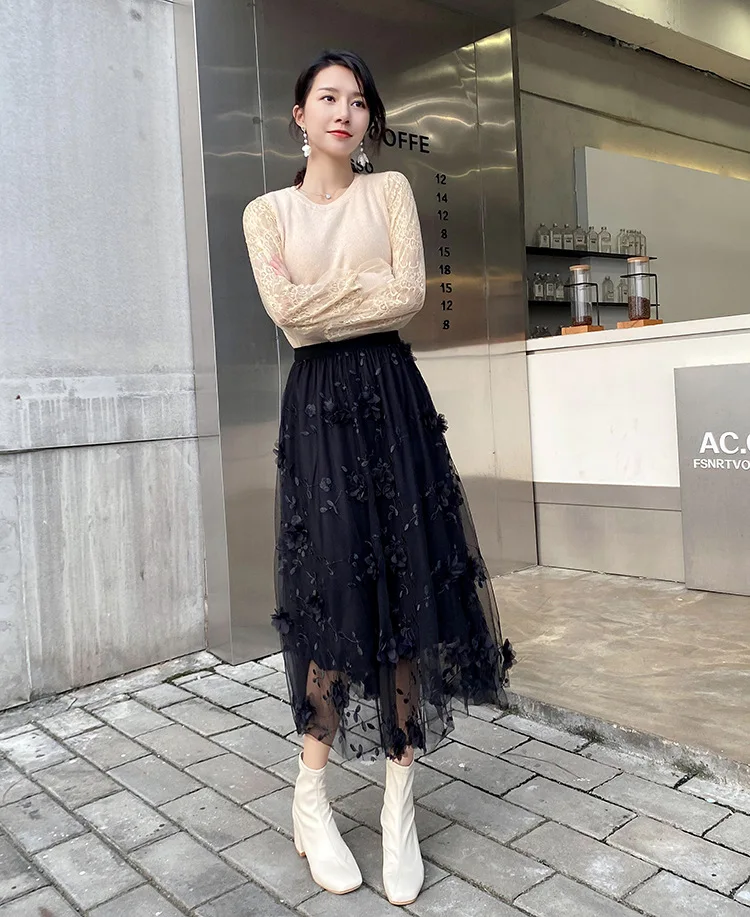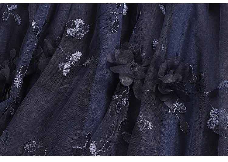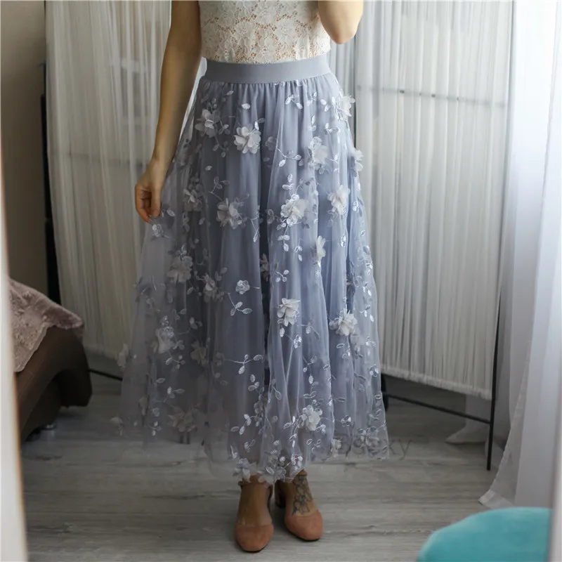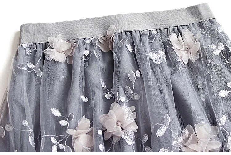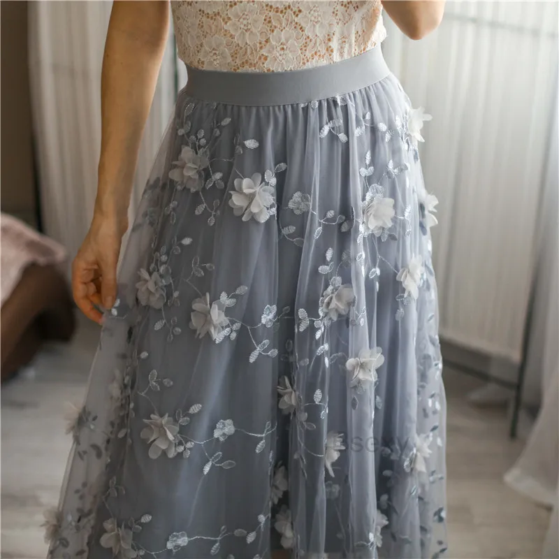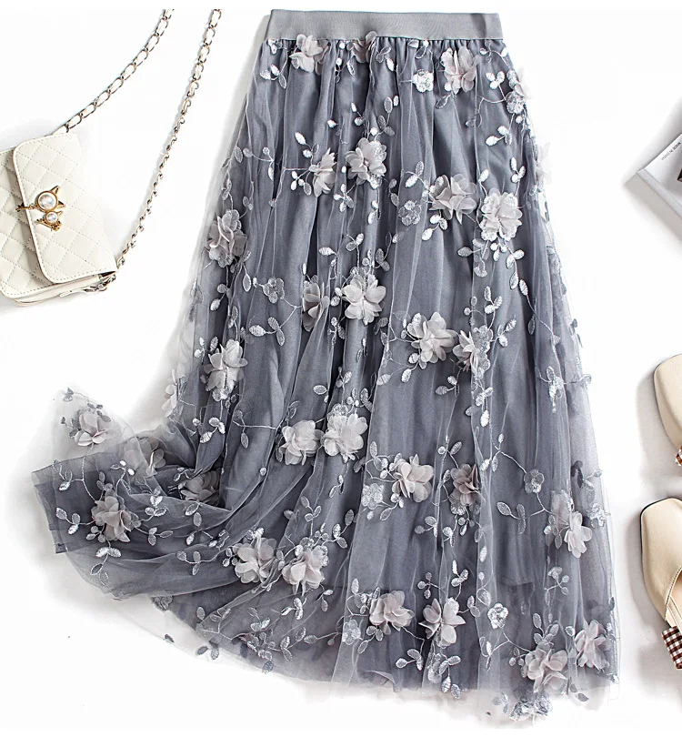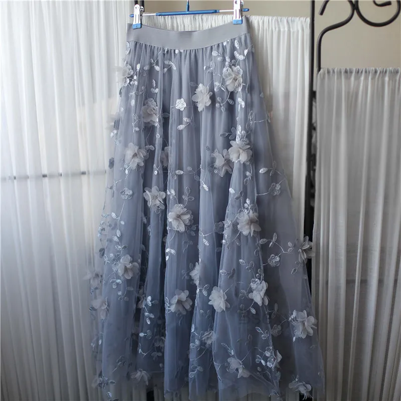 FREE SHIPPING Luxury Gown Skirt Embroidery Floral Mesh Elastic JKP5958
