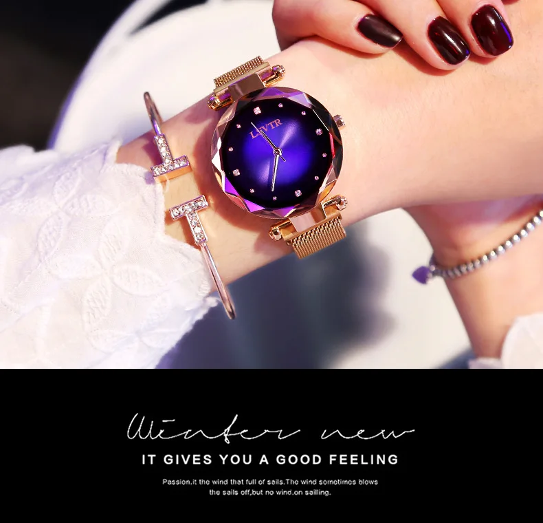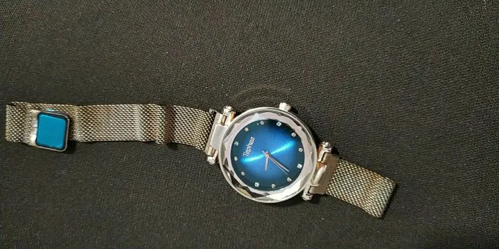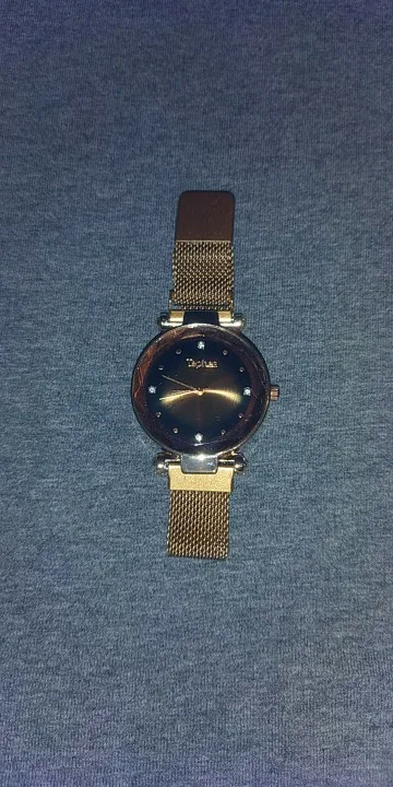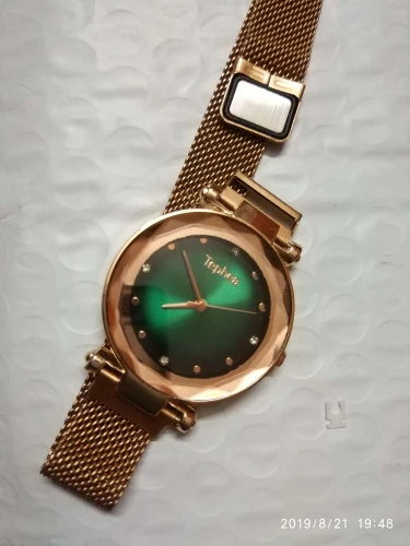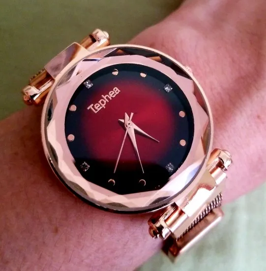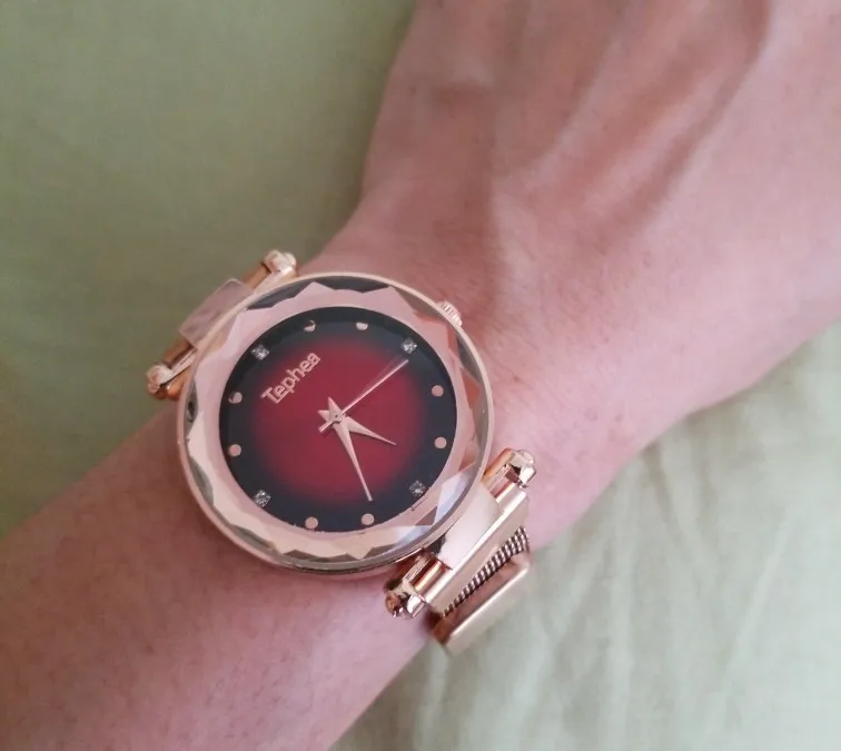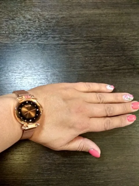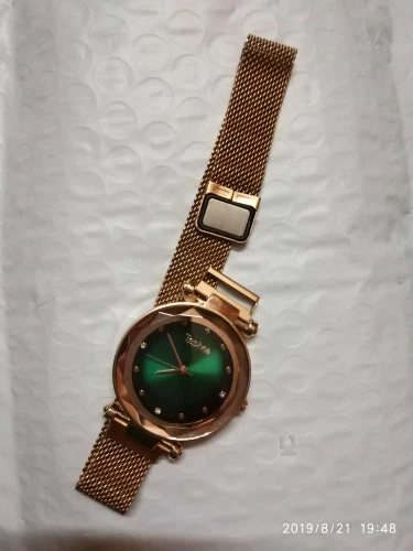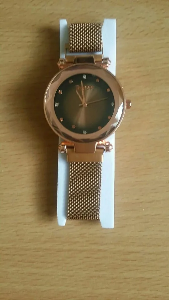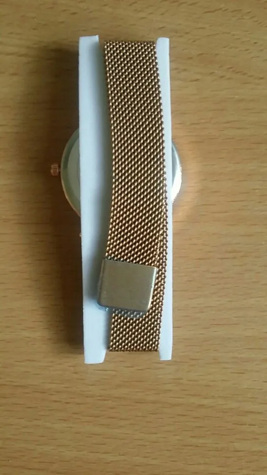 Delivered very quickly. 18 days. In mezhdurechensk. Simpotichnye watch. Bracelet color dark gold. The magnet holds tight, does not fly off.